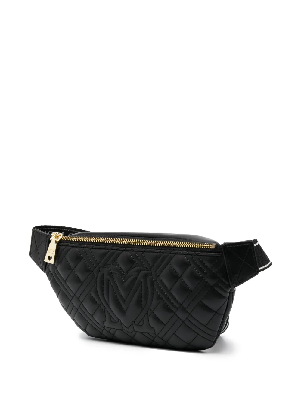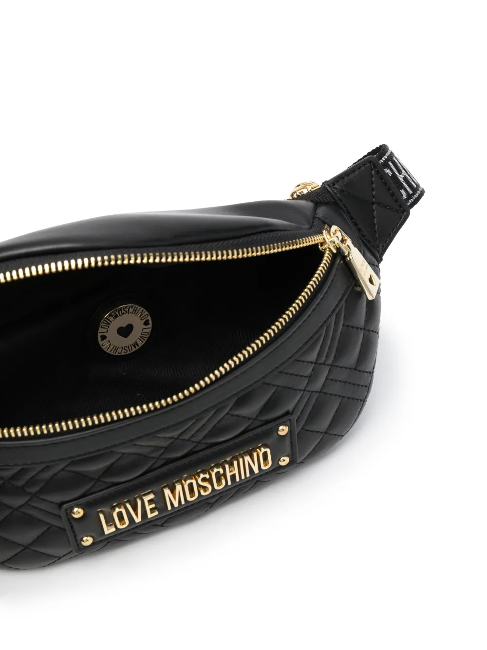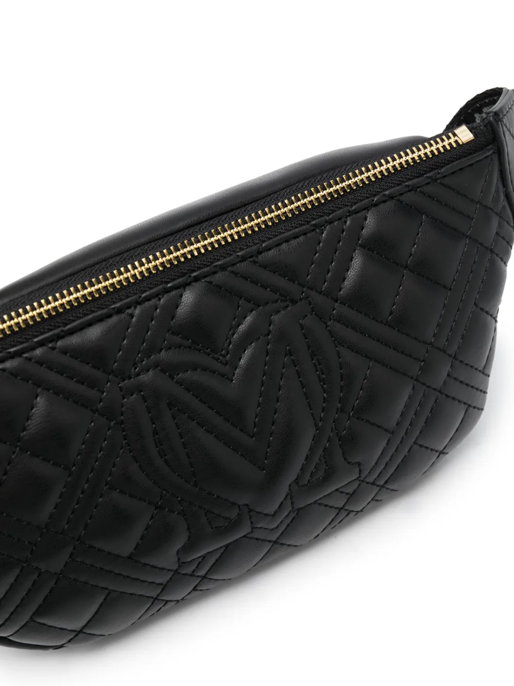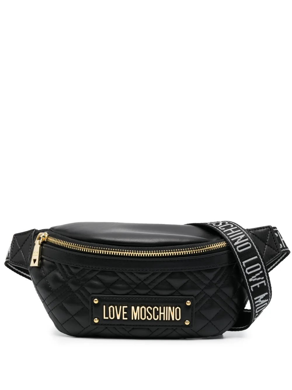 Nero, finitura imbottita, logo in lettere color oro, chiusura superiore con zip, chiusura posteriore con zip, tracolla regolabile e scomparto unico.
