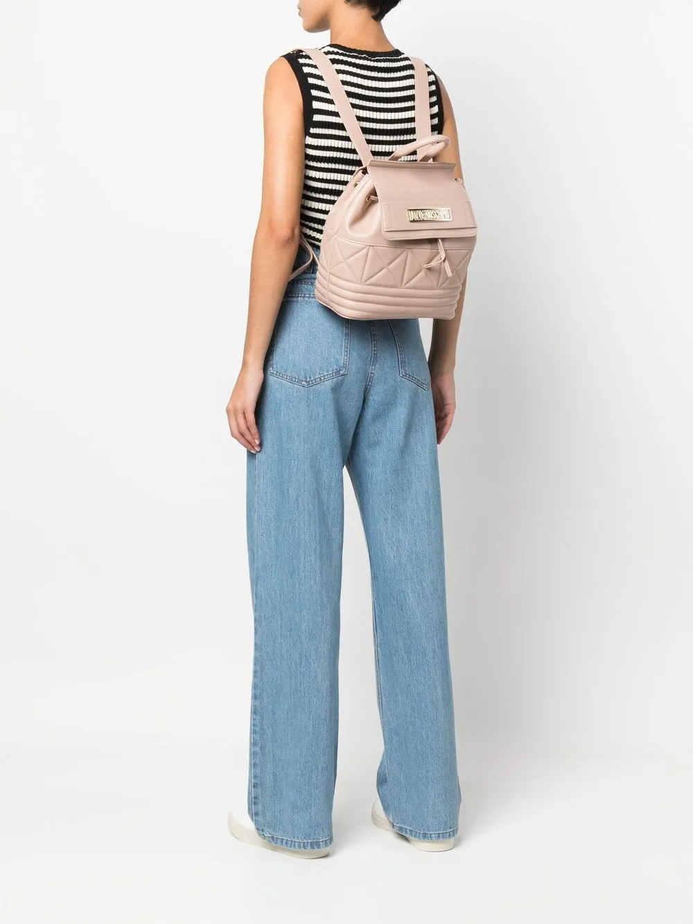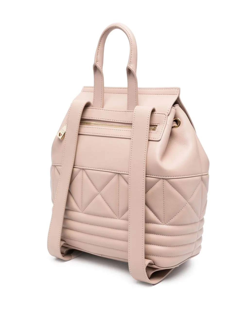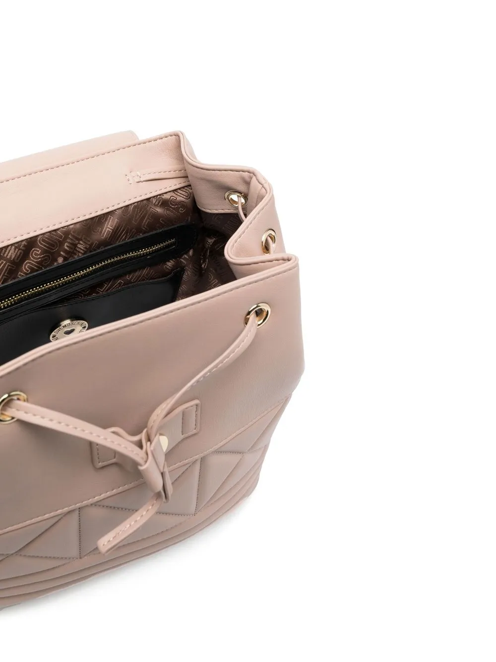 Beige blush, inserti imbottiti, placca con logo, dettaglio con occhiello metallico, due tracolle regolabili, manico tondo, battente nella parte superiore con chiusura magnetica, chiusura superiore a coulisse, scomparto unico, fodera con logo stampato e tasca interna con zip.