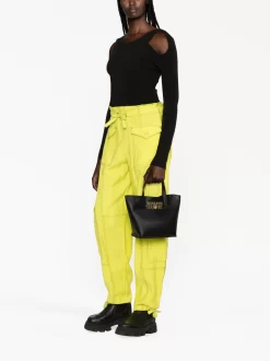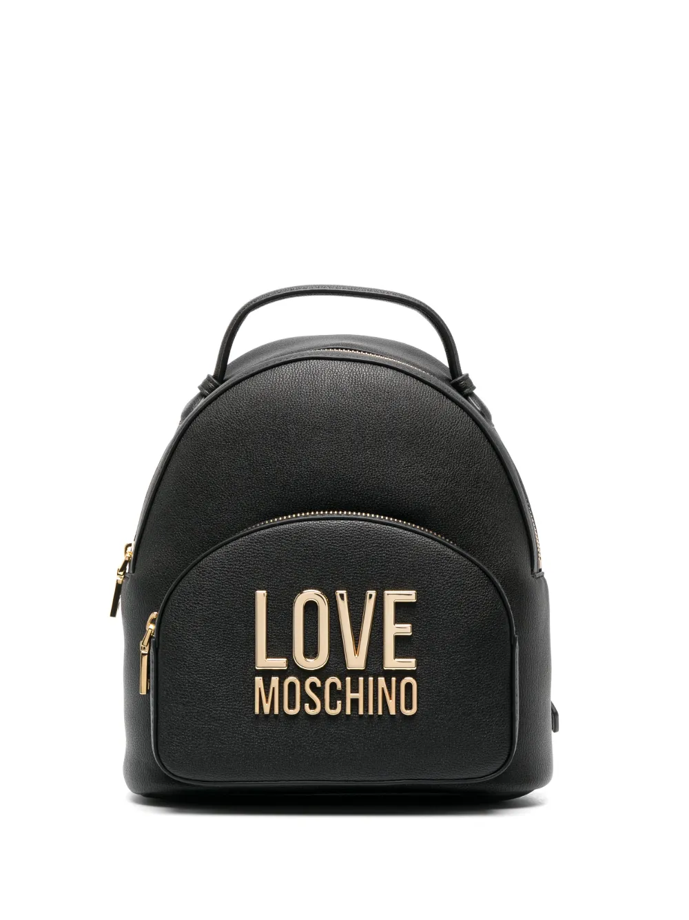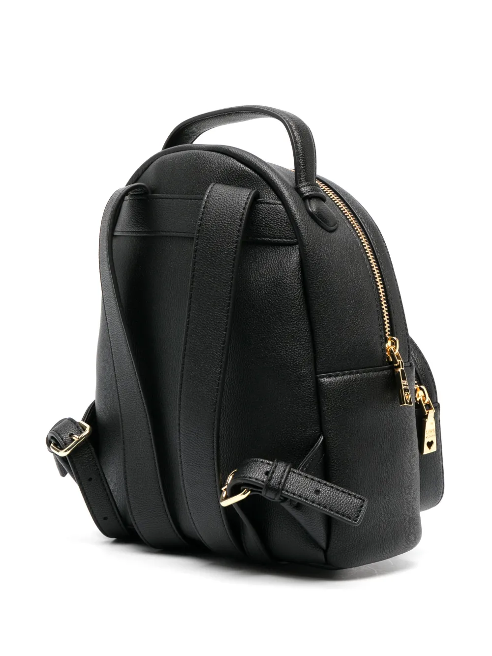 Nero, pelle cruelty-free, grana liscia, placca con logo color oro, chiusura superiore con zip, manico piatto, due tracolle regolabili, tasca a marsupio frontale con zip e scomparto unico.