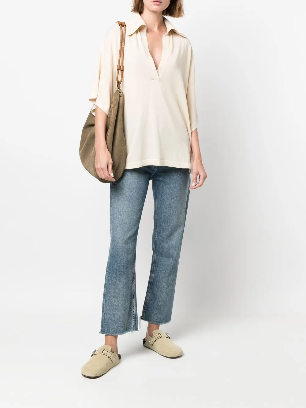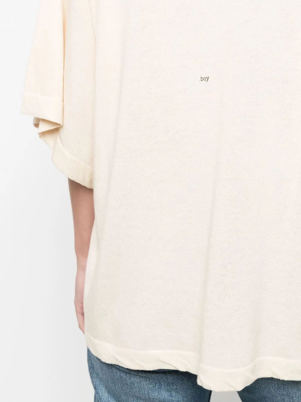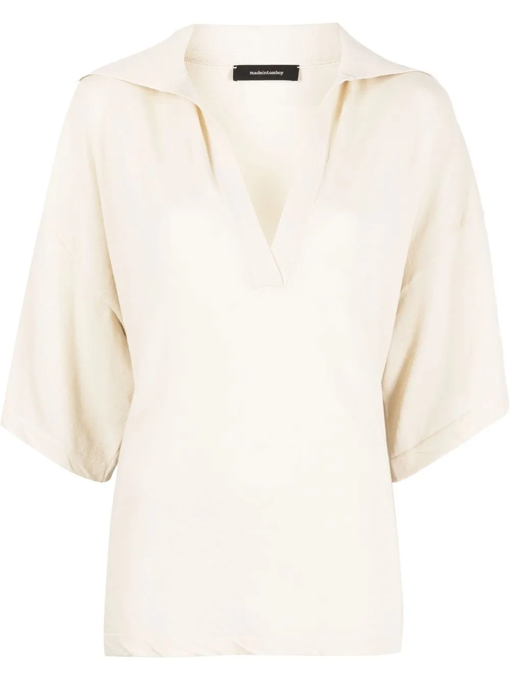 Maglia fine, logo ricamato nella parte posteriore, scollo profondo a V, colletto alla francese, maniche a spalla bassa, maniche corte e orlo dritto. Materiale: cotone.
