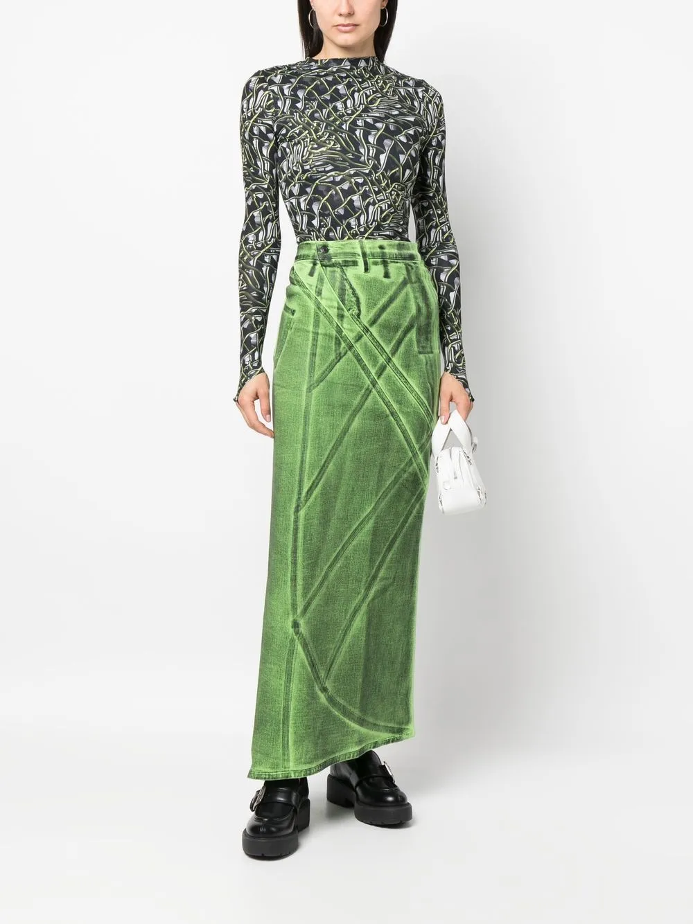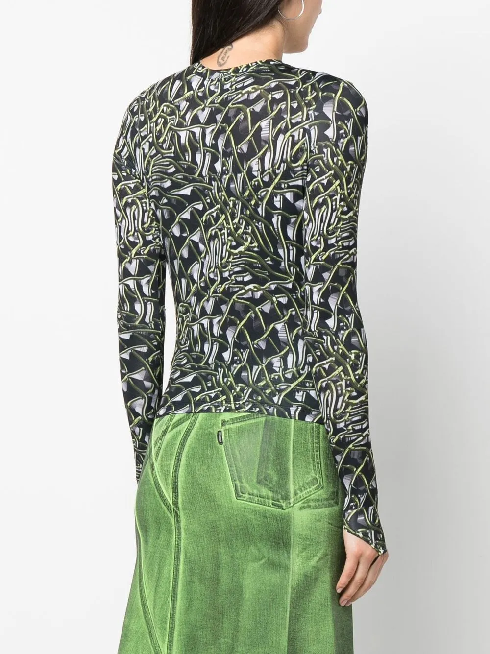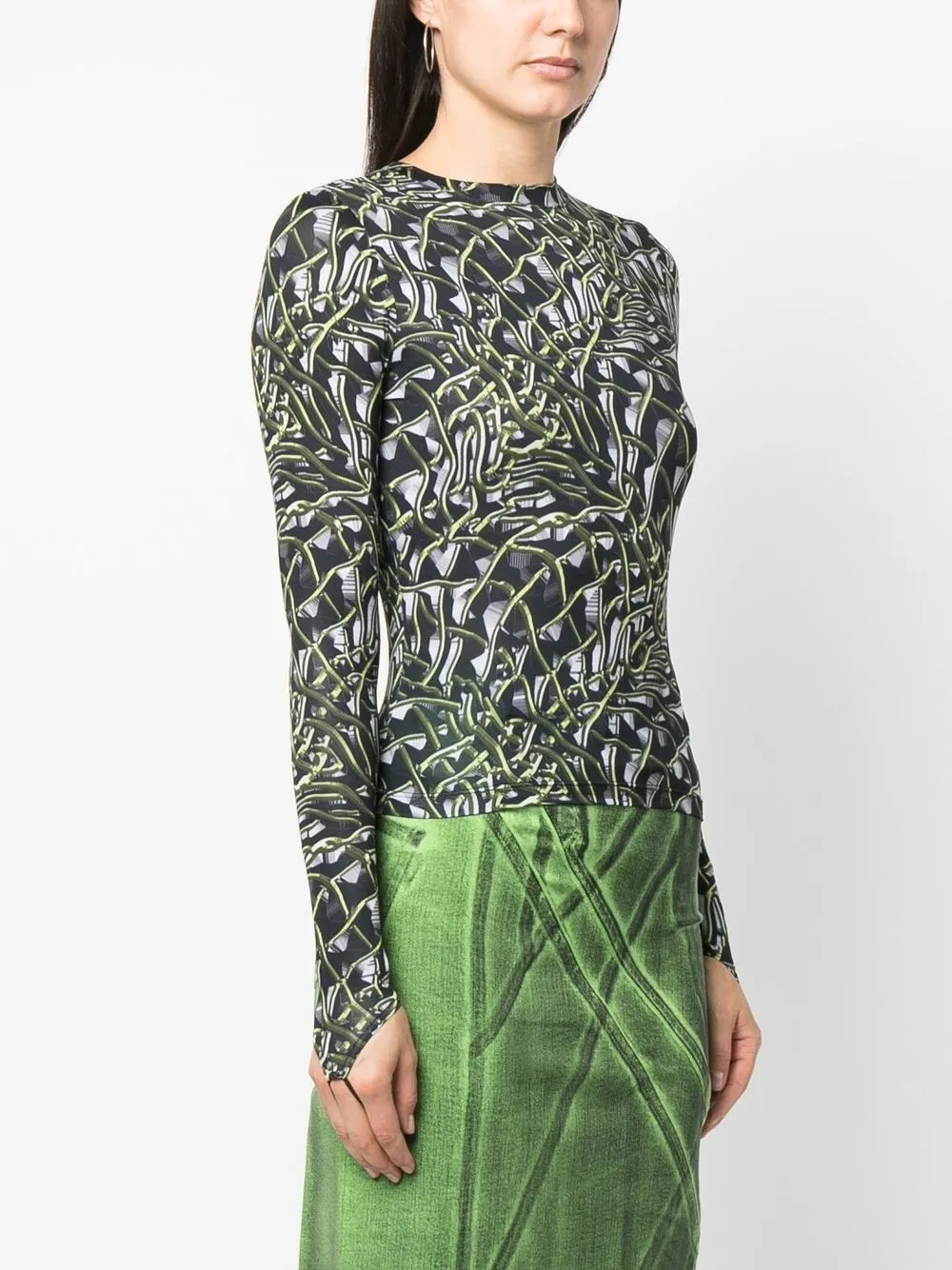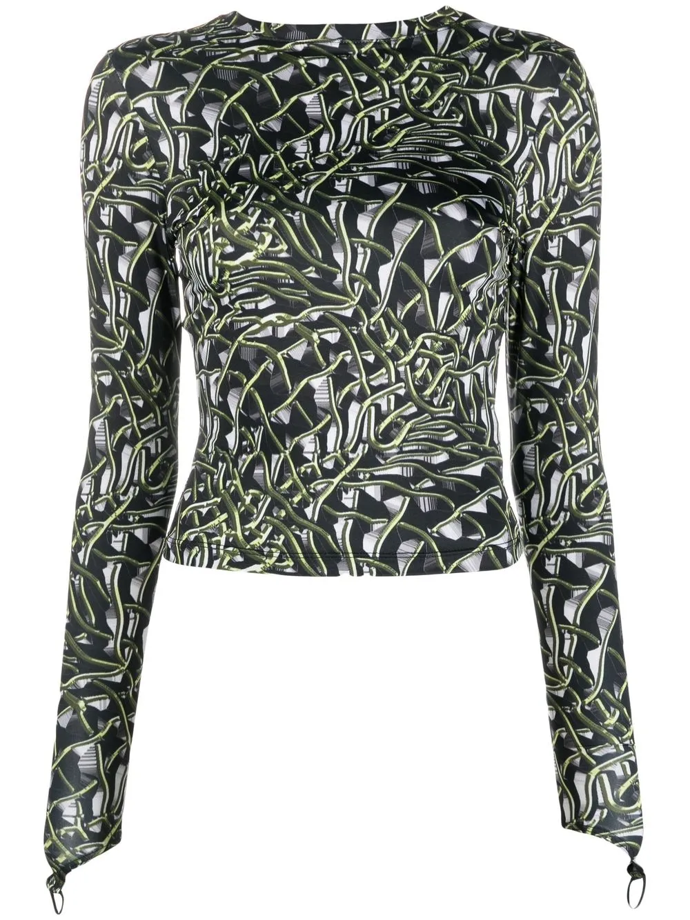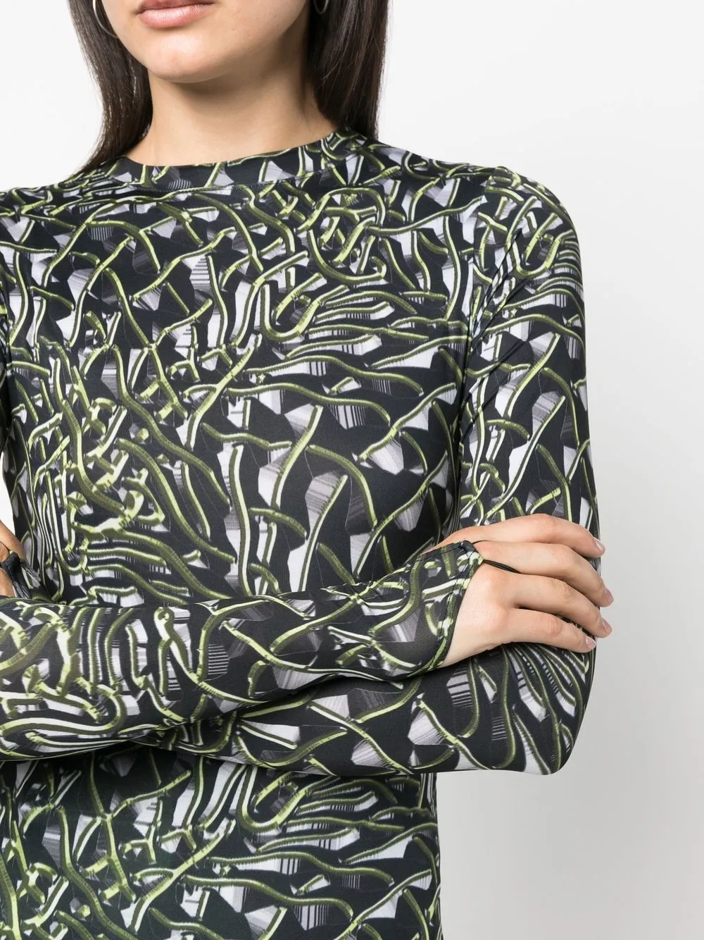 Nero/verde, design elasticizzato, fantasia astratta, scollo rotondo e maniche lunghe.
