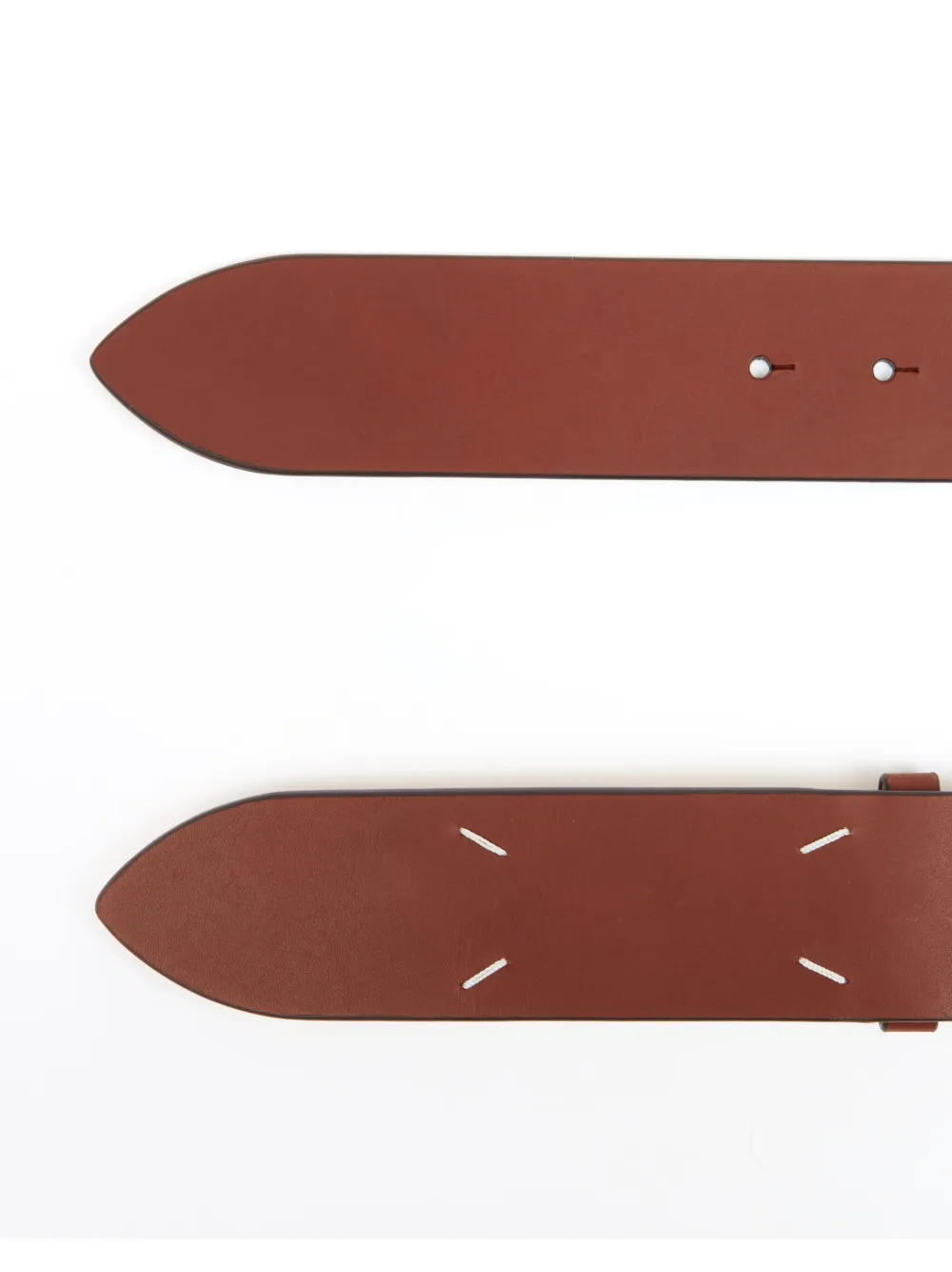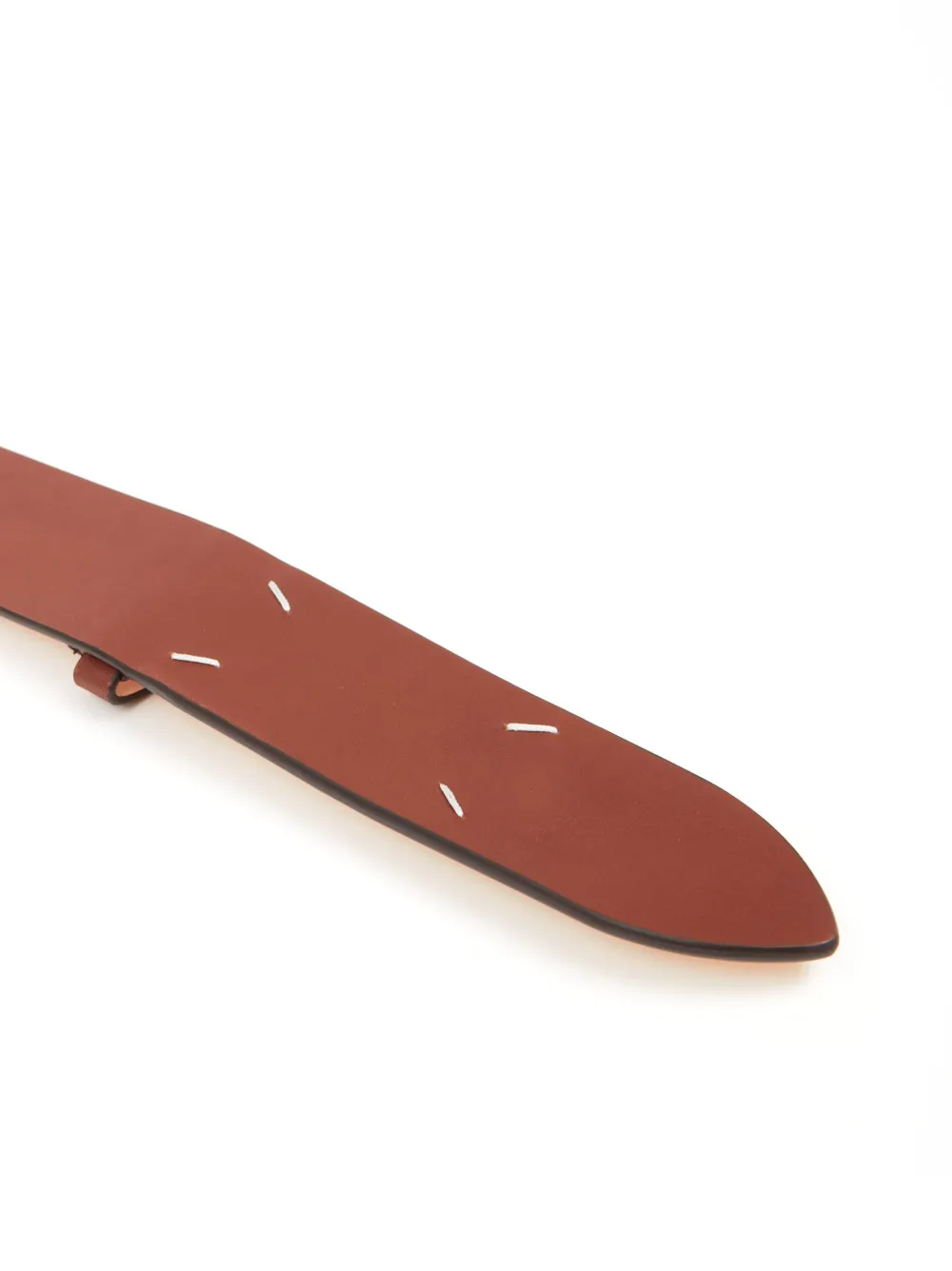 four-stitch logo leather belt from Maison Margiela featuring camel brown, leather, signature four-stitch logo, punched holes, pointed tip and adjustable fit.