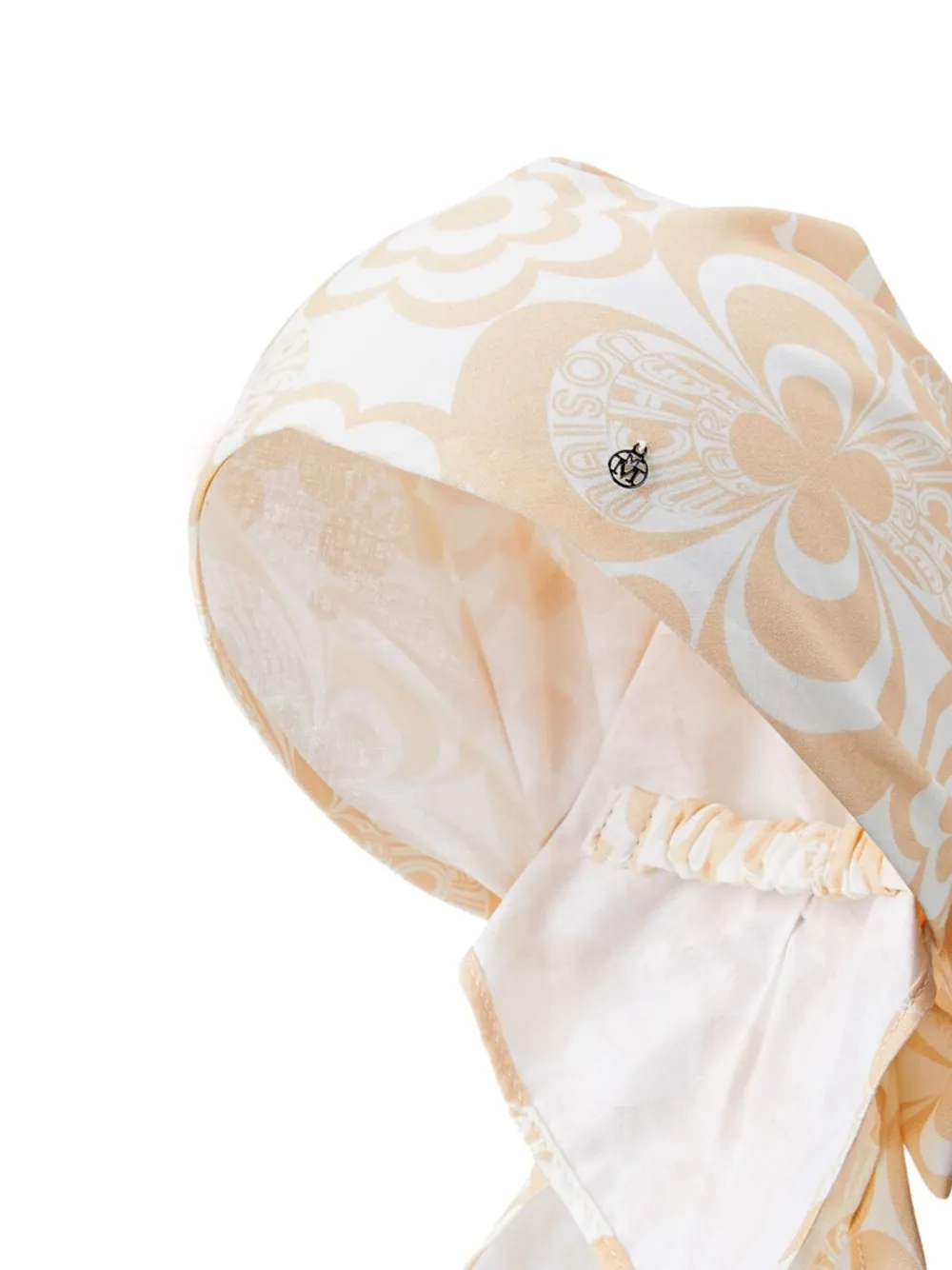 Bianco cloud, marrone cammello, cotone, stampa a fiori, placca con logo color argento, dettaglio fiocco e design regolabile.
