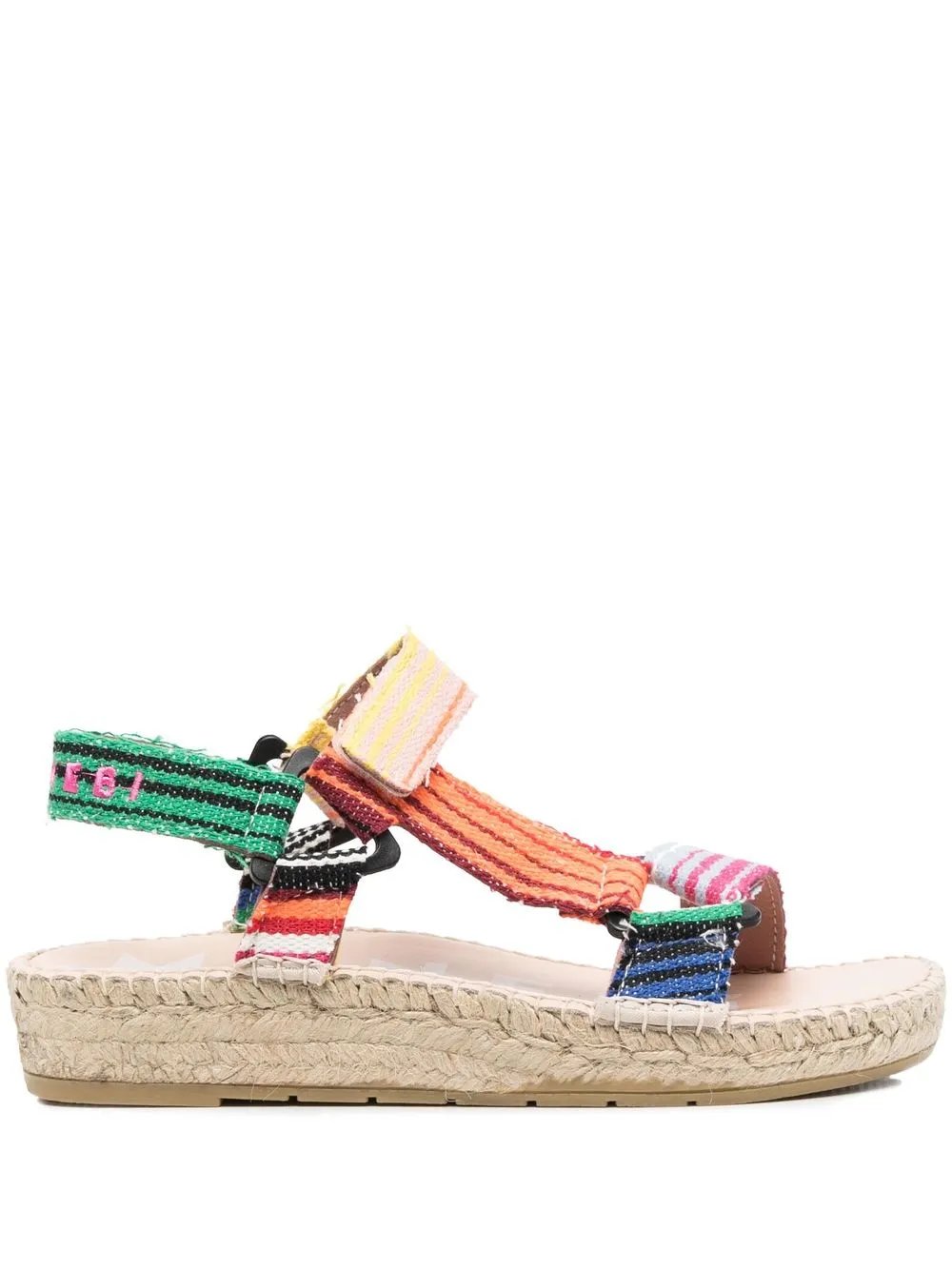 Multicolore, pelle, stampa a righe, soletta con logo, punta aperta, chiusura frontale a strappo e suola piatta in gomma.