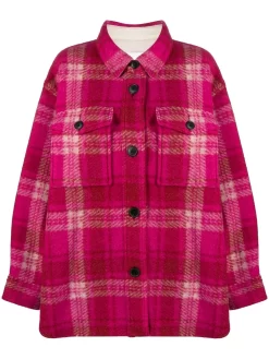 Fucsia, misto poliestere riciclato, colletto classico, chiusura frontale con bottoni, maniche lunghe e due tasche applicate sul davanti.