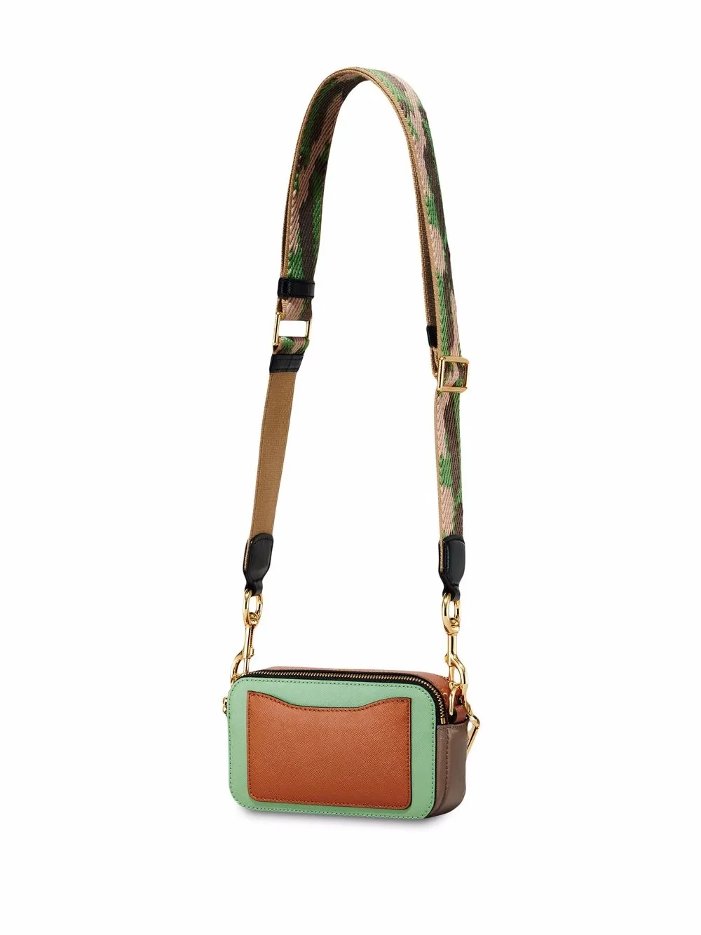 Design color-block, placca con logo color oro, tasca a soffietto sul retro, fessure portacarte interne e tracolla regolabile e rimovibile. Materiale: pelle.