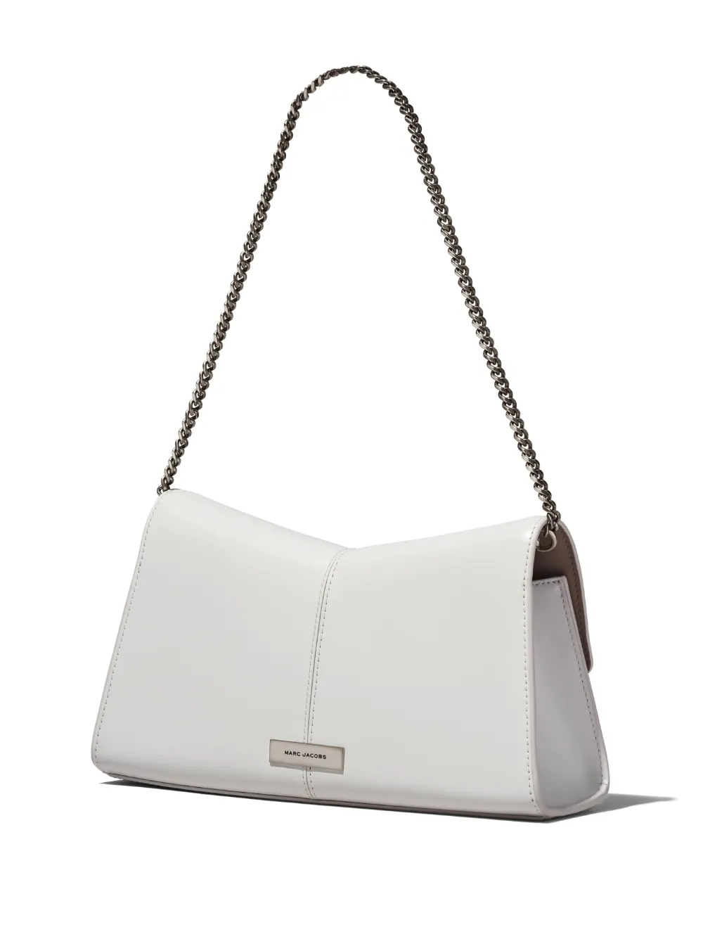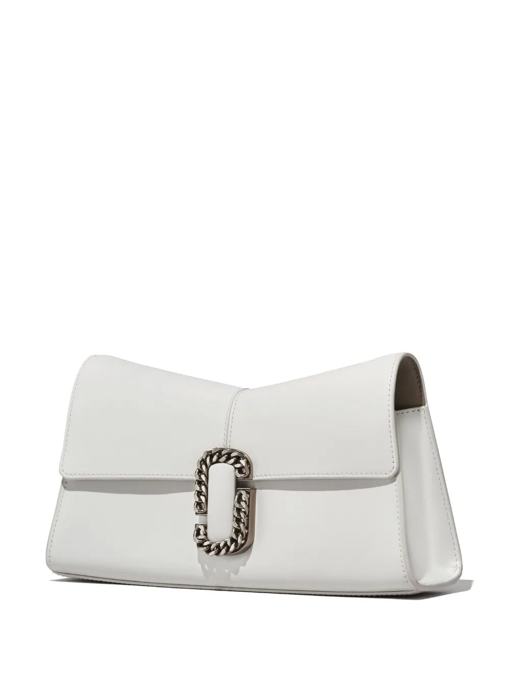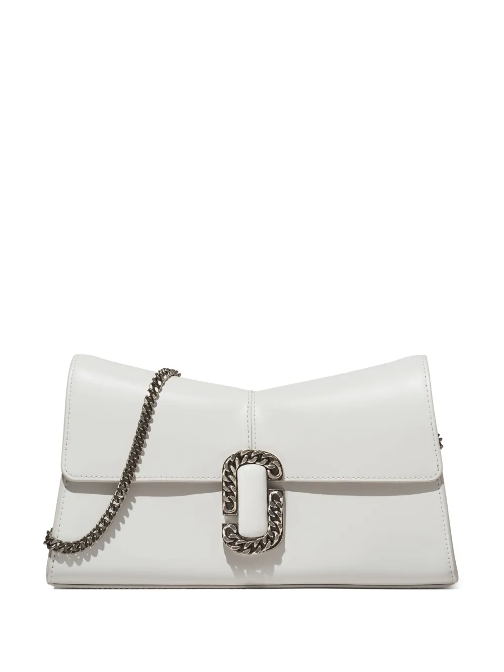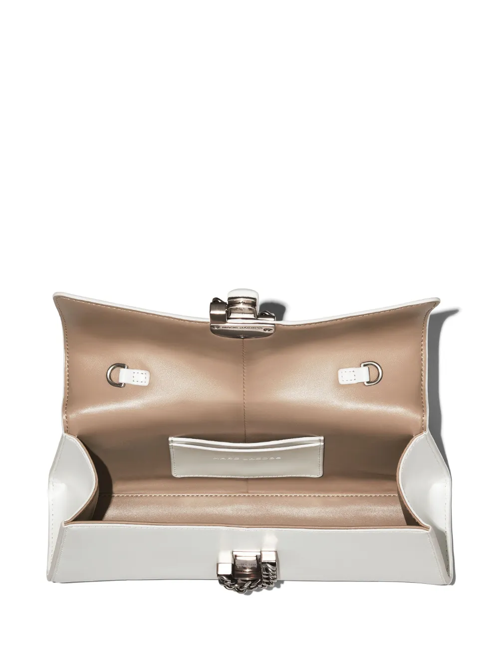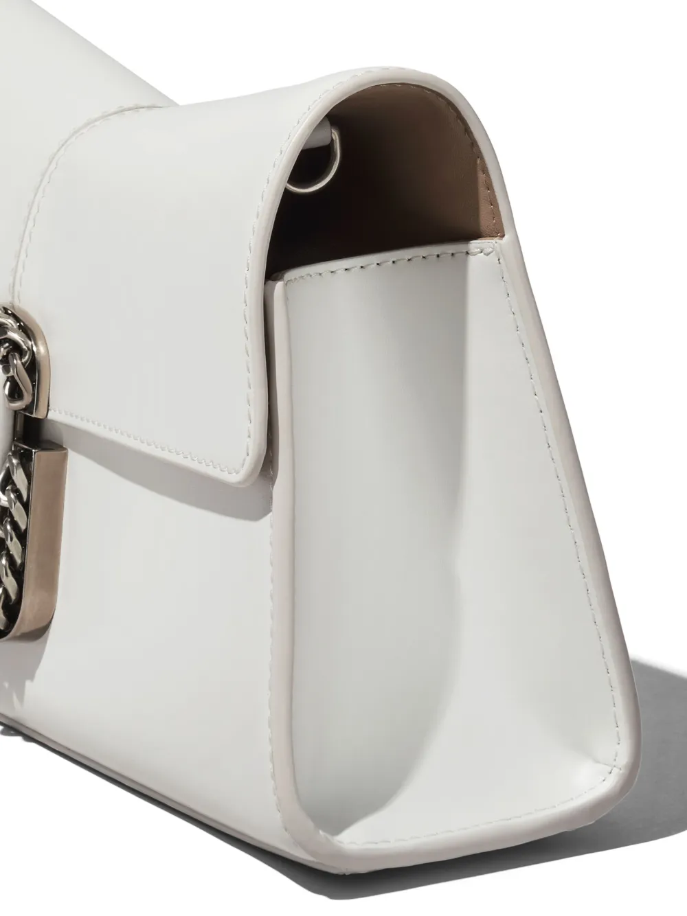 Bianco, pelle, placca con logo, pattina nella parte superiore, chiusura frontale con fermaglio, tracolla rimovibile con catena, scomparto unico e fessure portacarte interne.