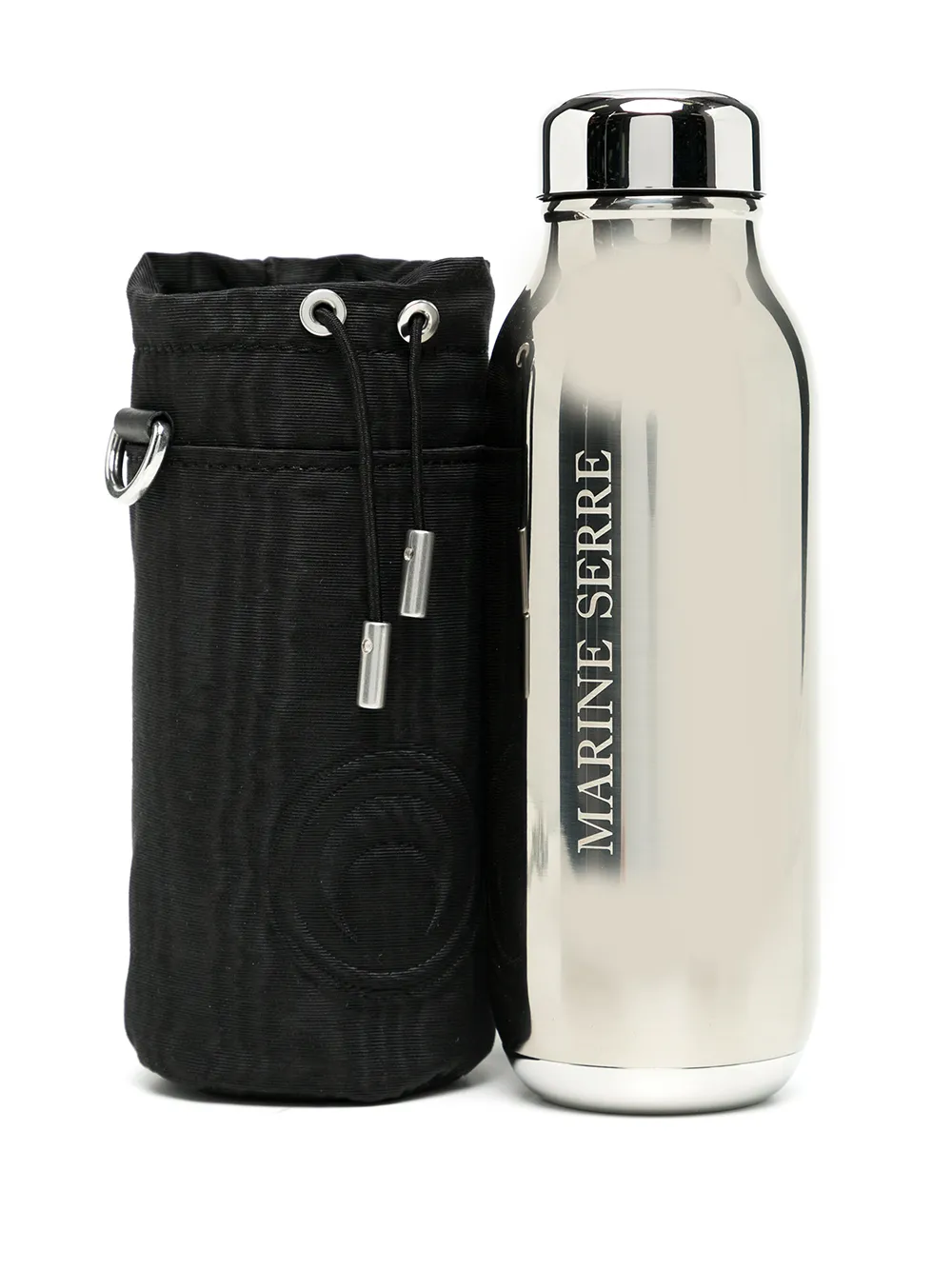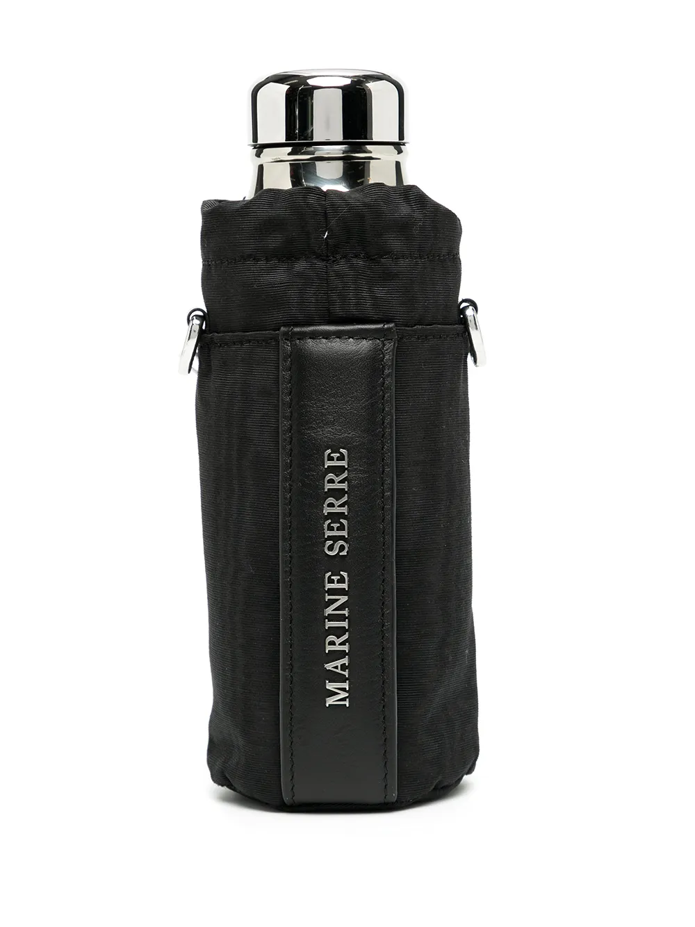 Stampa con luna crescente, logo inciso, chiusura a coulisse, effetto moiré e tracolla rimovibile con catena.