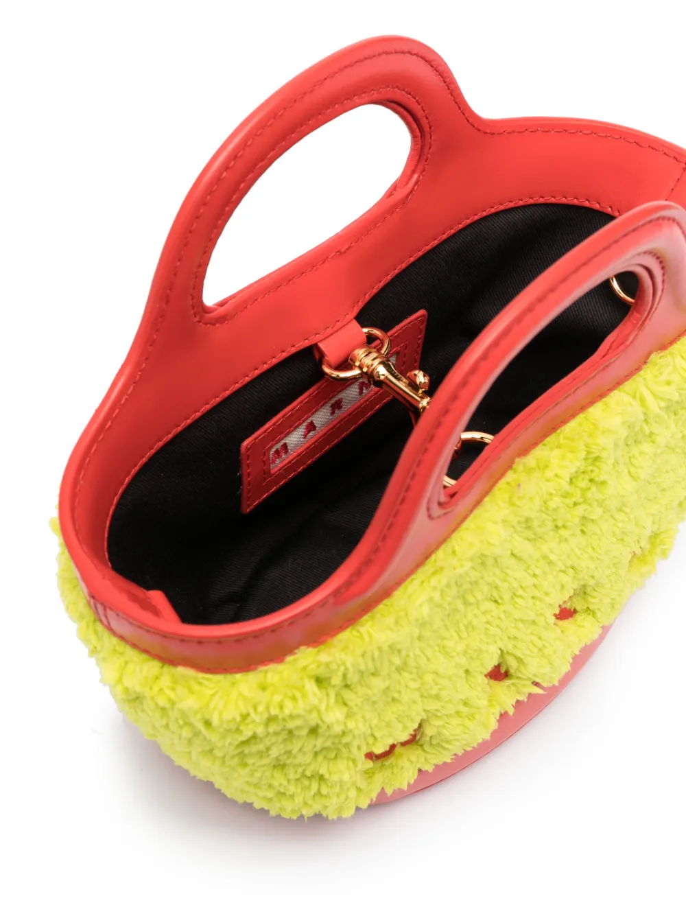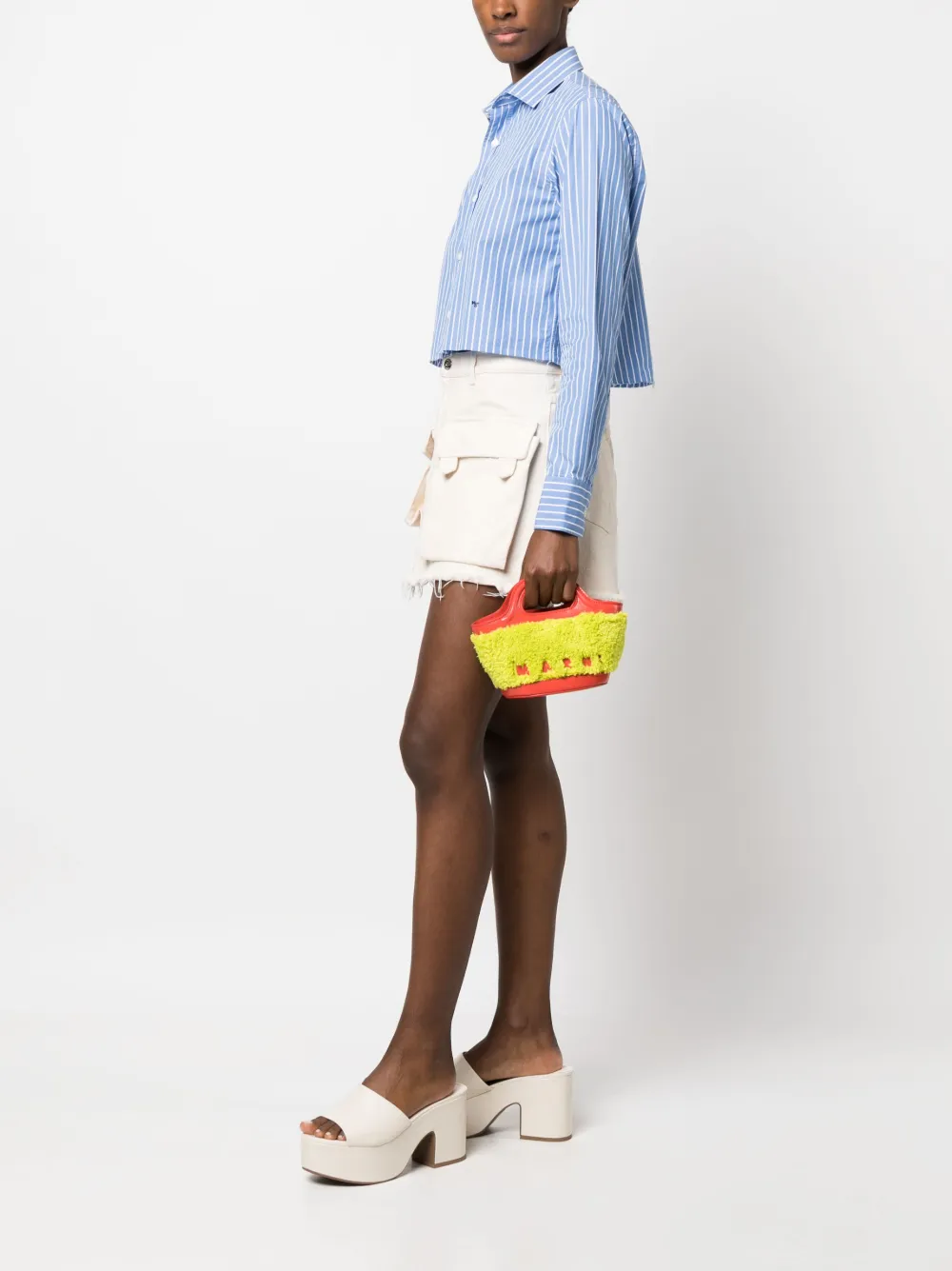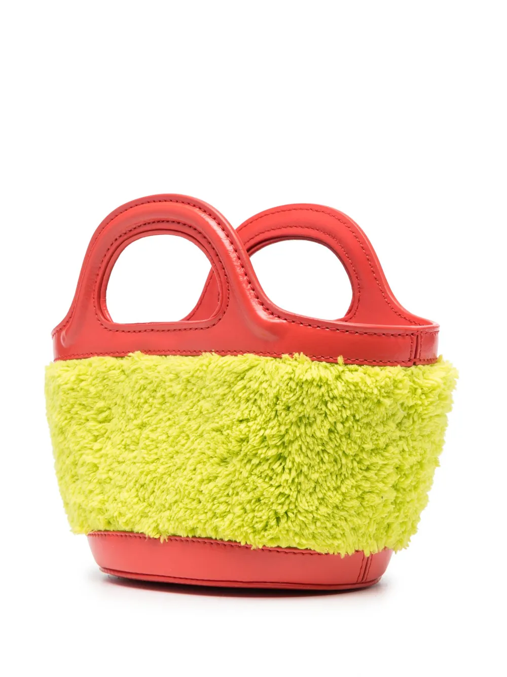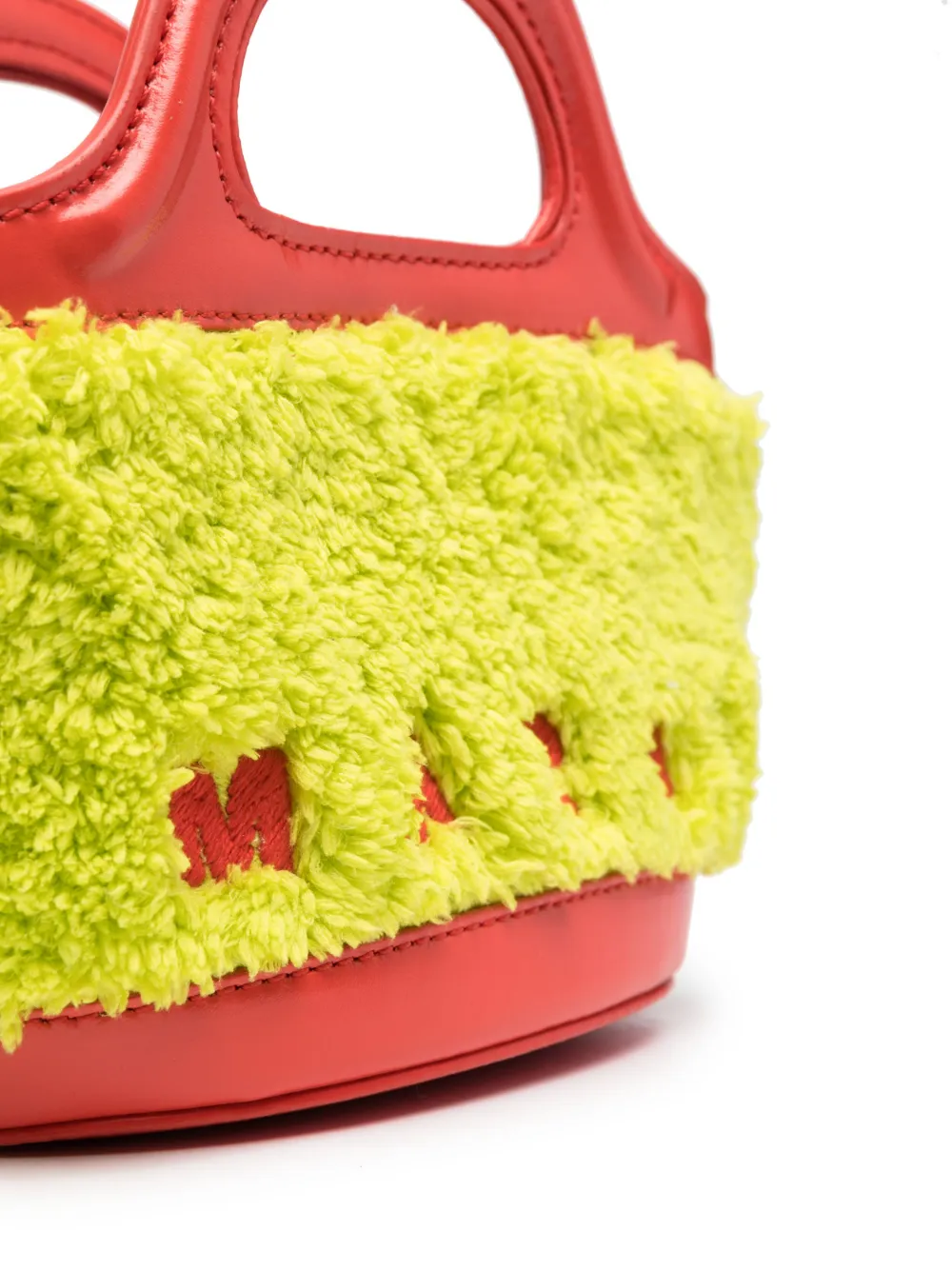 Rosso papavero, giallo fluorescente, cotone, pelle di vitello, dettaglio in pelliccia cruelty-free, logo frontale inciso, manici rotondi, scomparto unico e tracolla rimovibile.