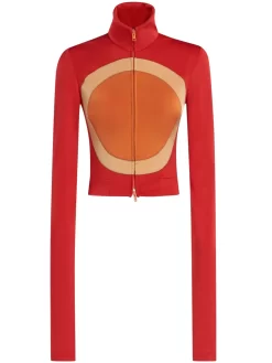 Rosso brillante, arancio mandarino, scollo a imbuto, maniche lunghe, chiusura frontale con zip a doppio cursore, design crop e orlo dritto.