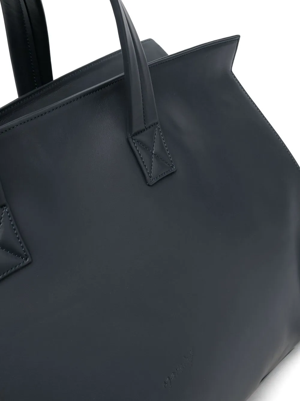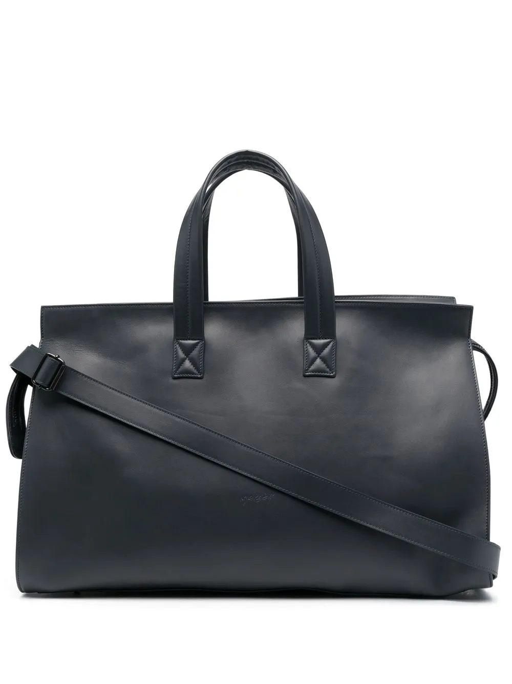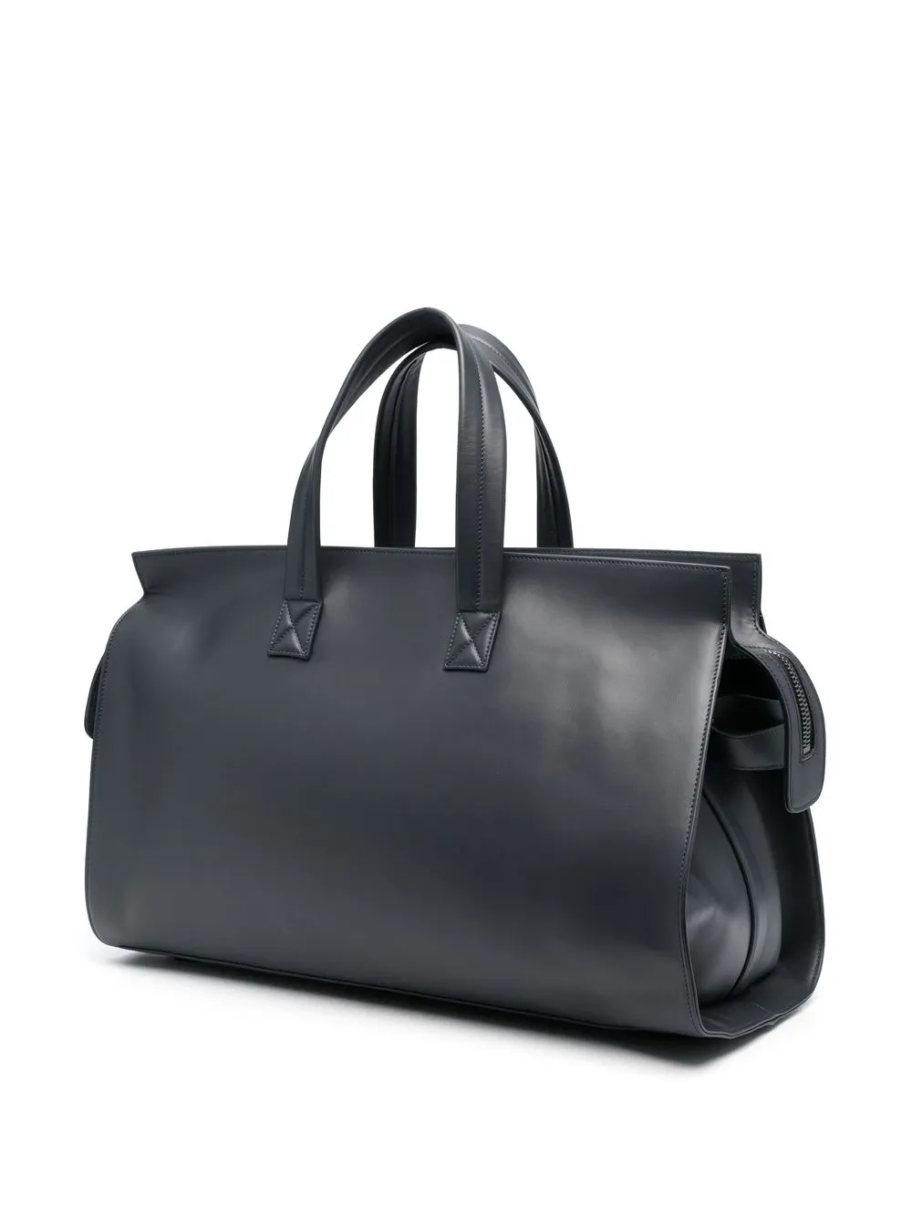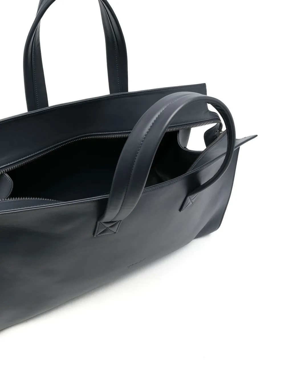 Blu, pelle di vitello, chiusura superiore con zip, due manici tondi e design con fascia singola.