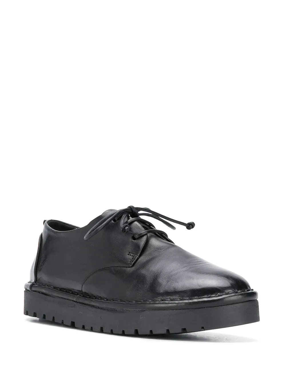 Effetto lucido, linguetta sul tallone, punta tonda, chiusura frontale con lacci, soletta con logo e plateau. Materiale: pelle. Colore: di colore nero.