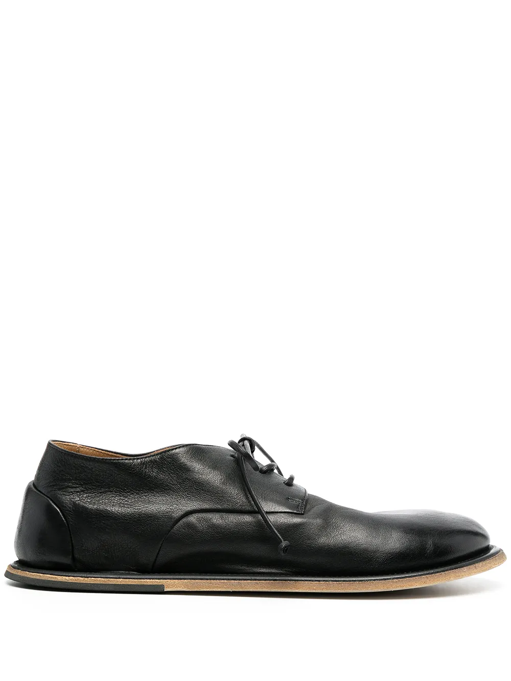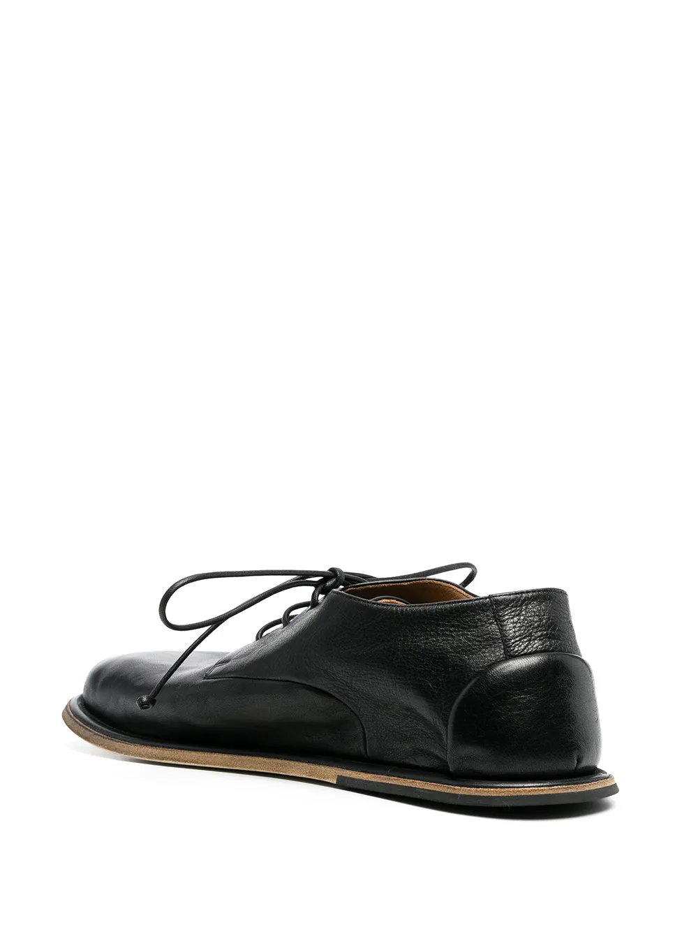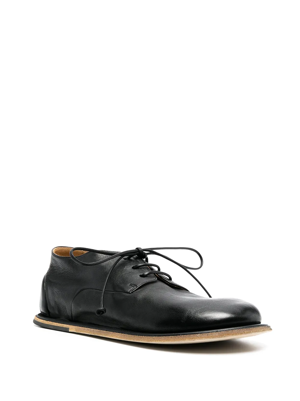 Suola piatta in gomma, chiusura frontale con lacci, finitura lucida, design monocromo e punta tonda. Materiale: pelle. Colore: nero.