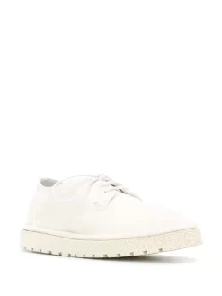 Giallo chiaro, pelle di vitello, dettaglio con punto festone, punta tonda, chiusura frontale con lacci e suola chunky in gomma.
