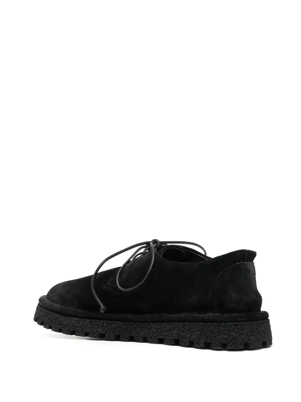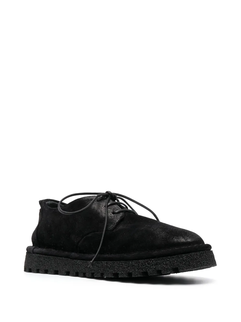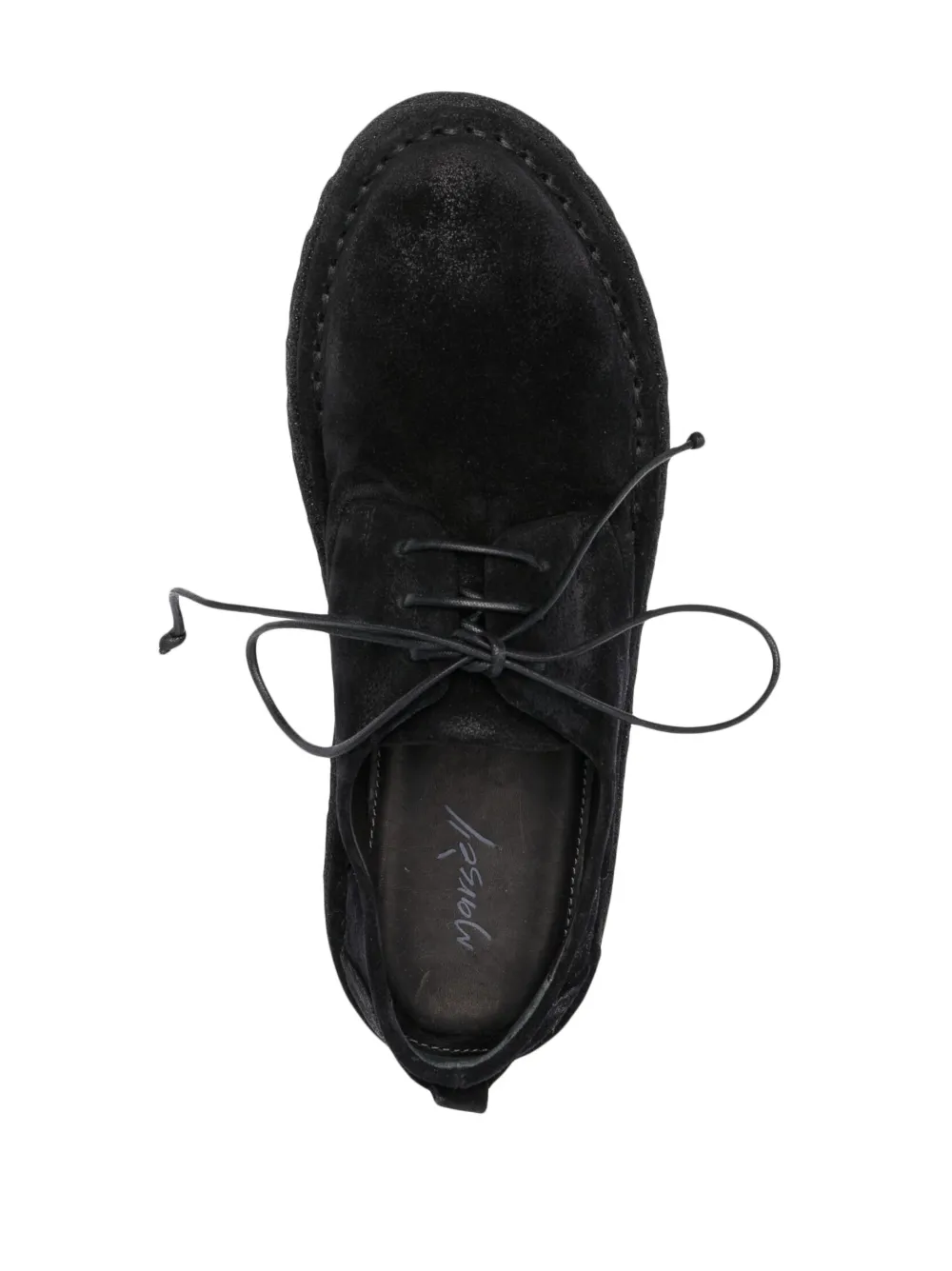 Nero, pelle di vitello, cuciture tono su tono, punta tonda, chiusura frontale con lacci, soletta in pelle con logo e suola in gomma antiscivolo.