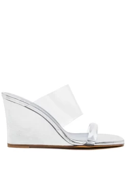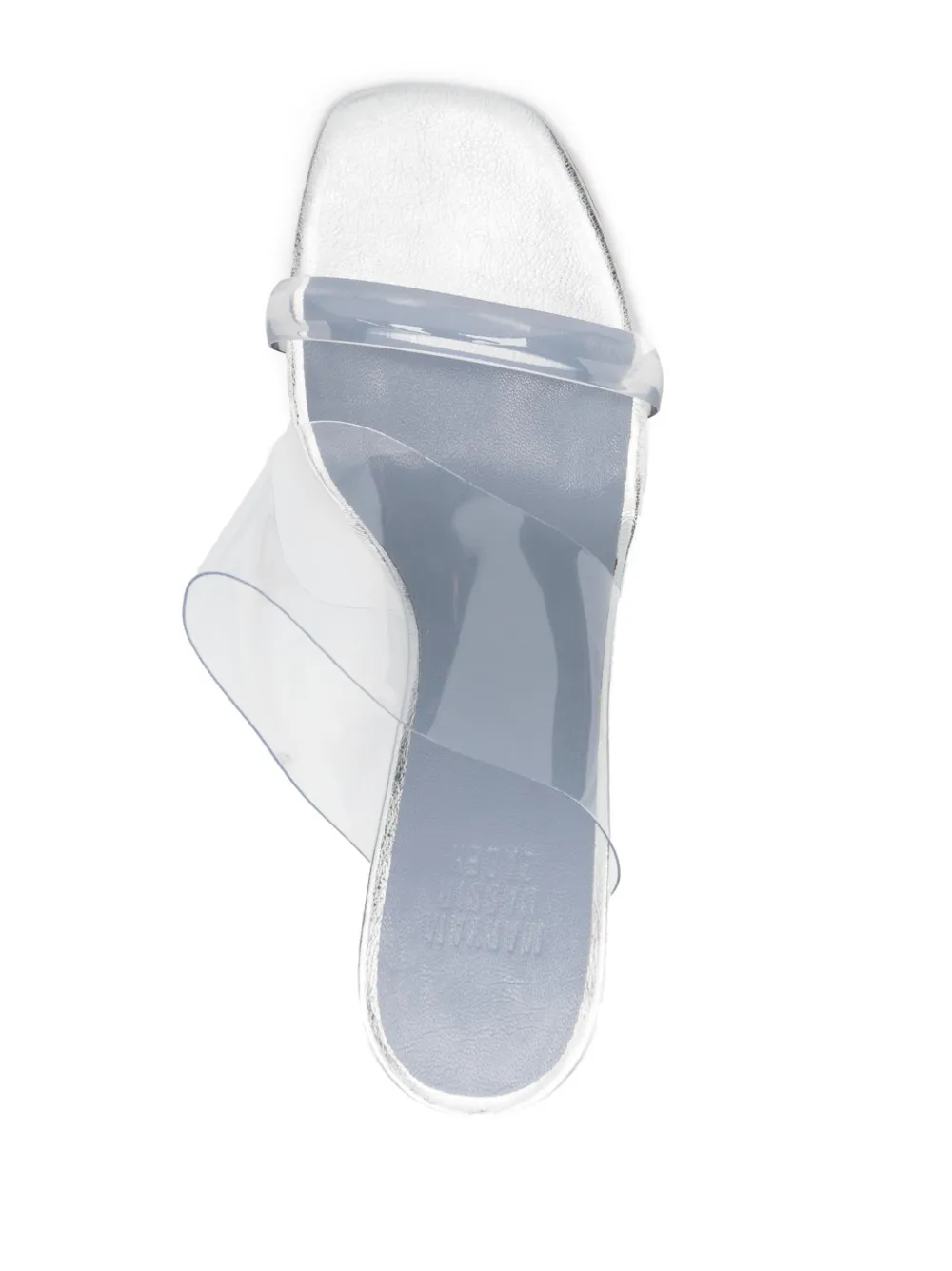 Color argento, pelle di vitello, effetto metallizzato, dettaglio con pannello trasparente, punta aperta, design slip-on, tacco alto a zeppa, soletta con logo e suola in gomma.