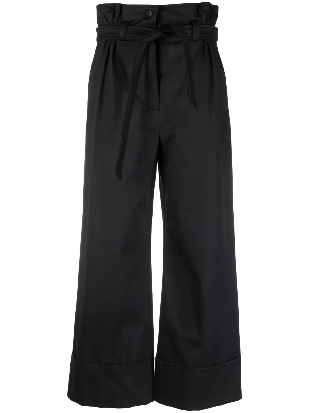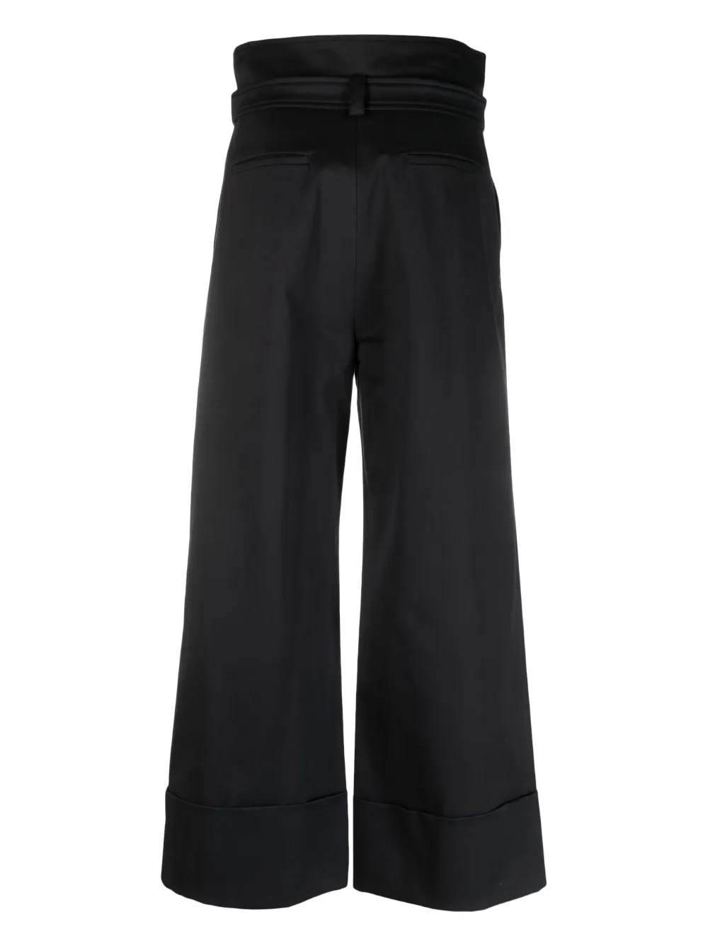 Nero, modello con cintura, modello a vita alta, passanti, chiusura frontale con bottoni e zip, due tasche posteriori a filetto e gamba ampia.