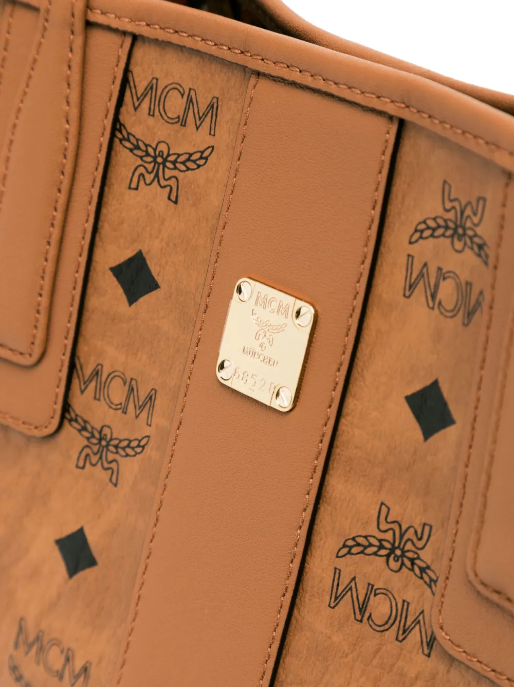Marrone cognac, pelle di vitello, tela, stampa con logo all-over, placca con logo, due manici lunghi e fodera integrale.