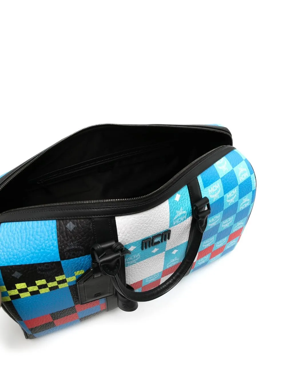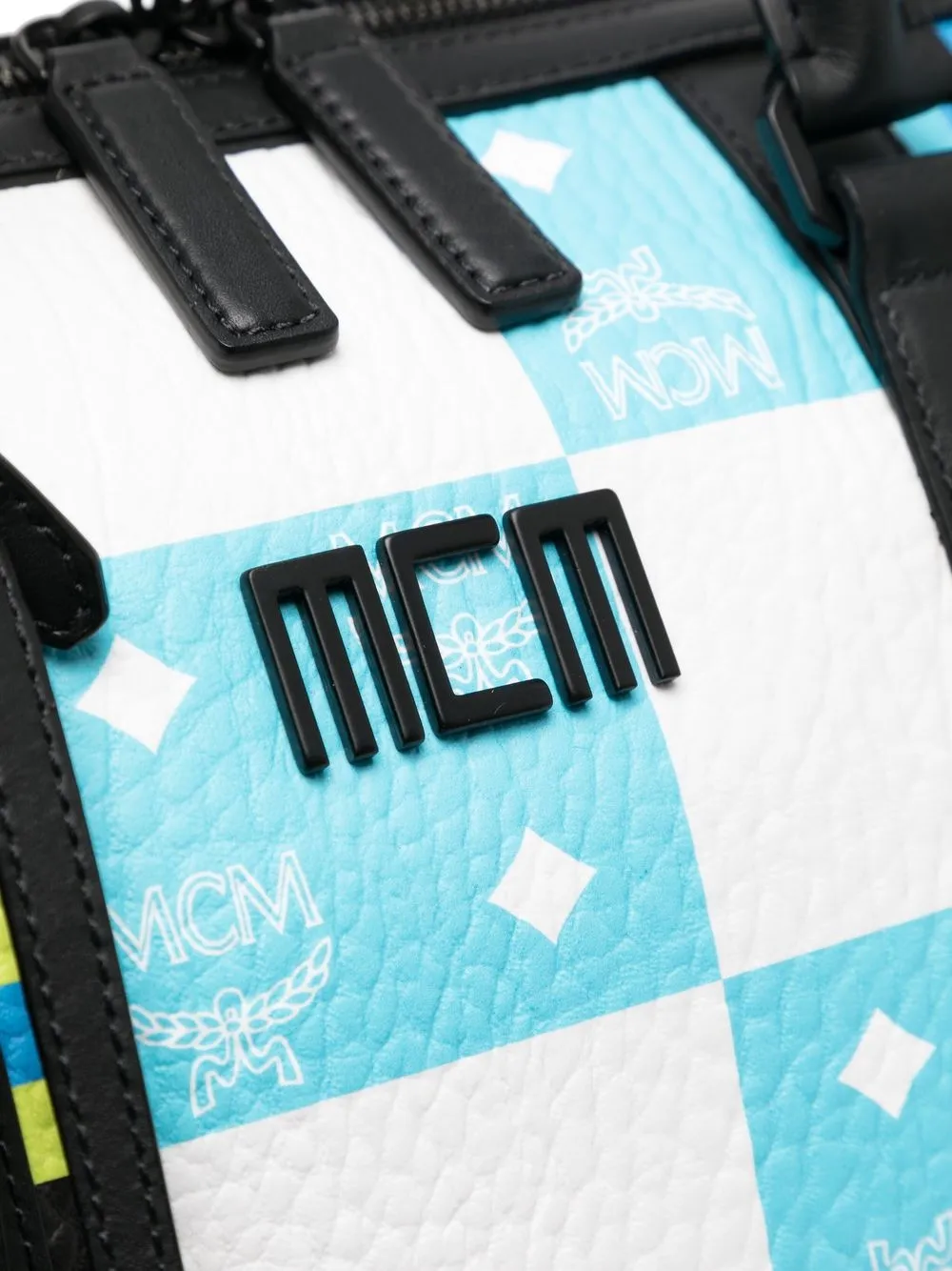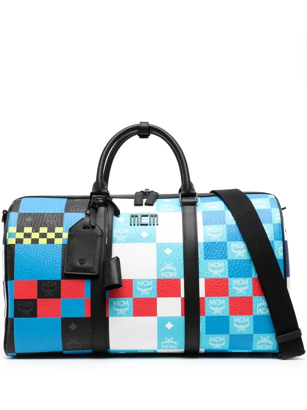 Blu/bianco, multicolore, cuoio, trama martellata, stampa a quadretti, scritta con logo, stampa con logo all-over, targhetta bagaglio, due manici, tracolla regolabile e rimovibile, chiusura con zip a doppio cursore e scomparto unico.