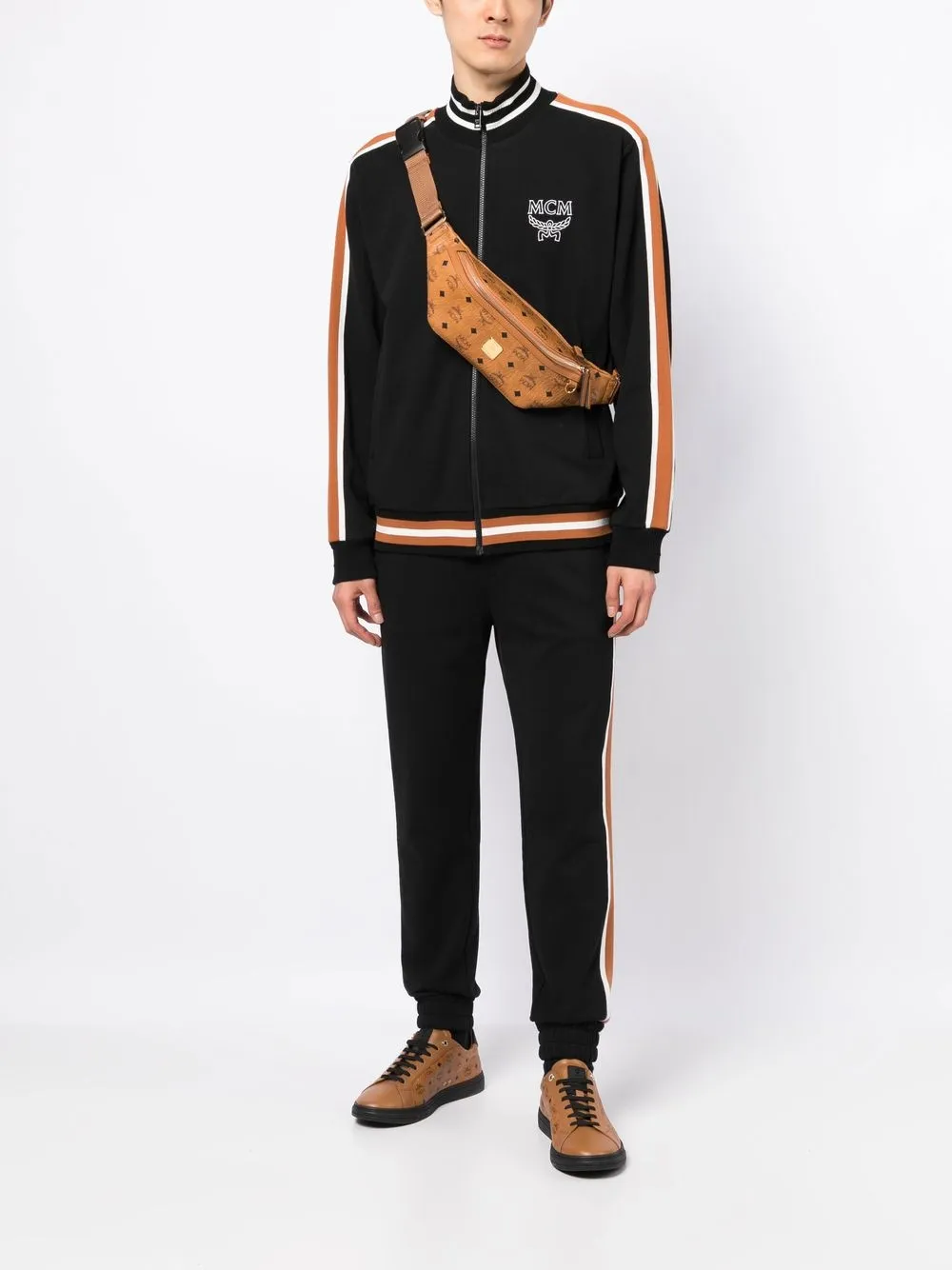 Stampa con logo all-over, placca con logo, tracolla regolabile e chiusura frontale con zip.