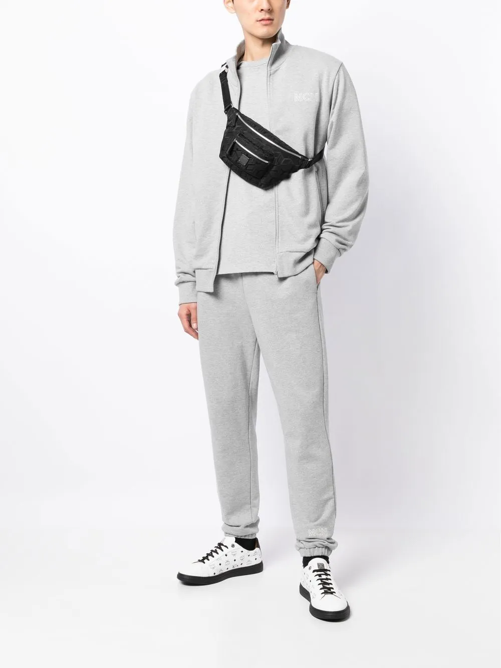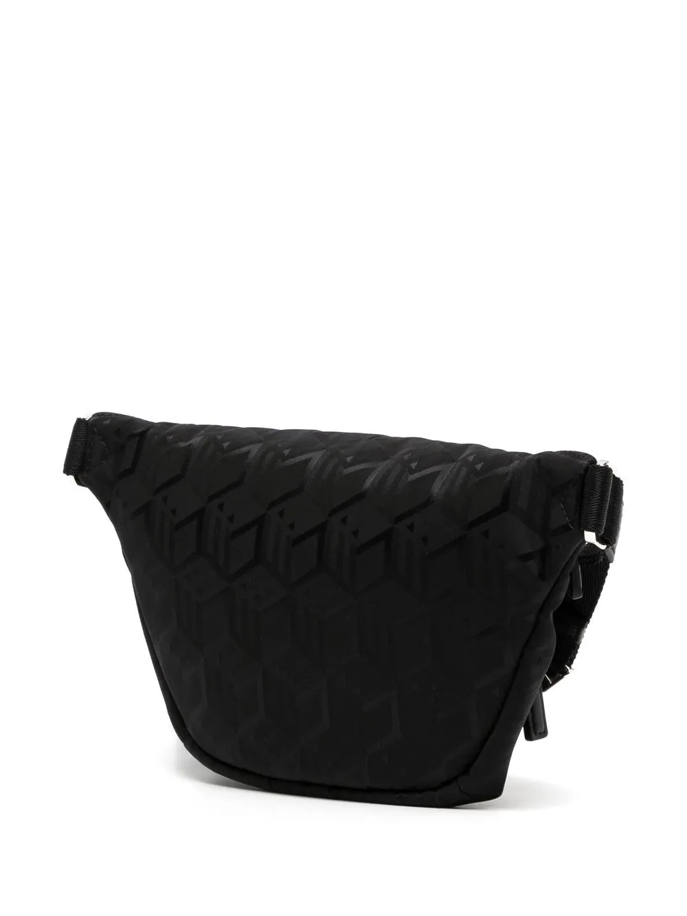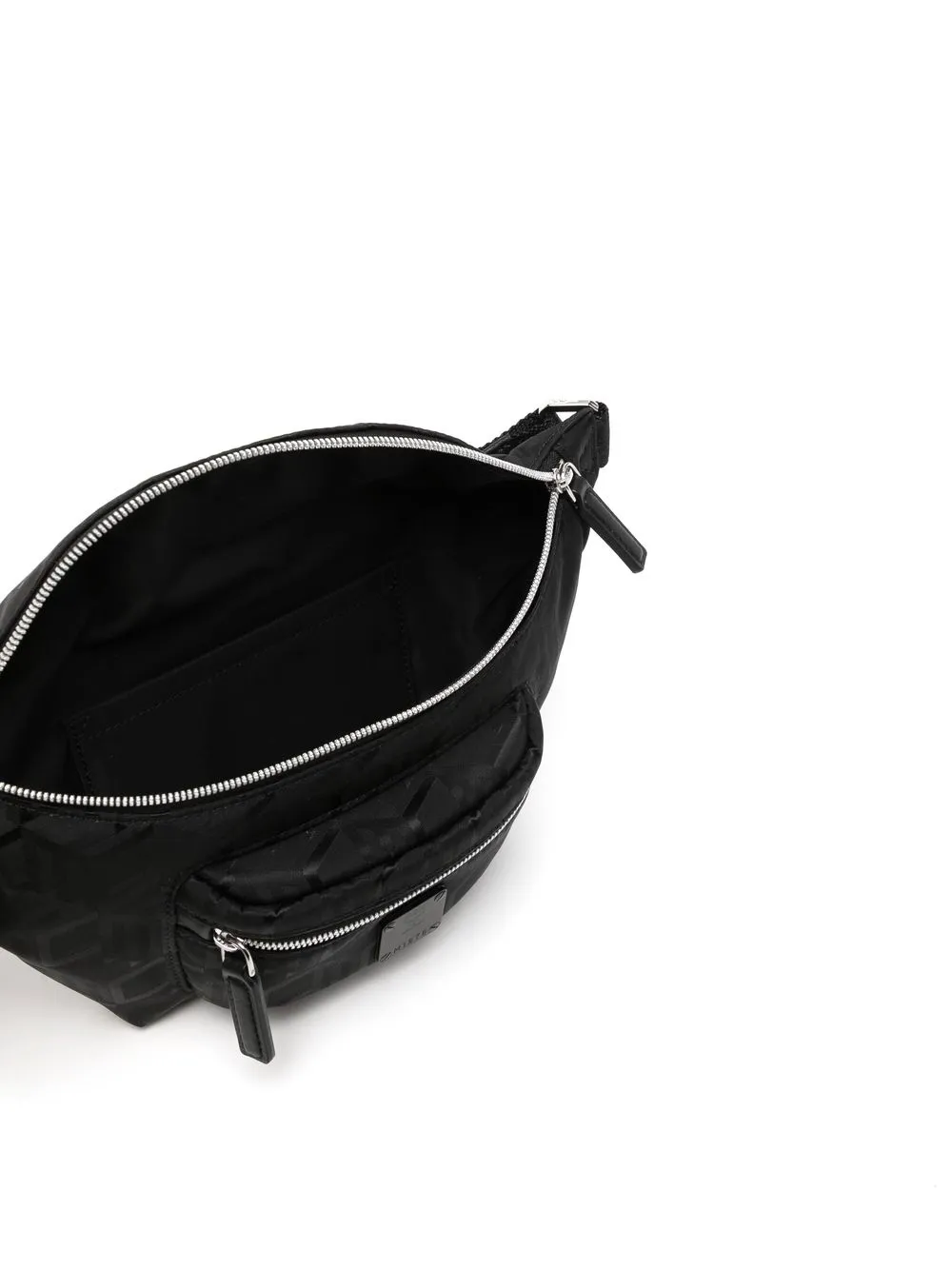 Nero, stampa con fantasia geometrica, applicazione frontale con logo, chiusura superiore con zip, tracolla regolabile, chiusura a clip, scomparto unico e tasca frontale con zip.