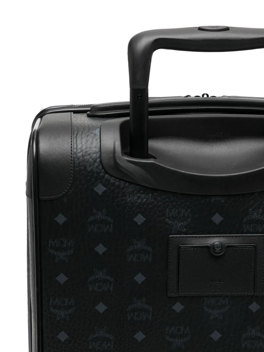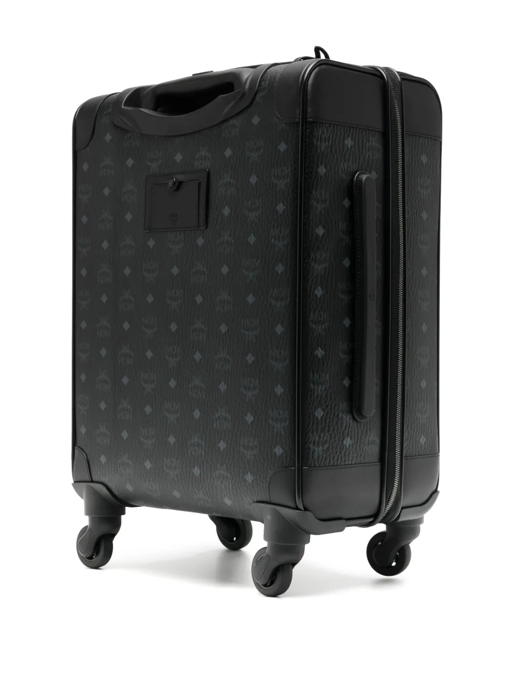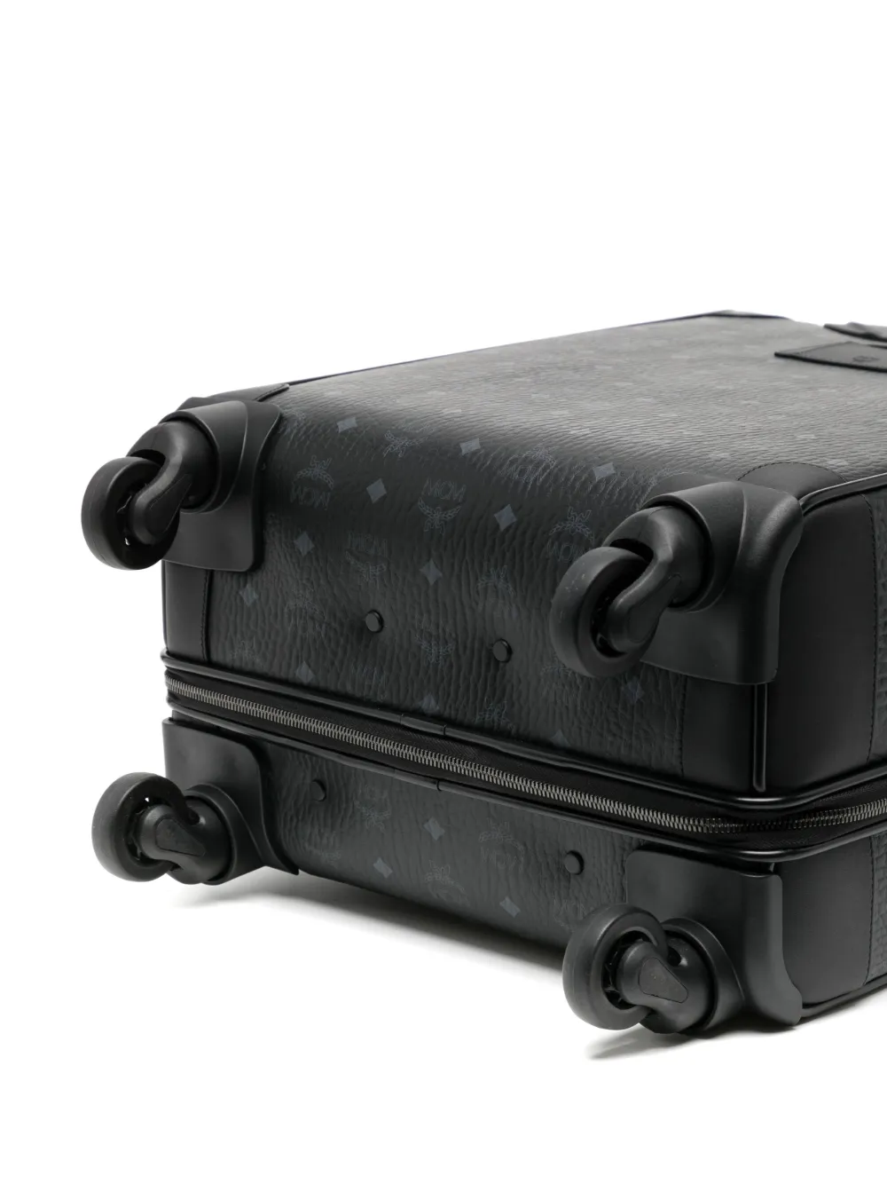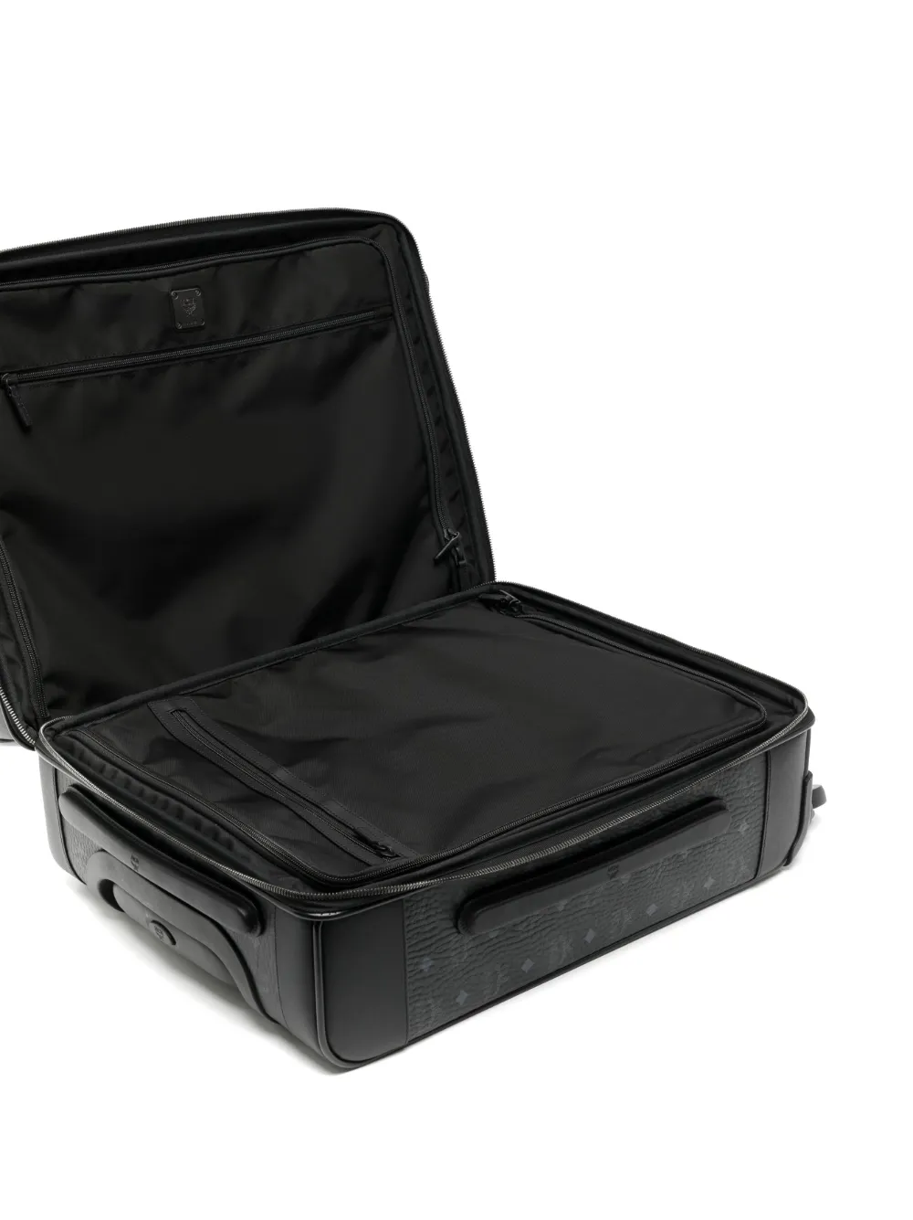 Nero, pelle, trama martellata, stampa con logo all-over, applicazione frontale con logo, dettaglio con bordatura in pelle, dettaglio con lucchetto, chiusura con zip a giro, manico superiore, tasca frontale con zip, quattro ruote e scomparto interno diviso.