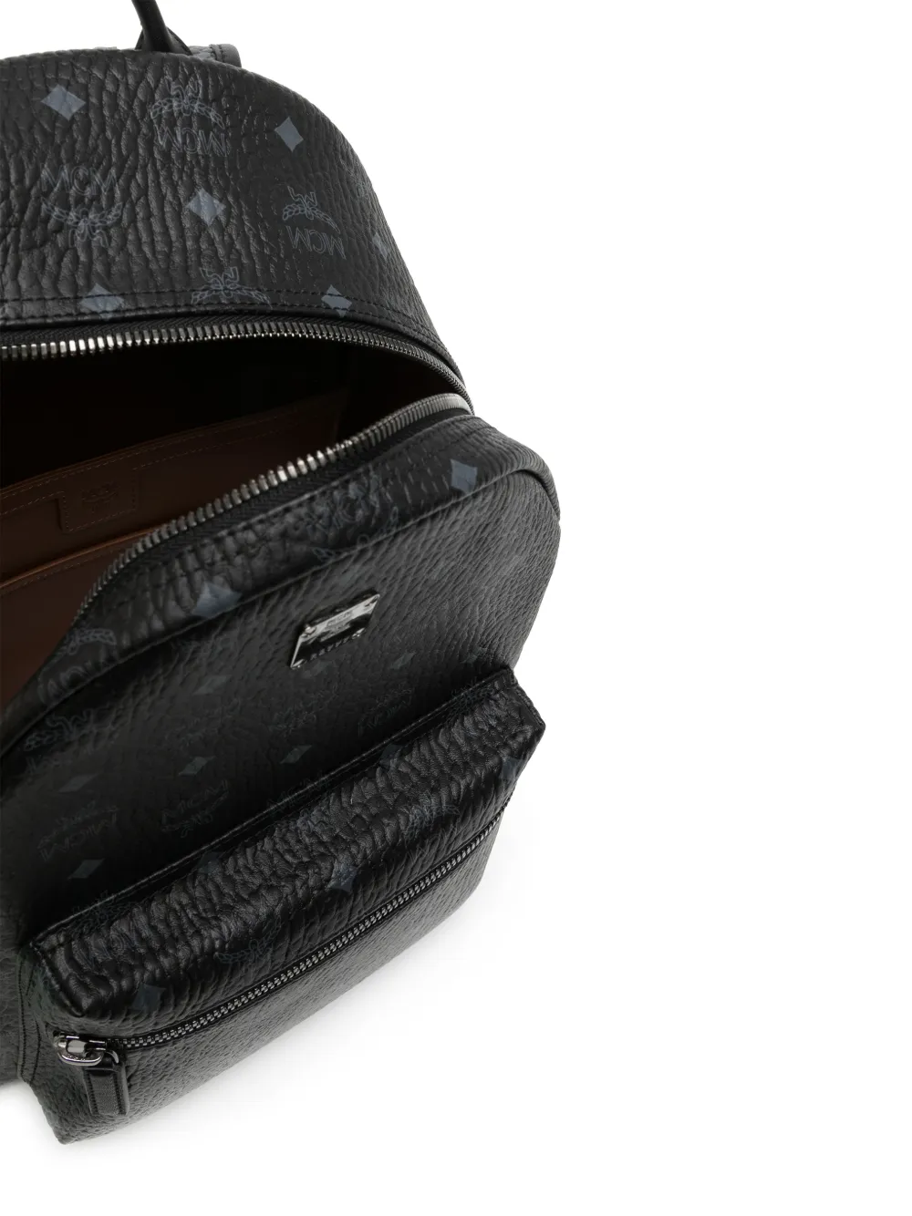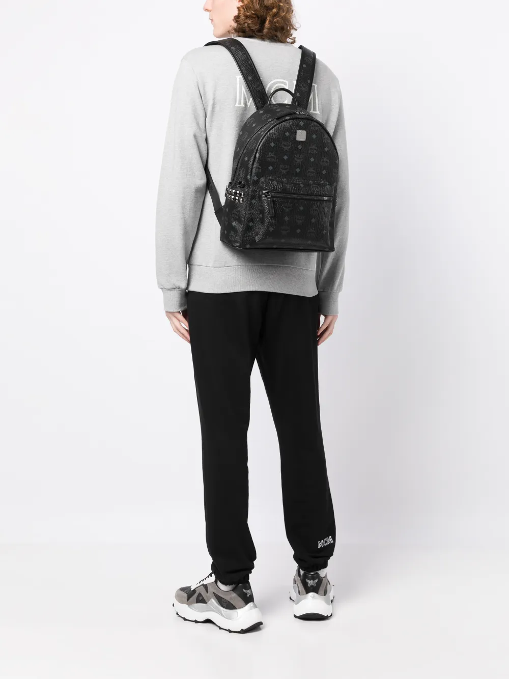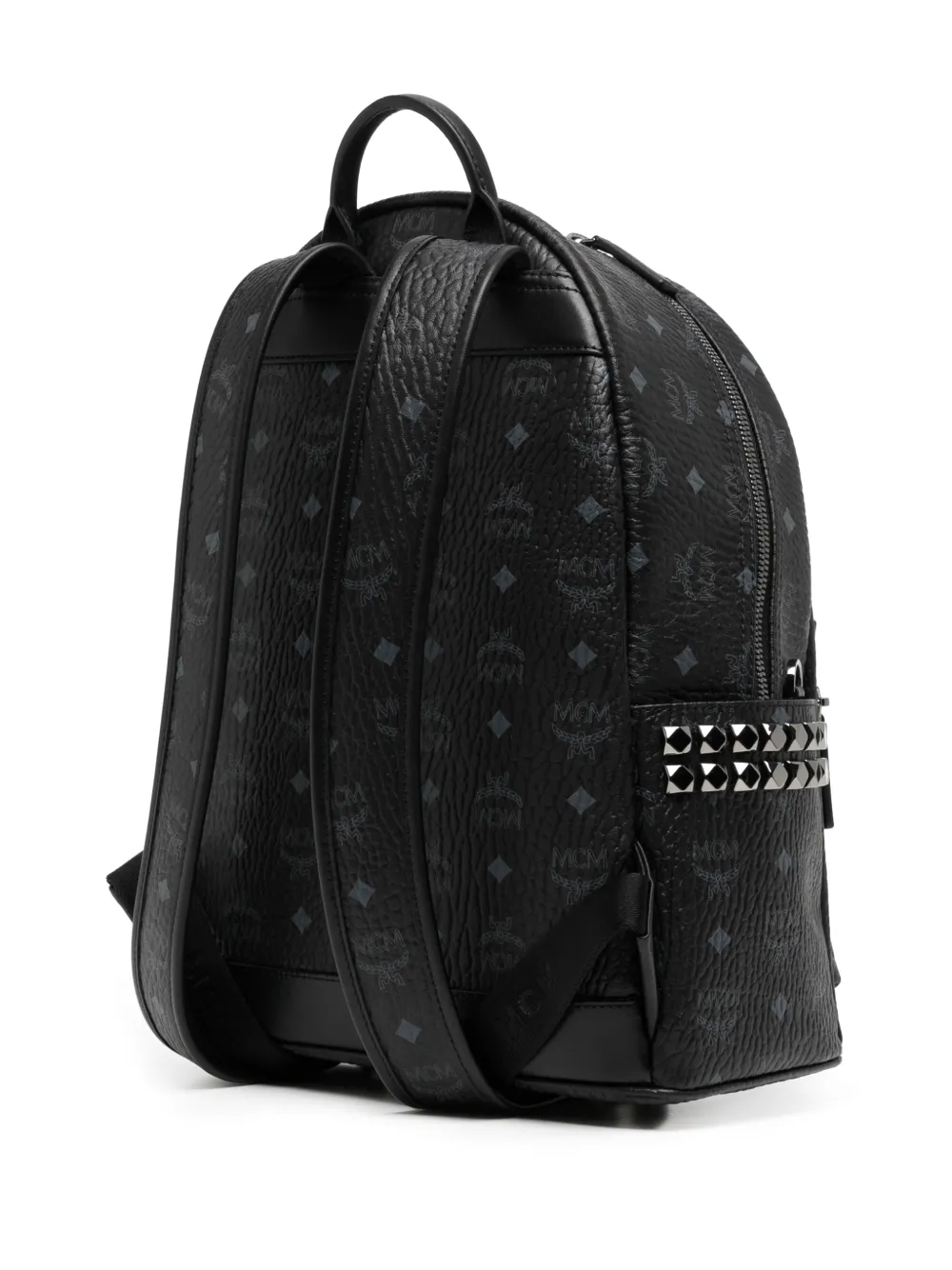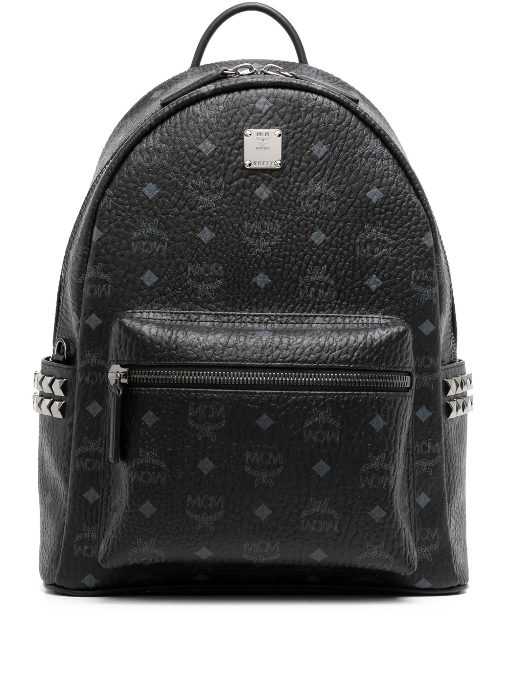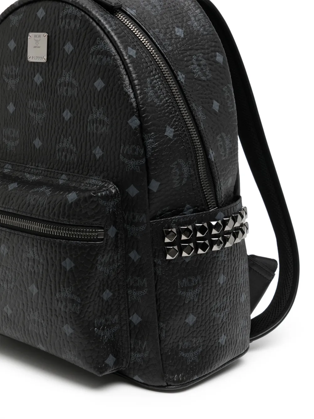 Zaino con borchie con stampa logo all-over di colore nero in pelle di MCM. Modello con manico rotondo alto, bretelle regolabili, tasca con zip e rifinitura con borchie color argento.