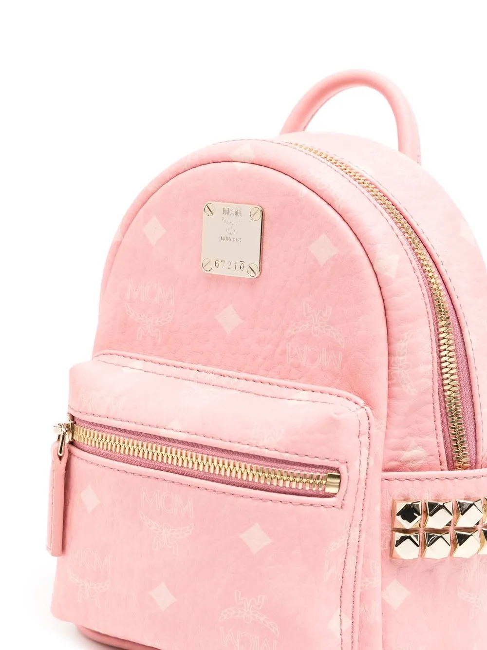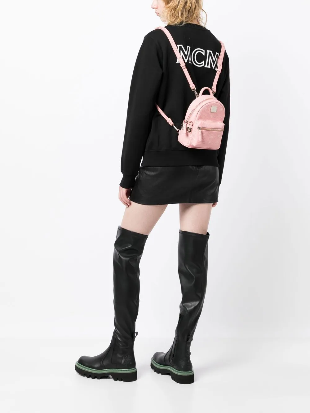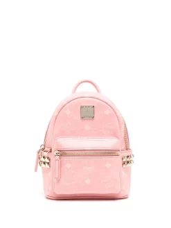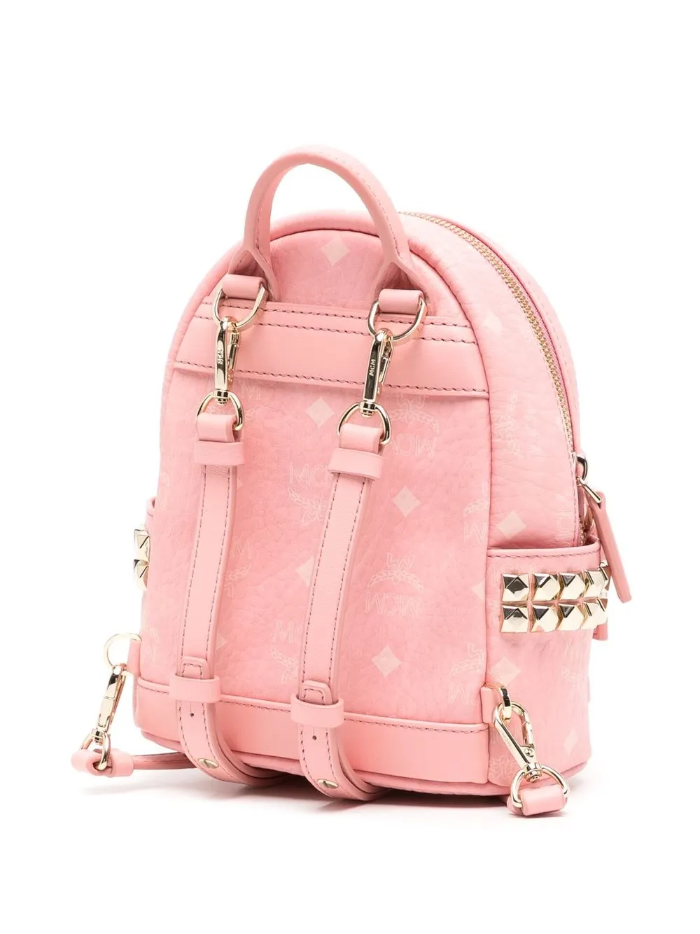 Cuoio, placca con logo color oro, stampa con monogramma, dettaglio borchia a punta, tasca frontale con zip, manico singolo, due tracolle regolabili e scomparto laterale con zip.