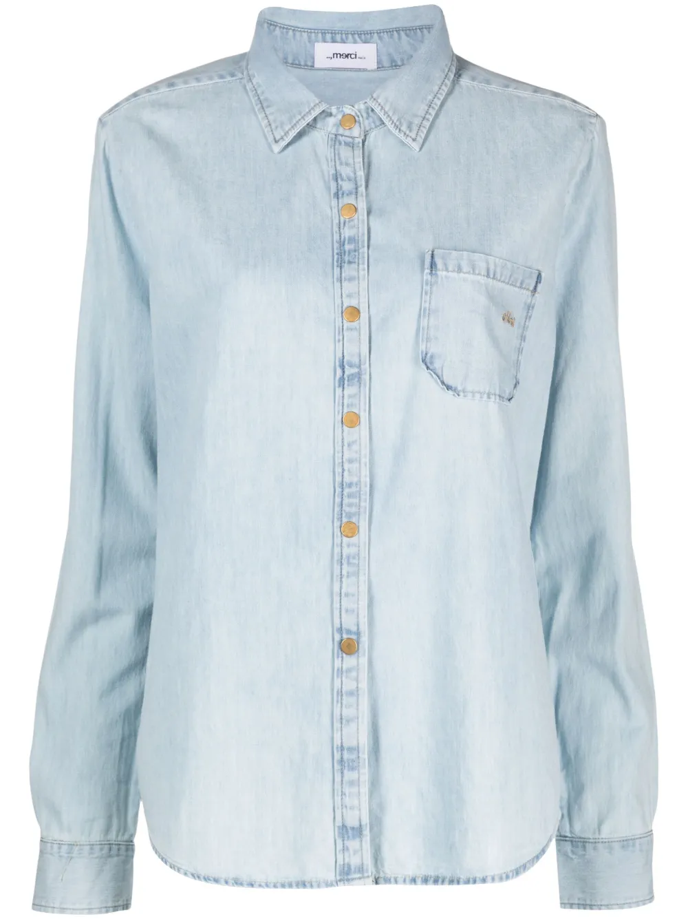 Blu chiaro, cotone, denim, colletto classico, chiusura frontale con bottoni, maniche lunghe, orli con bottone, tasca applicata sul petto e orlo curvo.