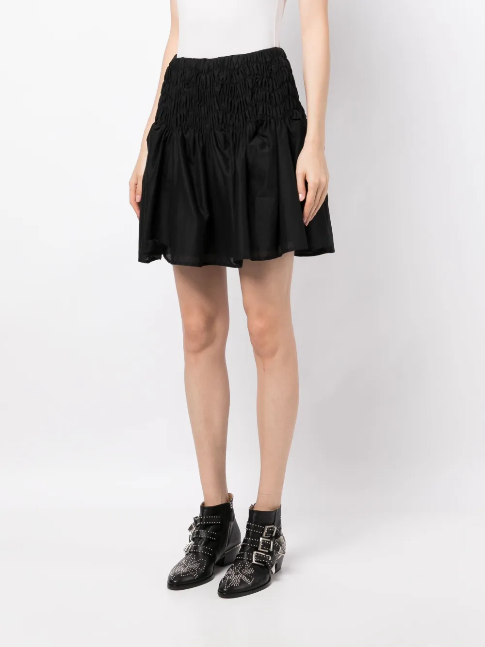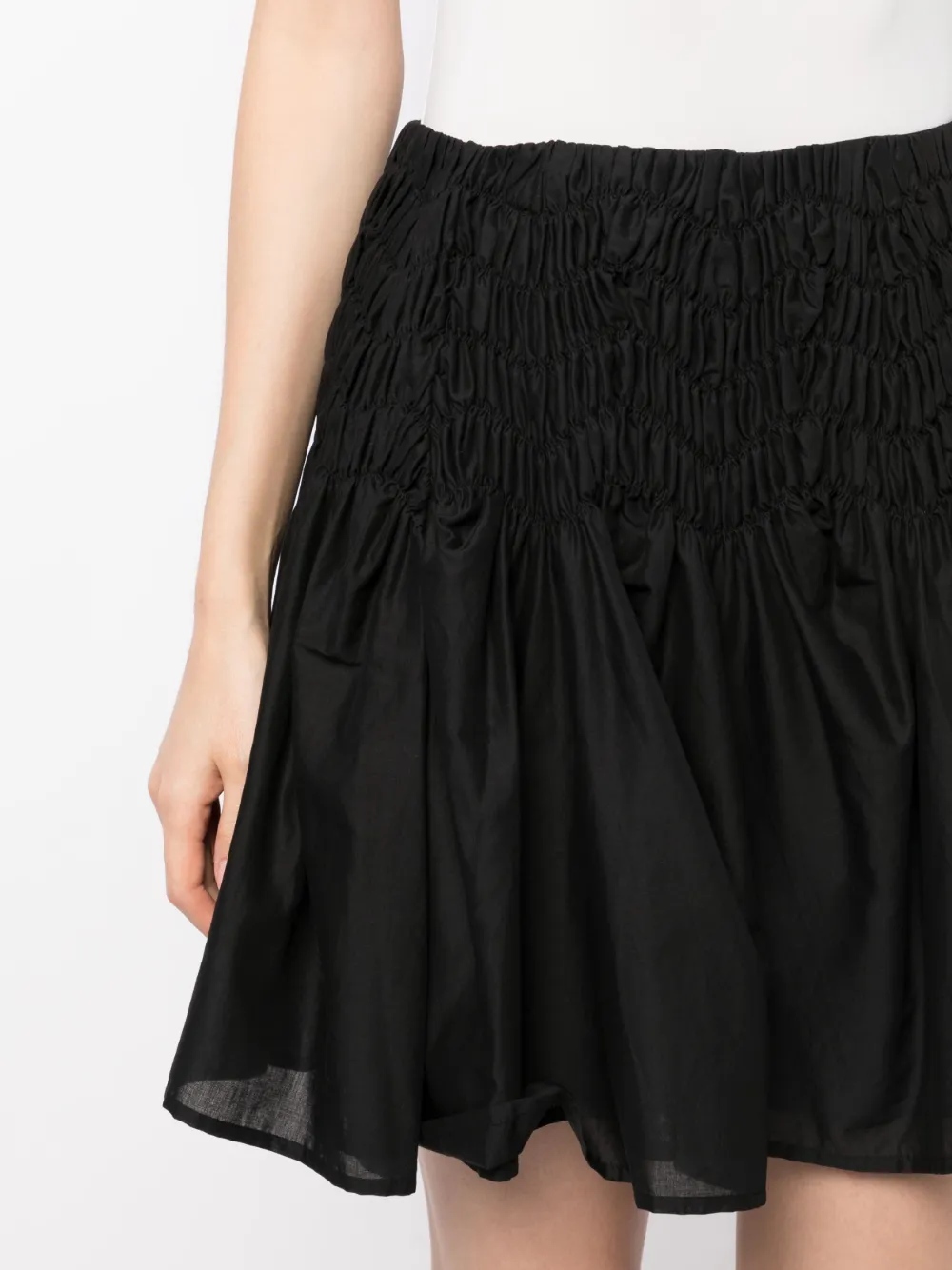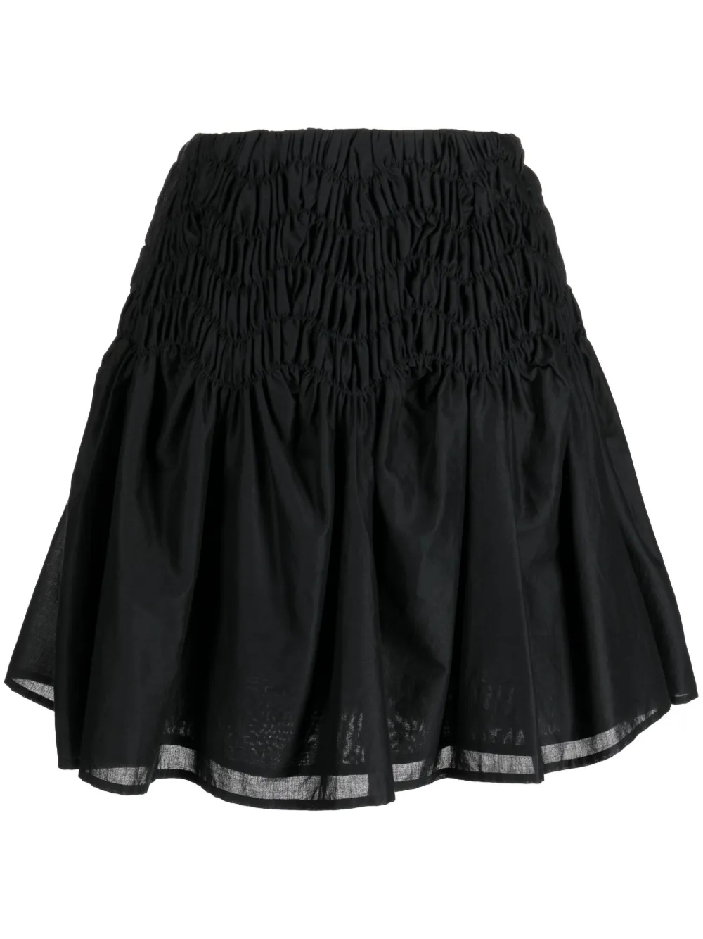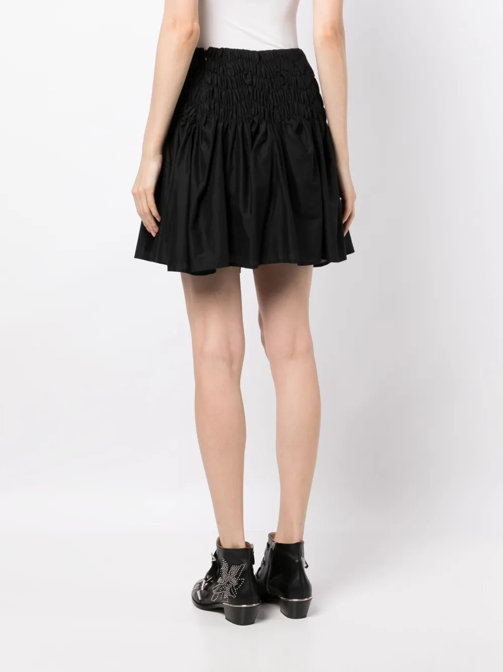 Nero, cotone, vita arricciata con elastico, gonna svasata e lunghezza sopra il ginocchio.