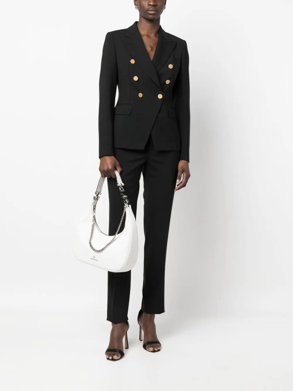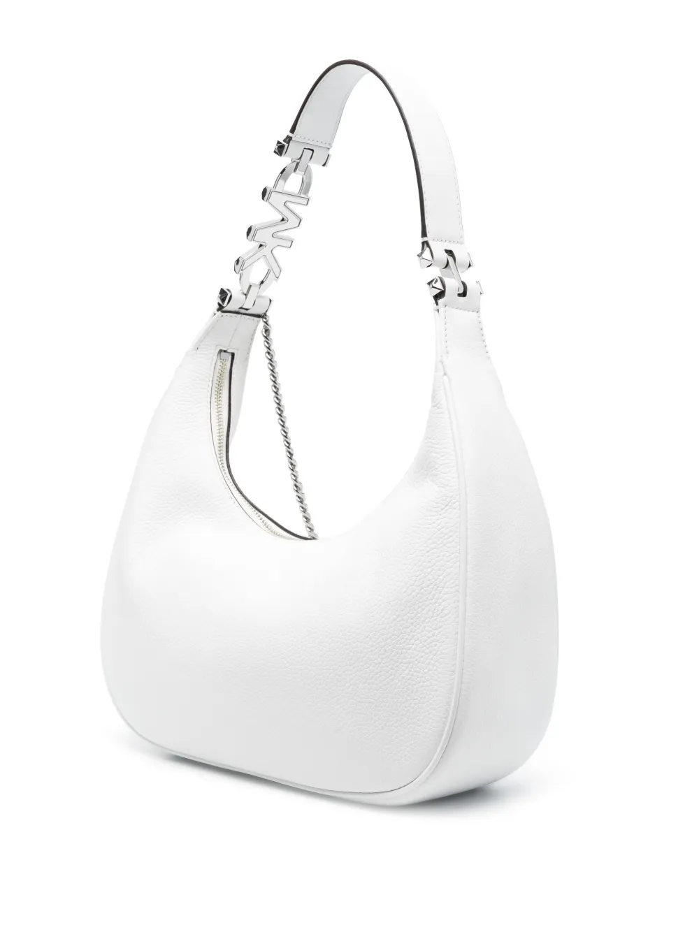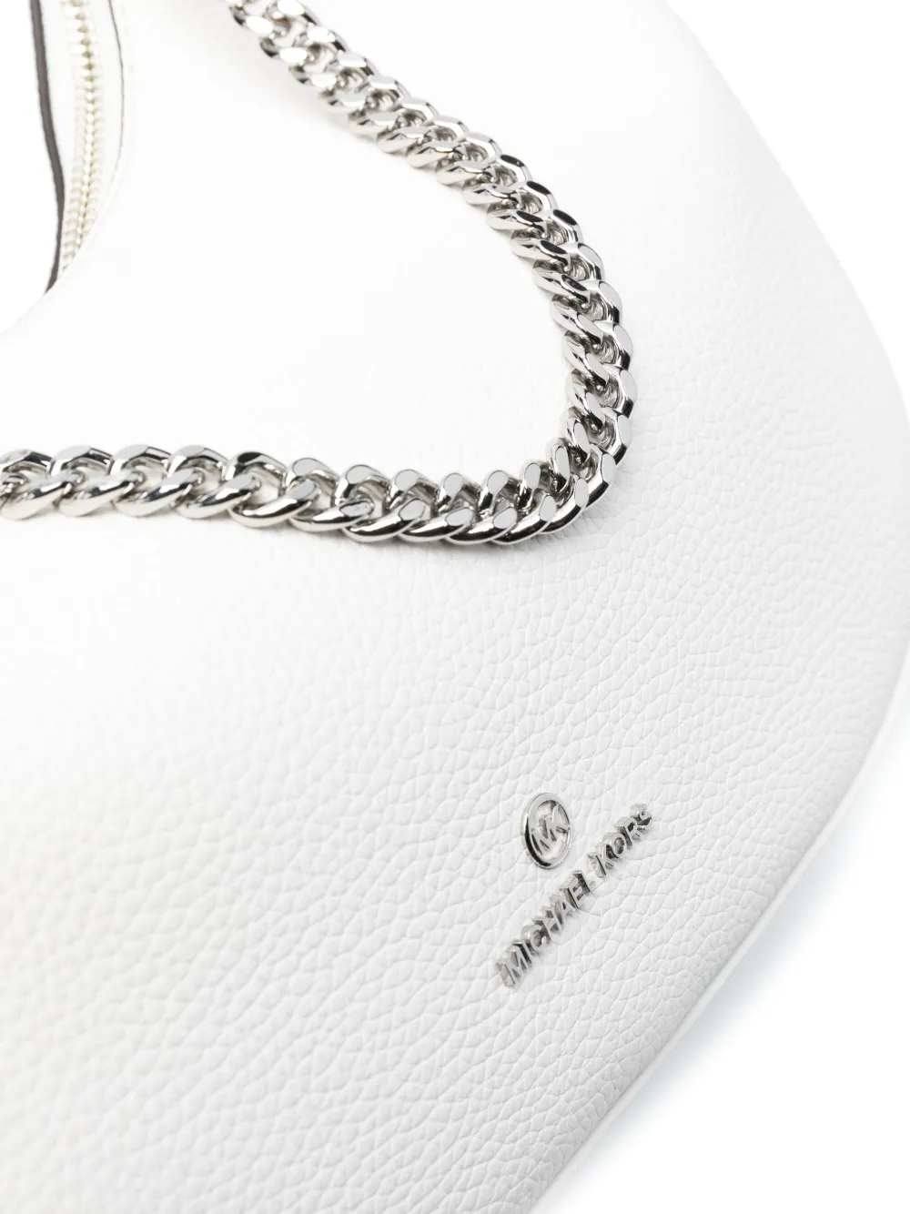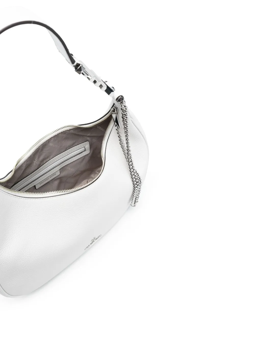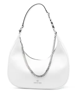 Bianco, pelle di vitello, trama zigrinata, logo in lettere color argento, placca con logo color argento, applicazione interna con logo, chiusura superiore con zip, manico singolo, tracolla a catena, scomparto unico e tasca interna con zip.