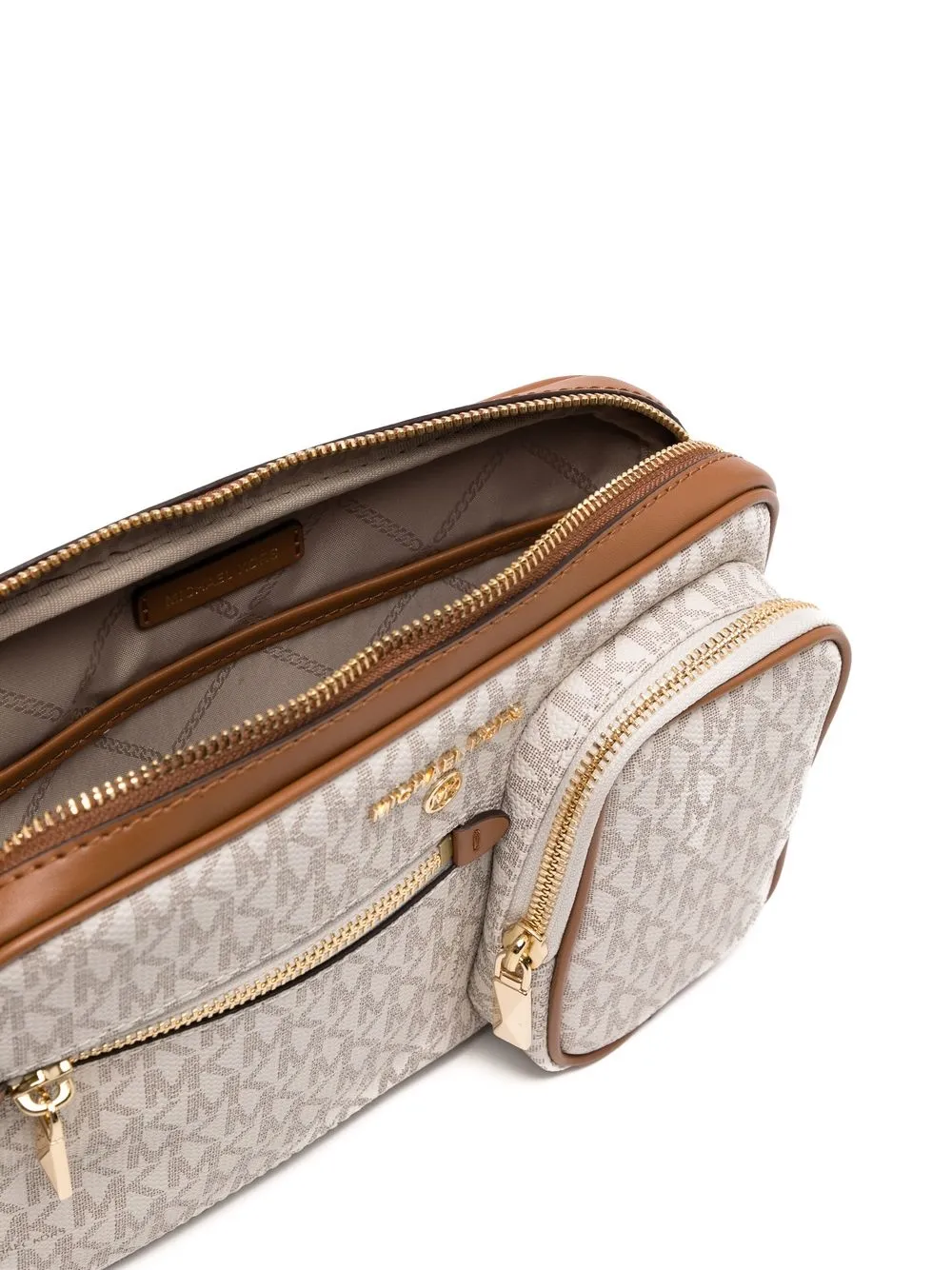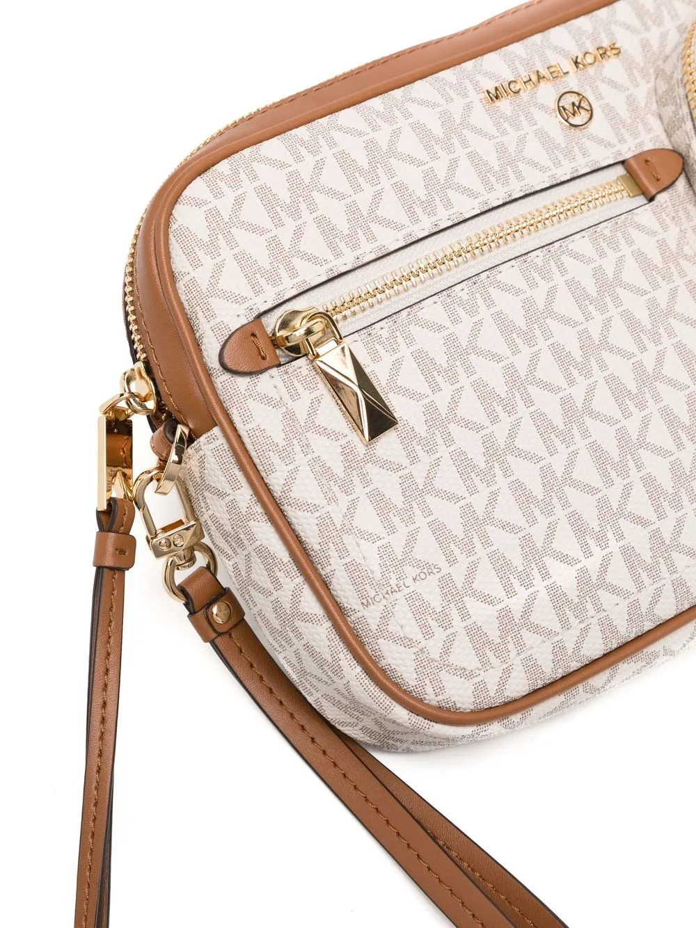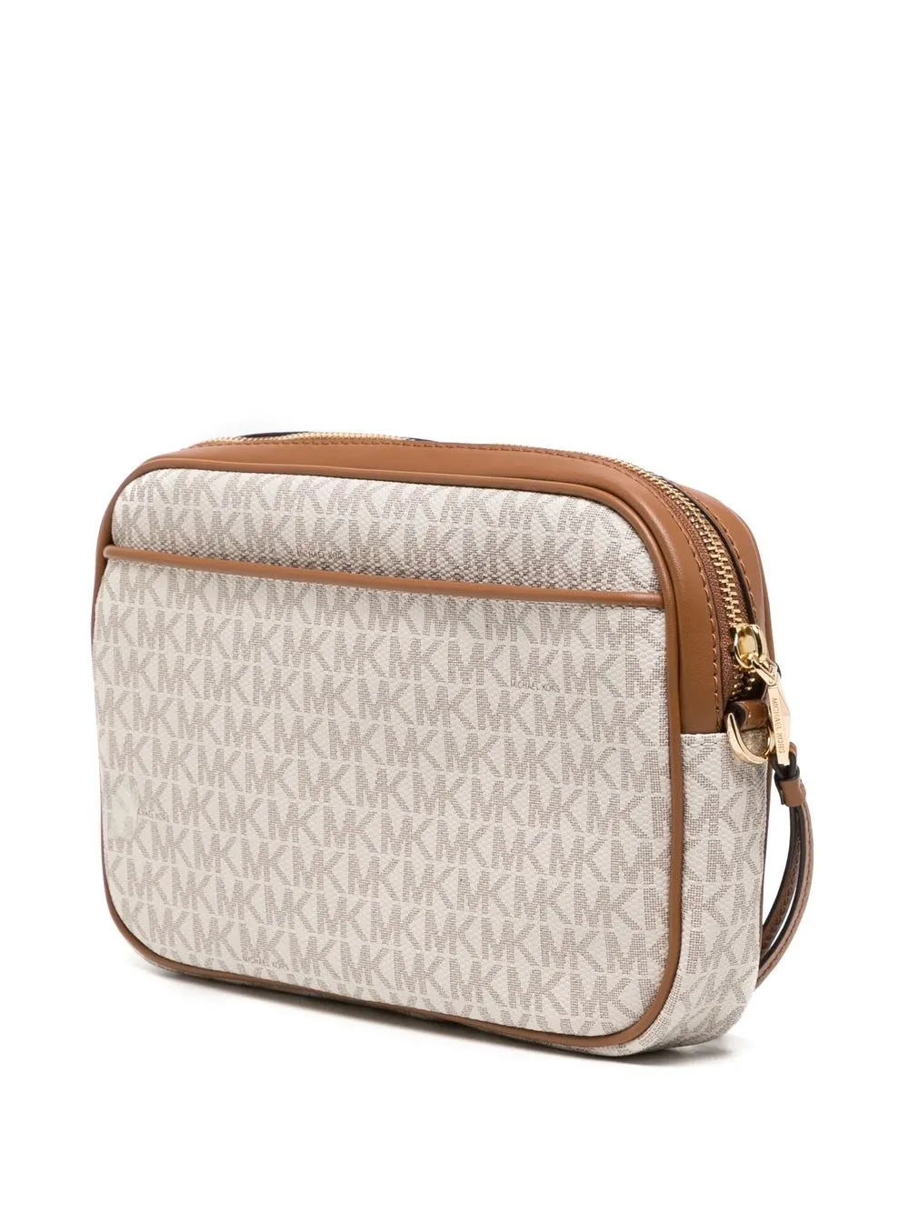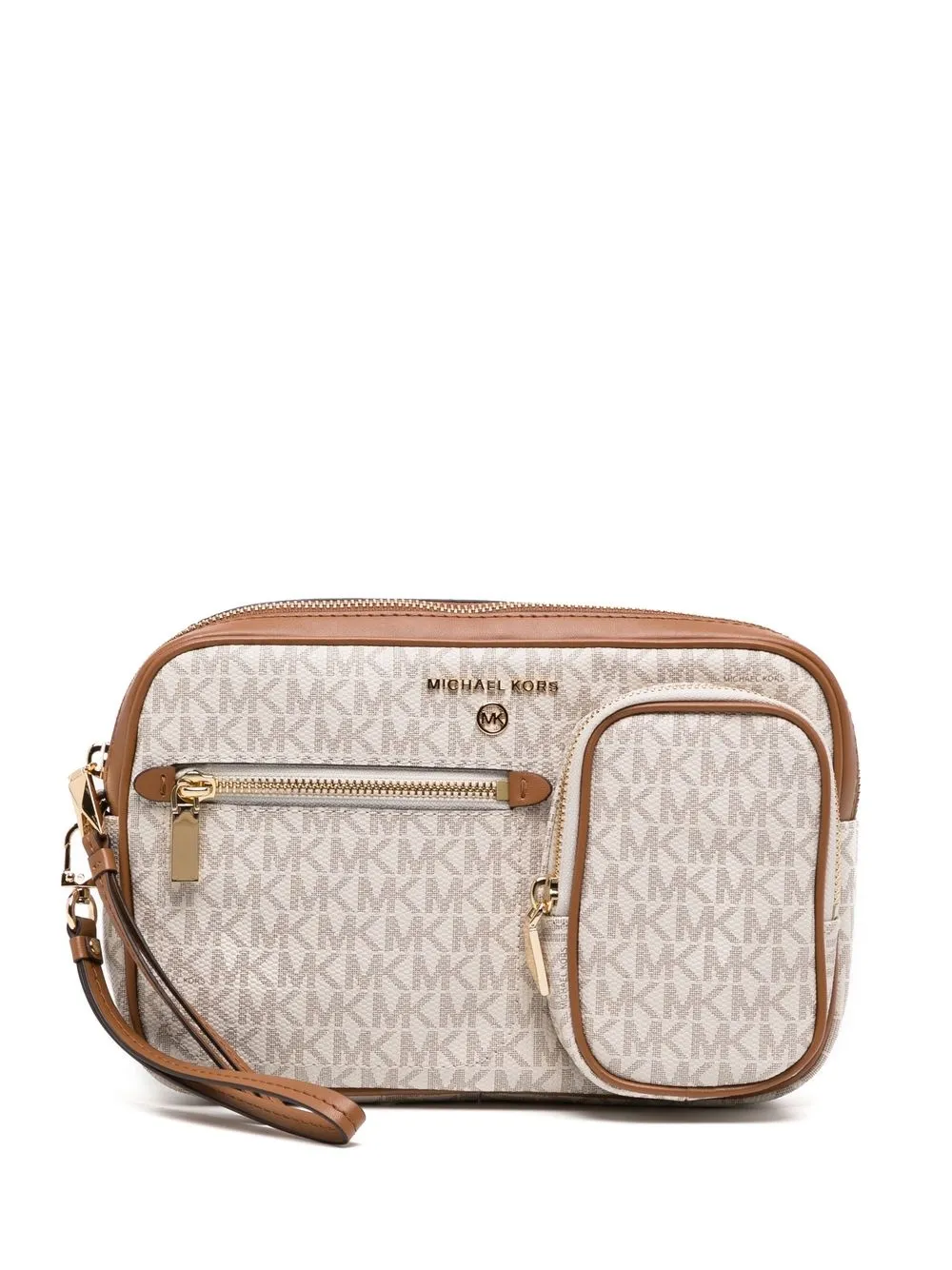 Marrone, pelle, motivo con monogramma, placca con logo color oro, chiusura superiore con zip, cinturino da polso rimovibile e pouch rimovibile.