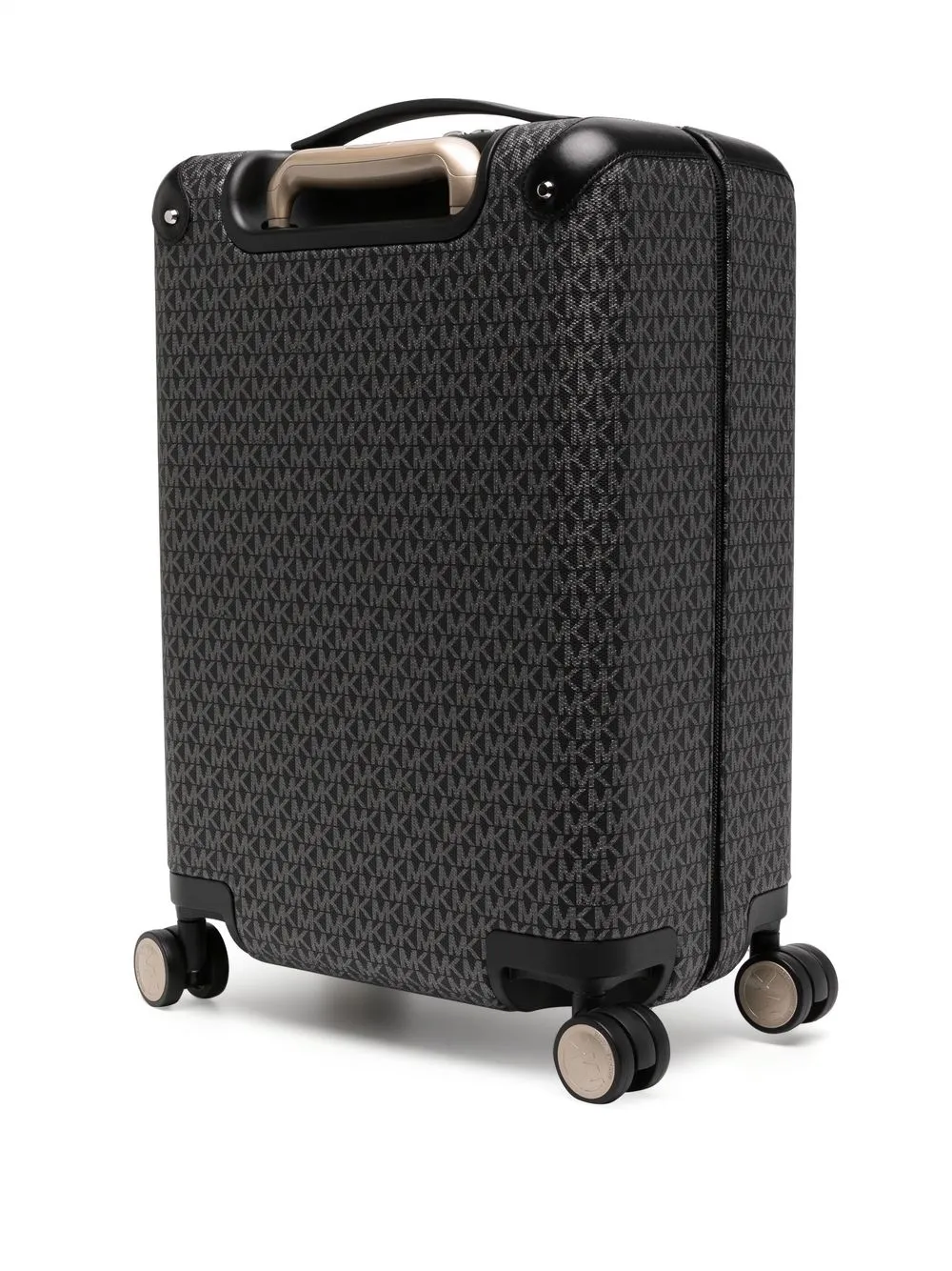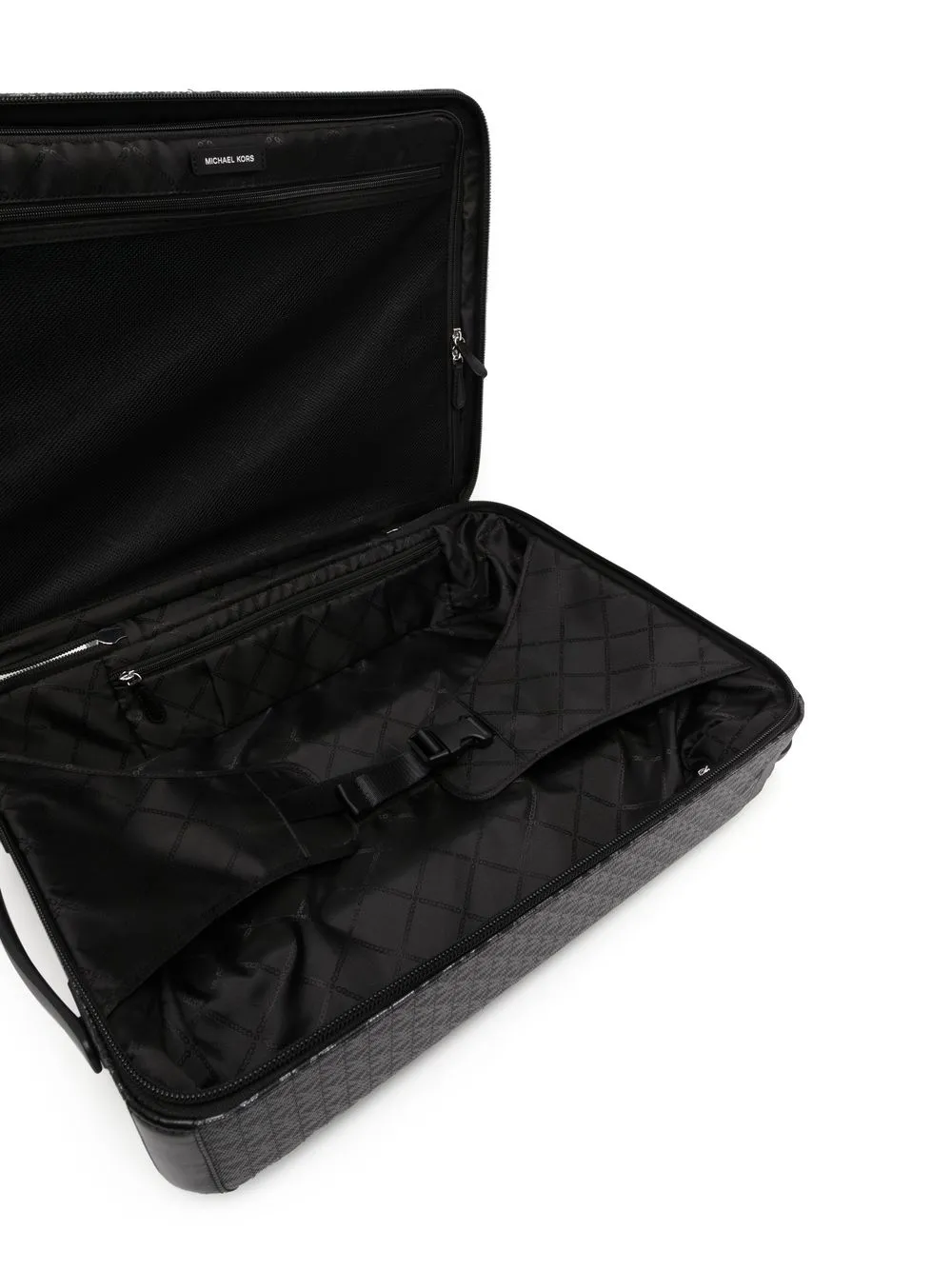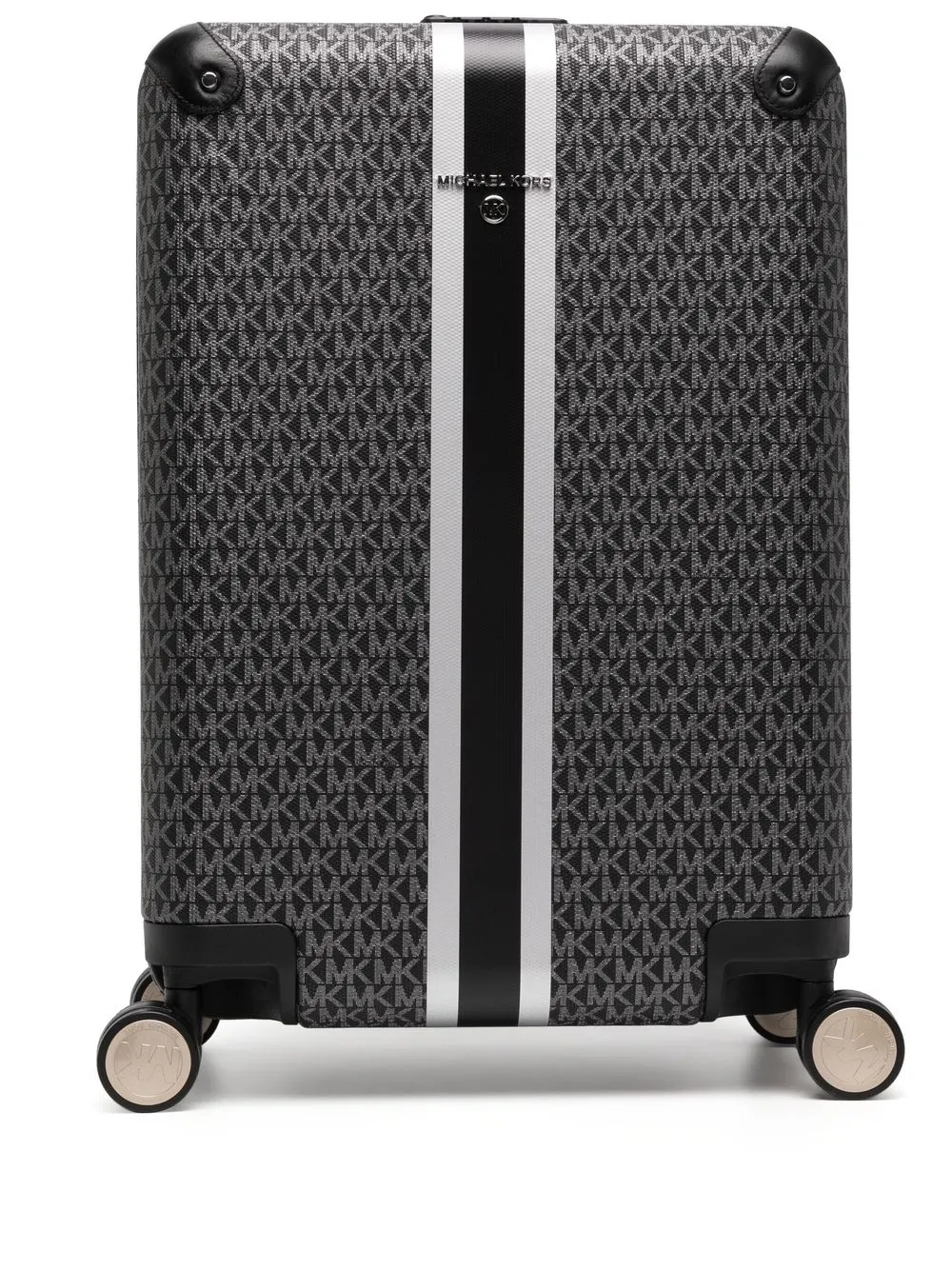 Nero/bianco, pelle di vitello, motivo con monogramma, dettagli color argento, placca con logo, dettaglio a righe e quattro ruote.