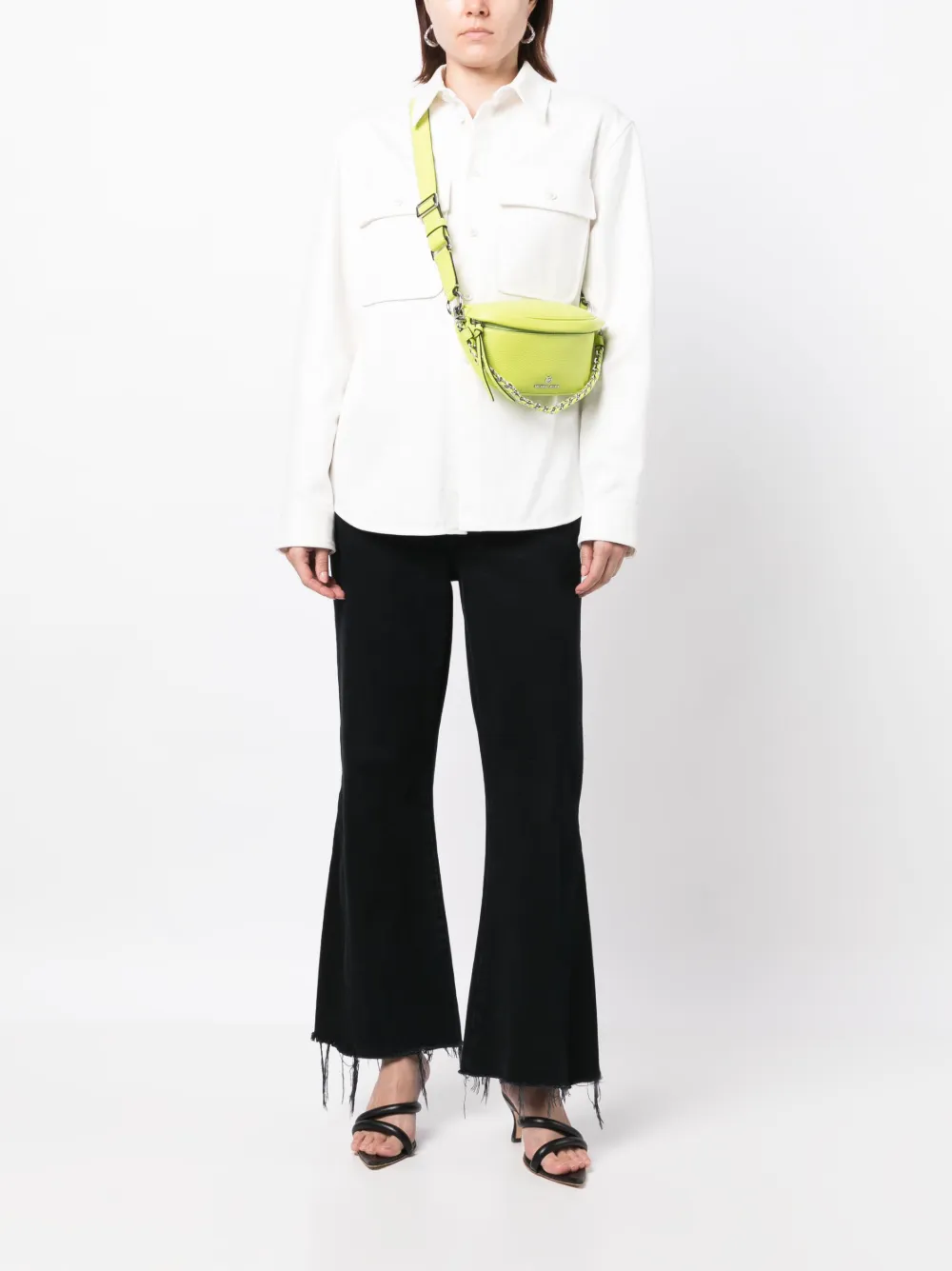 Lime, pelle di vitello, trama zigrinata, logo in lettere color argento, applicazione interna con logo, tracolla rimovibile in pelle con catena, tracolla regolabile con catena, chiusura frontale con zip, scomparto unico e tasca posteriore con zip.
