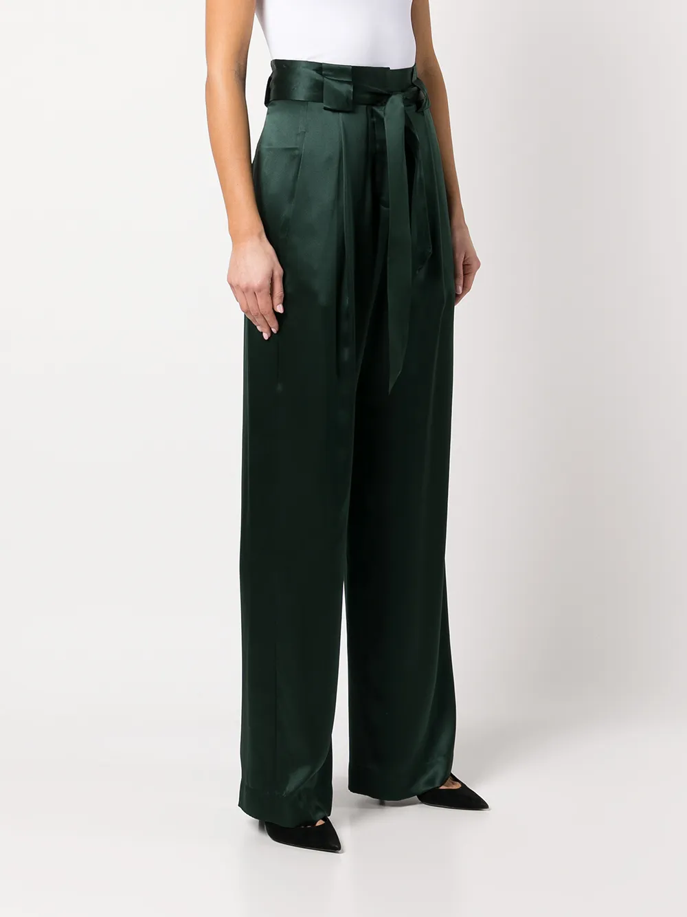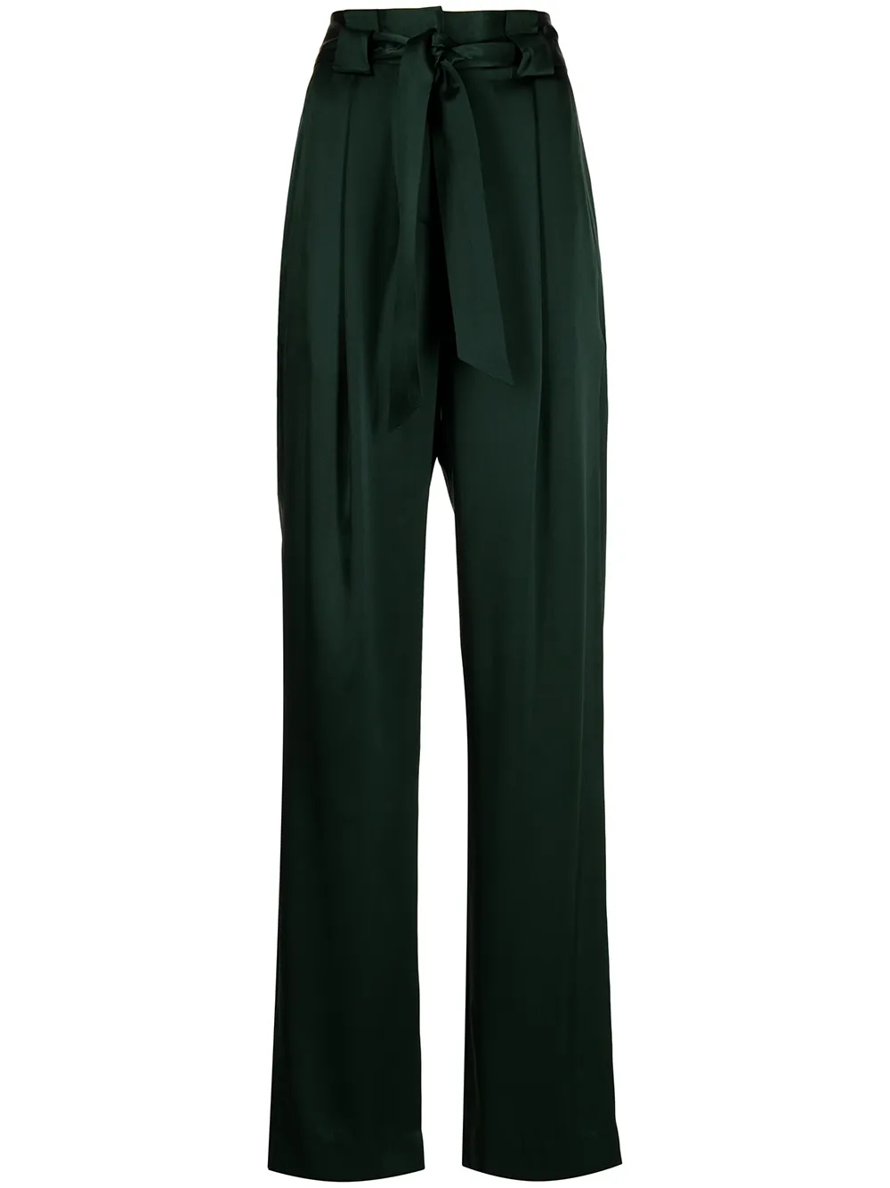 Dettaglio plissettato, modello con cintura, dettaglio drappeggiato, modello a vita alta, passanti, chiusura frontale nascosta con zip, due tasche laterali a soffietto e vestibilità gamba ampia. Materiale: seta.