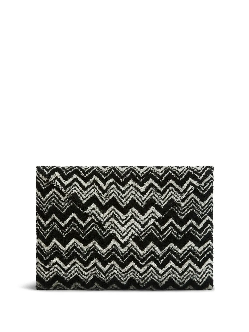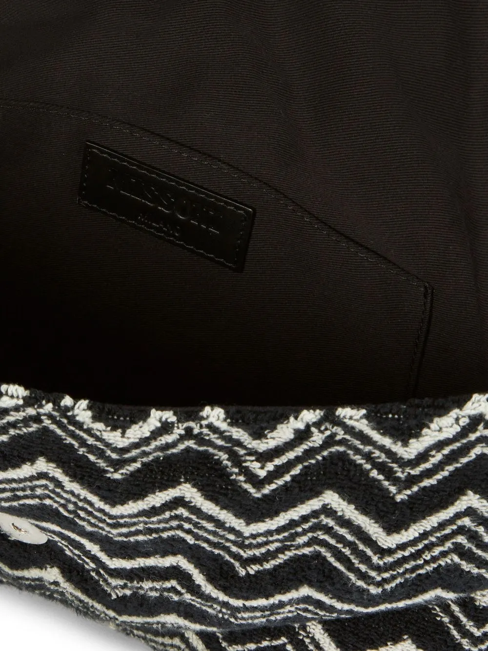 Nero/bianco, cotone/pelle, rifiniture in pelle, effetto spugna, stampa a zig zag, applicazione interna con logo, pattina nella parte superiore e scomparto unico.