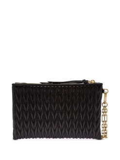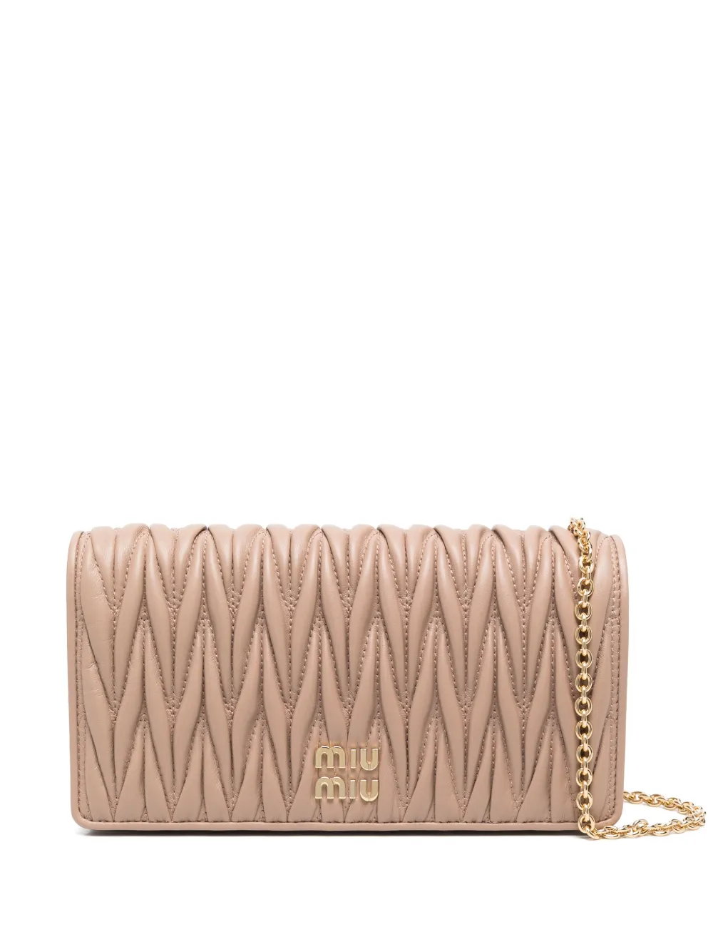 Marrone caramello, pelle di vitello, dettaglio matelassé, placca con logo color oro, tracolla a catena, battente nella parte superiore con chiusura magnetica, scomparto unico, placca con logo interna e fessure portacarte interne.