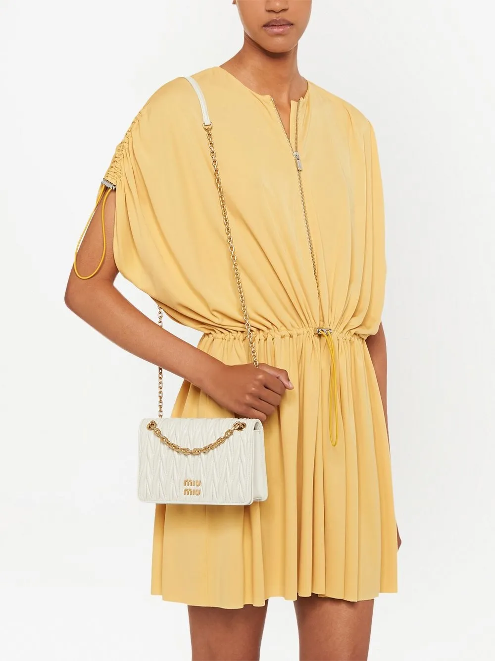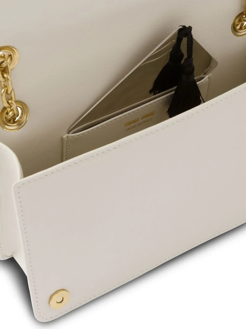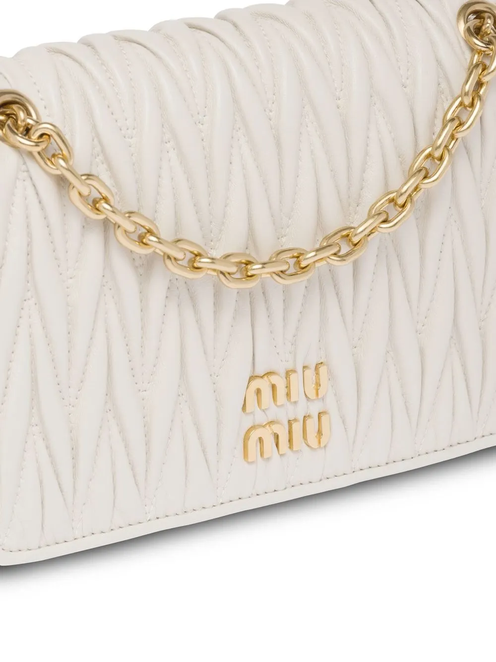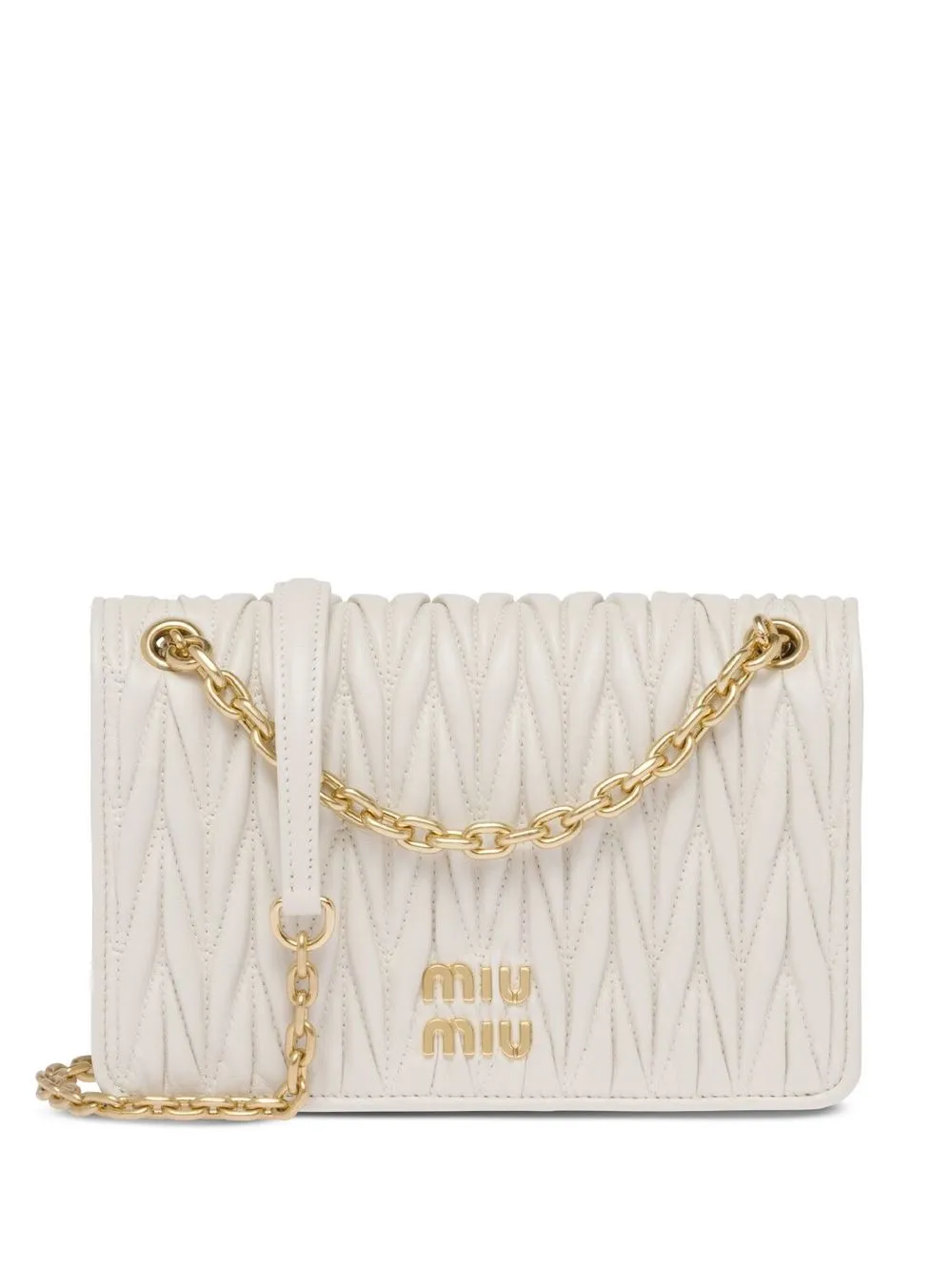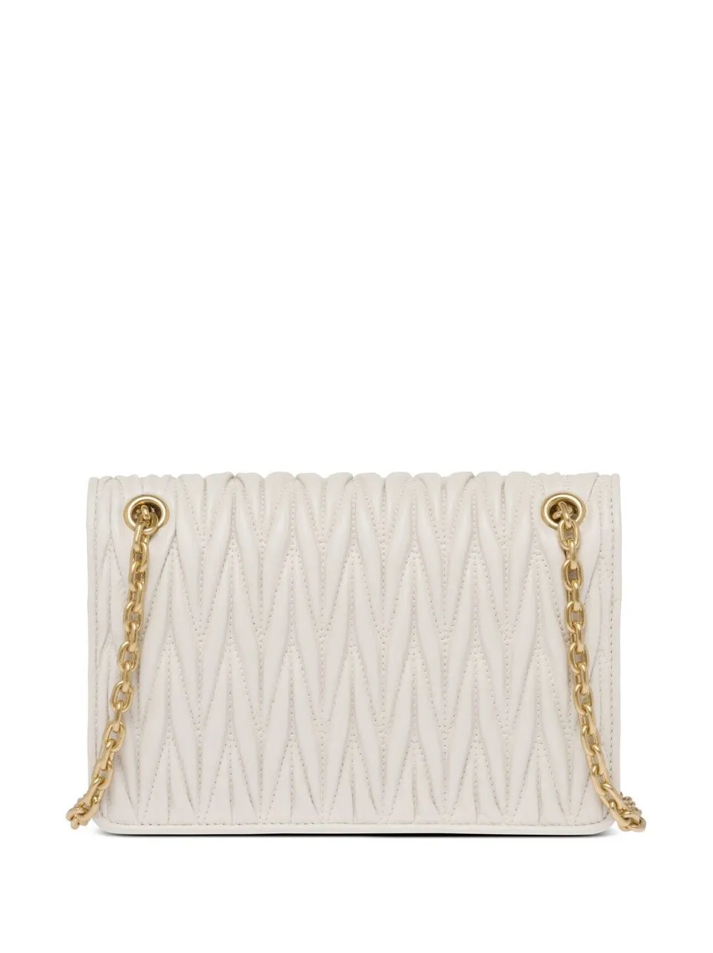 Bianco, nappa, effetto matelassé, logo in lettere color oro, tracolla a catena, dettagli color oro, battente nella parte superiore con chiusura magnetica, tasca interna con zip e placca con logo interna.