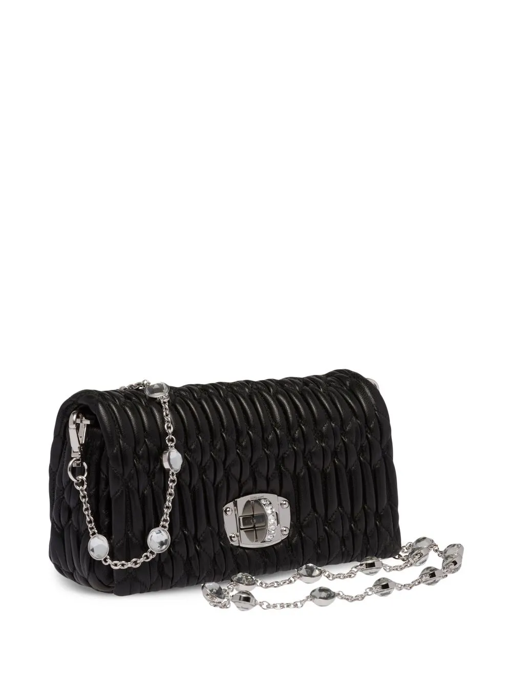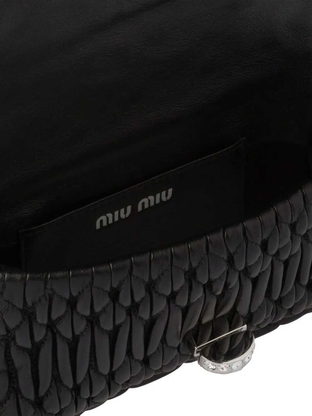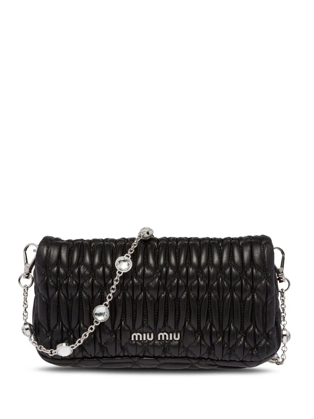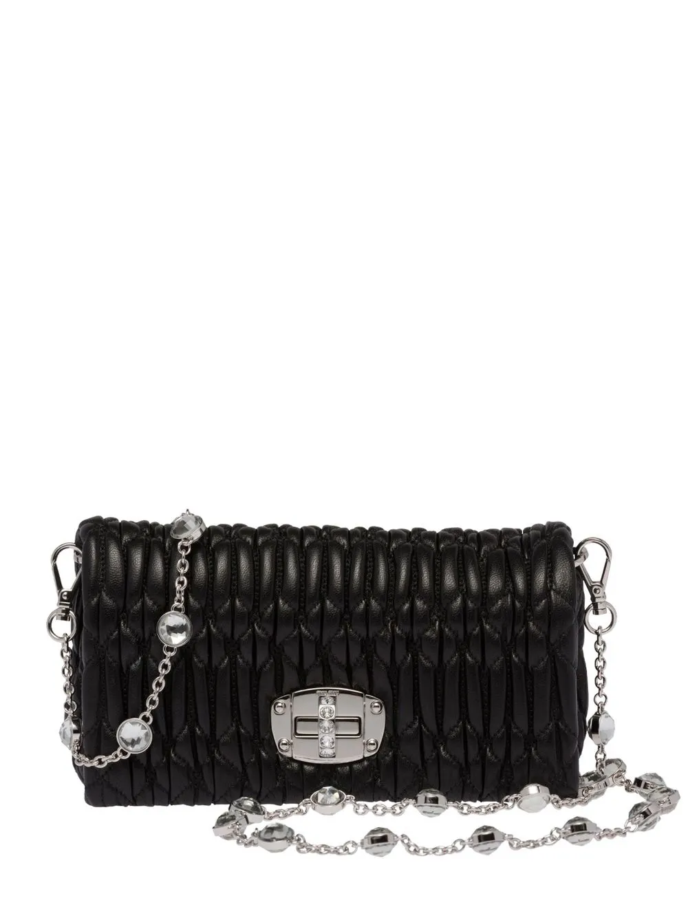 Nero, nappa, effetto matelassé, decorazione in cristalli, fodera in raso, logo in lettere color argento, pattina nella parte superiore, chiusura a girello, scomparto unico e tasca interna a soffietto.