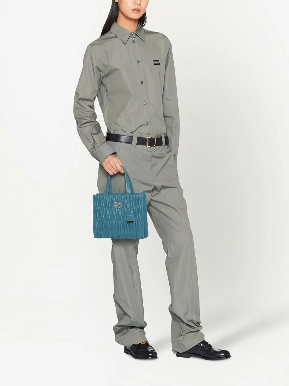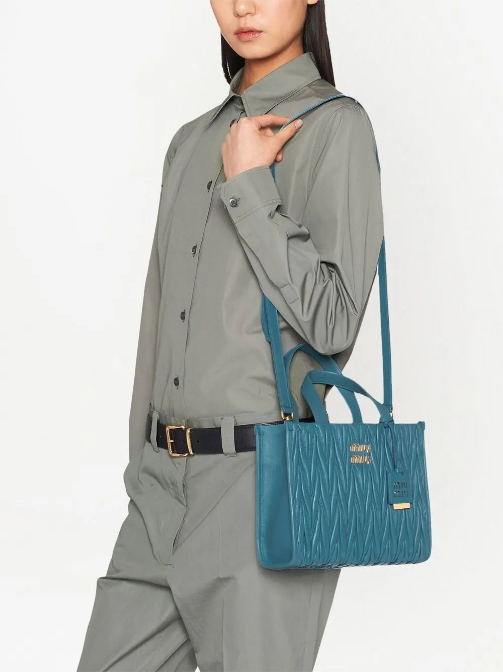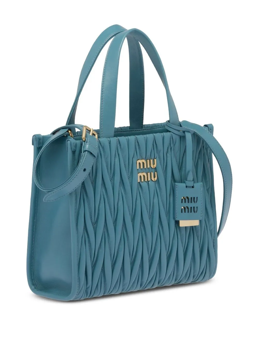 Blu acquamarina, nappa, effetto matelassé, placca con logo color oro, targhetta con logo, tracolla regolabile e rimovibile, due manici, scomparto unico, placca con logo interna e tasca interna con zip.