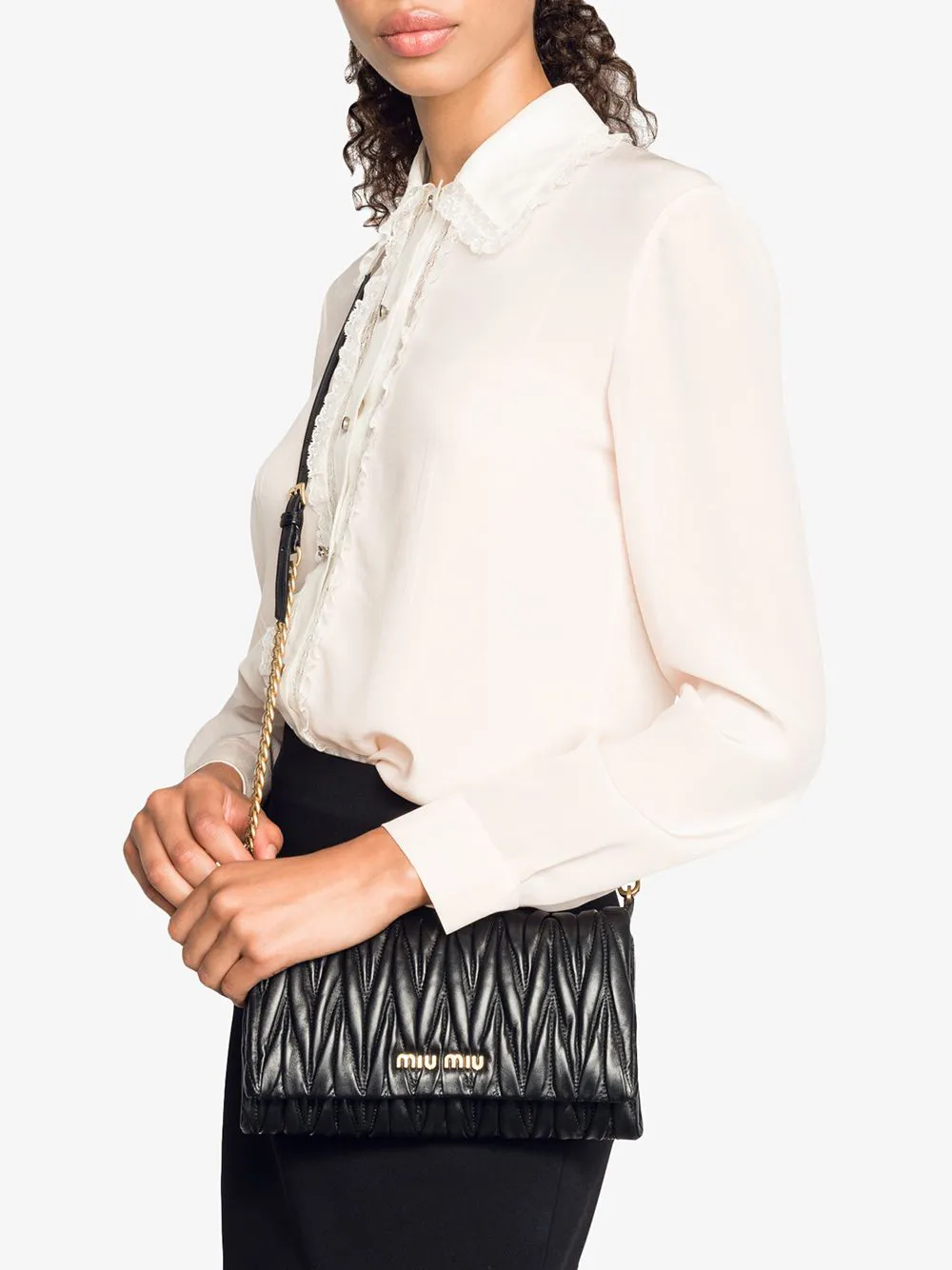 Clutch matelassé mini di colore nero in nappa di Miu Miu. Modello con placca frontale con logo , battente con chiusura magnetica e tasca interna con chiusura a zip.