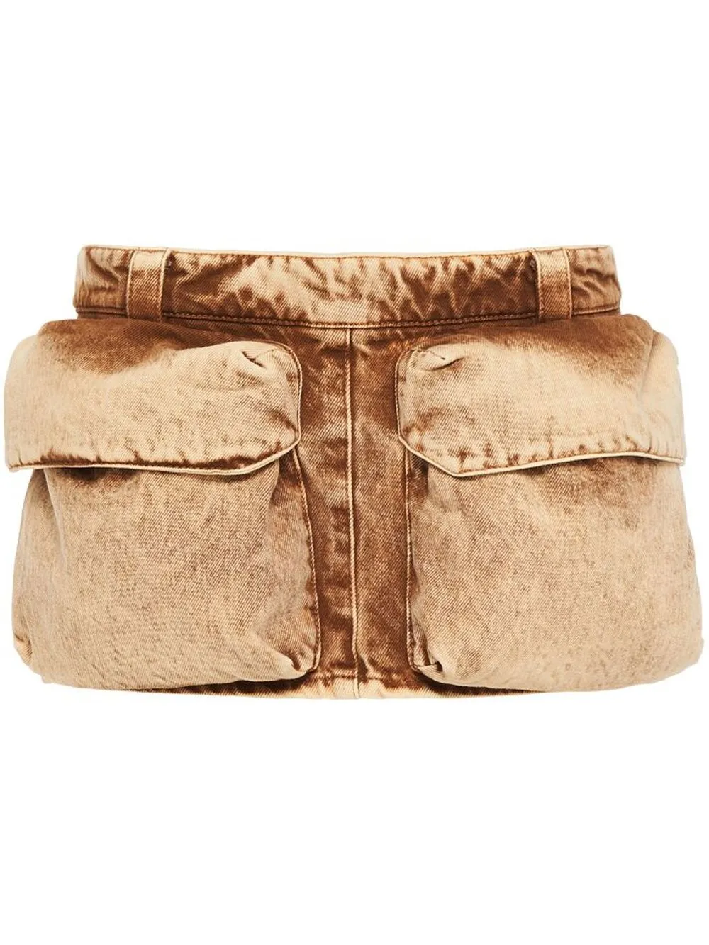 Marrone chiaro, cotone, effetto sbiadito, logo ricamato nella parte posteriore, cuciture tono su tono, vita bassa, passanti, due tasche applicate sul davanti e altezza alla coscia.