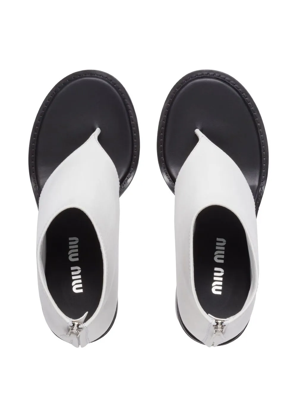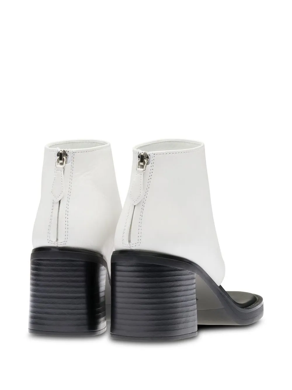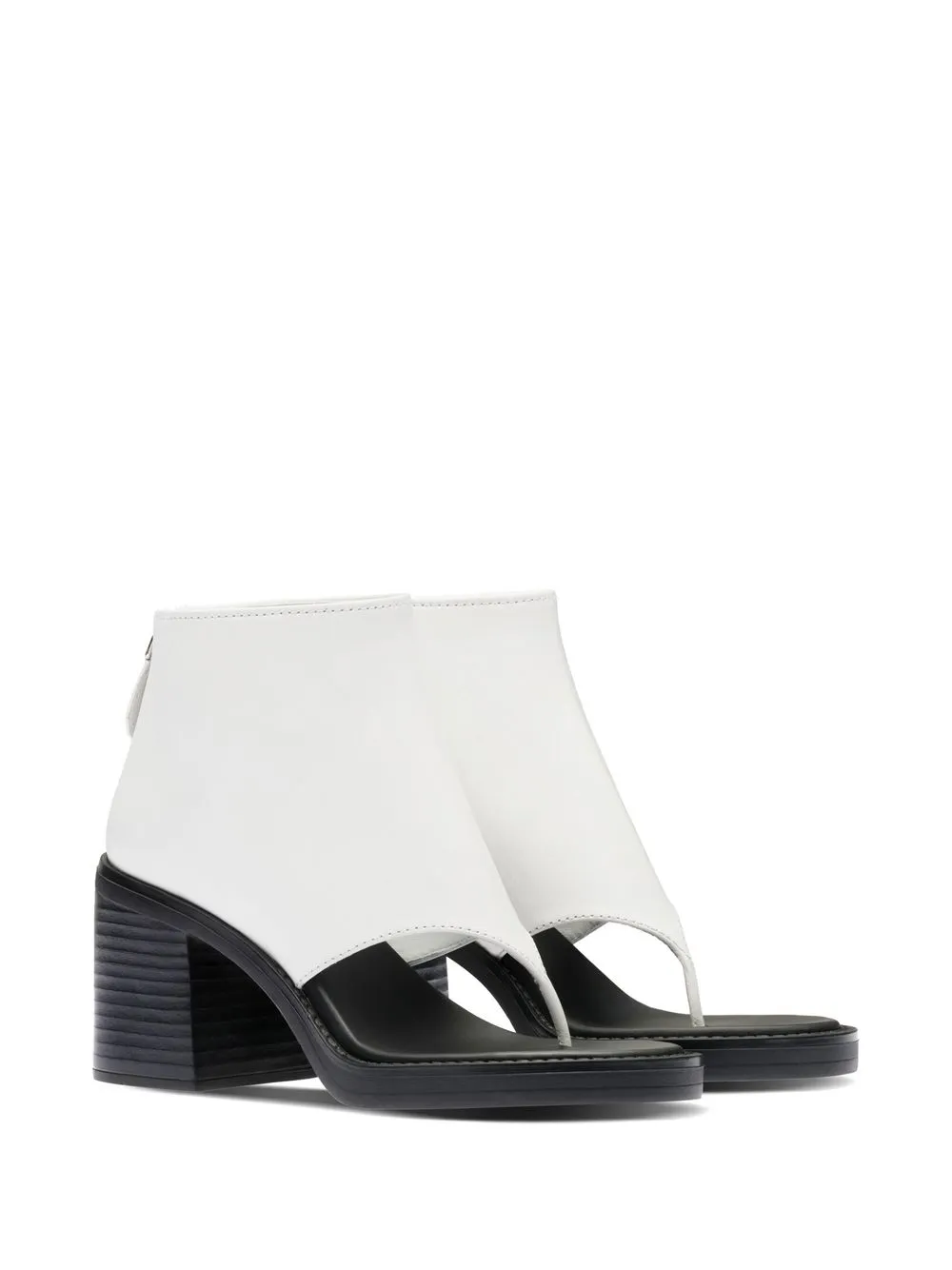 Nero/bianco, cuoio, fascia sull’alluce, punta aperta, altezza alla caviglia, chiusura posteriore con zip corta, soletta con logo e tacco largo medio.