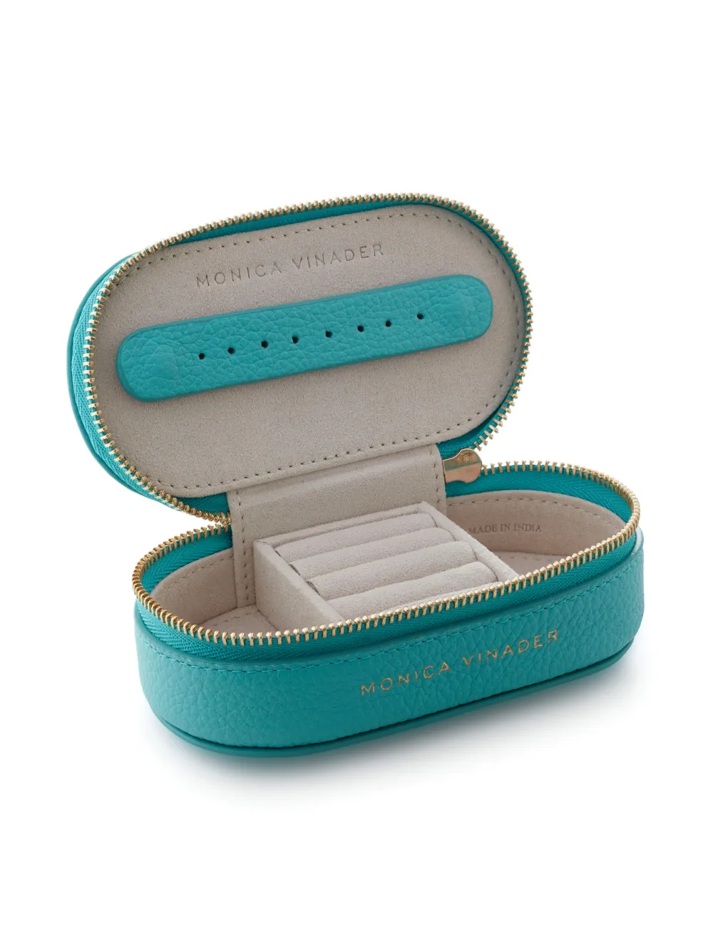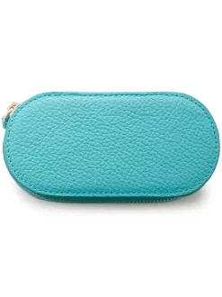Turchese verde-azzurro, cuoio, trama martellata, stampa con logo sul davanti, chiusura con zip a giro e scomparto unico.