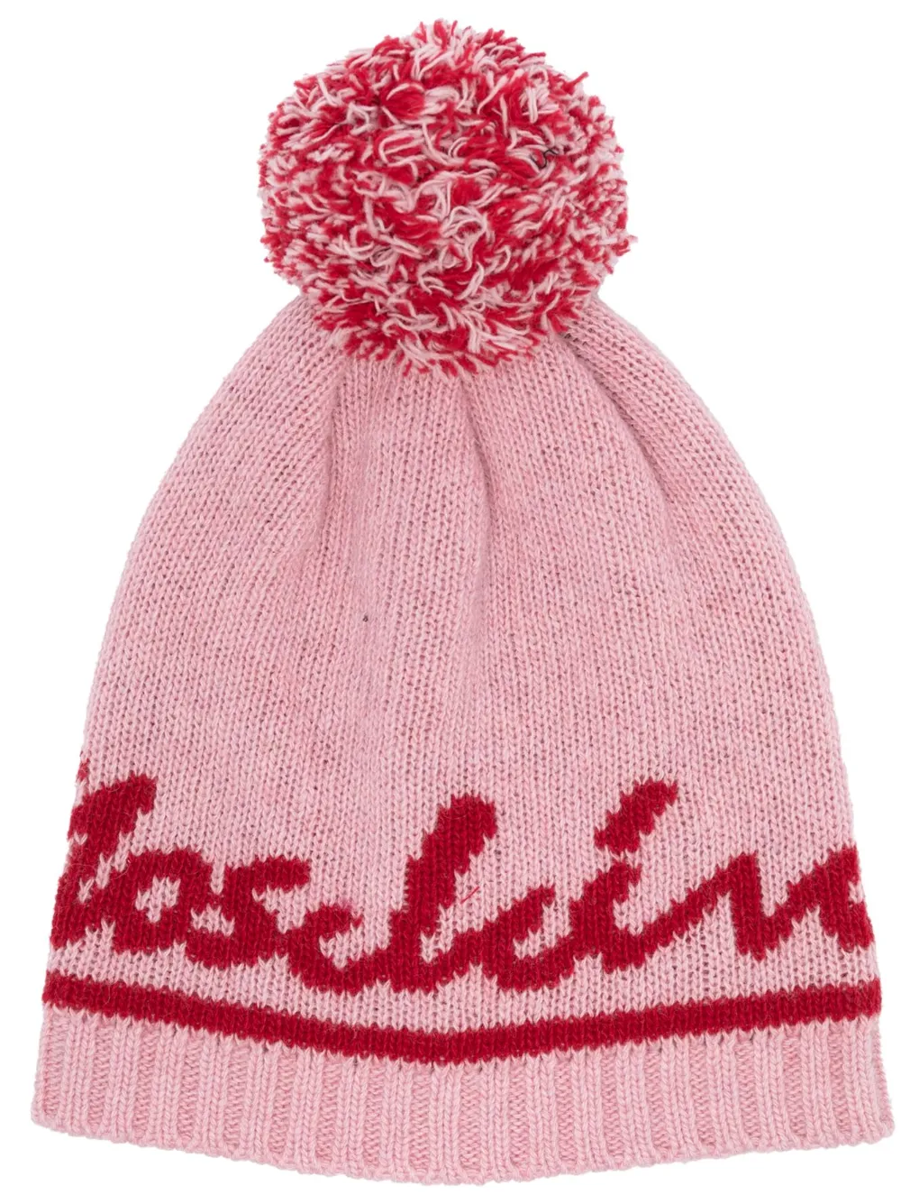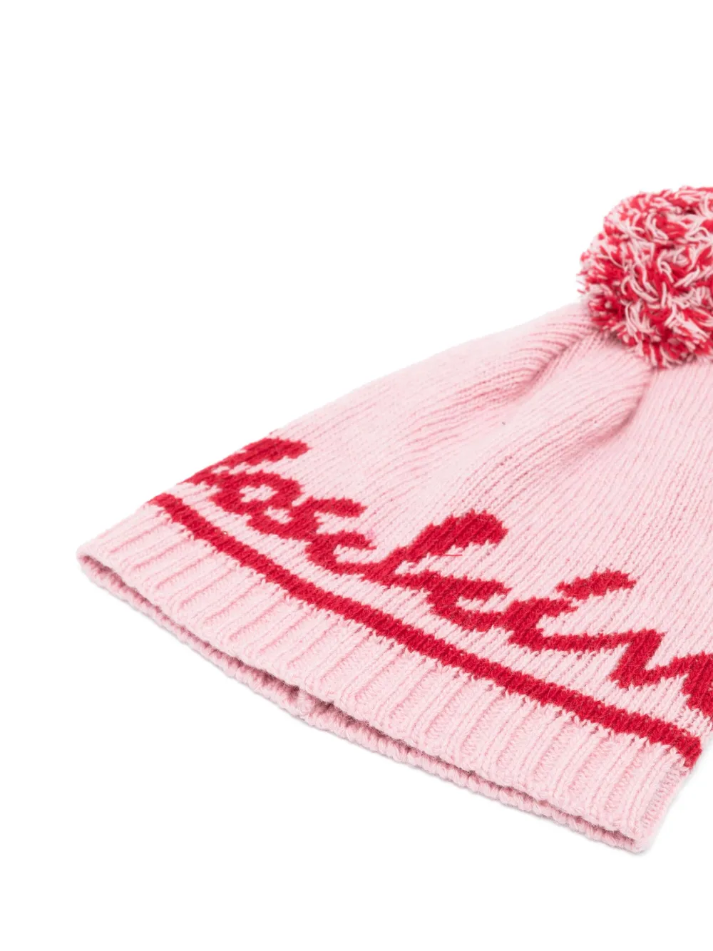 Rosa chiaro, design lavorato a maglia, logo intarsiato, dettaglio con pompon e design pull on.