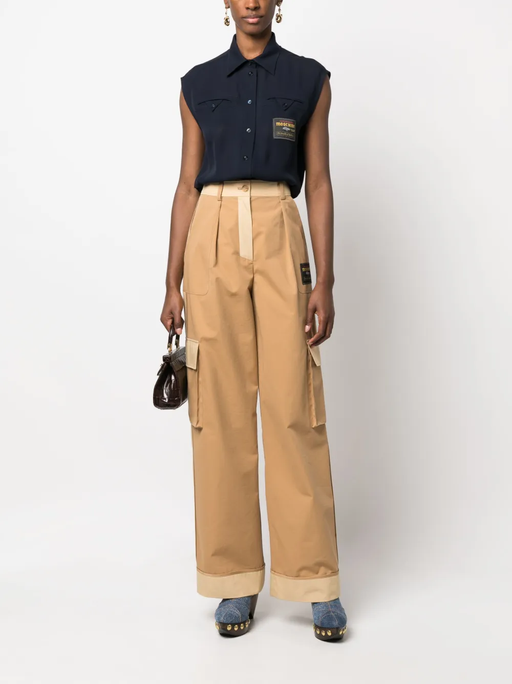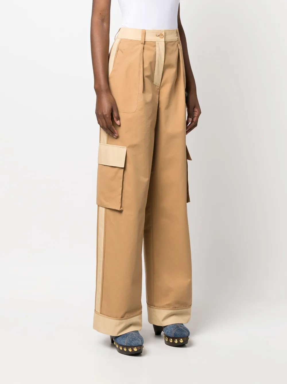 Grigio talpa, beige mandorla, misto cotone, design bicolore, dettaglio plissettato, applicazione laterale con logo, chiusura con bottone e zip nascosta, tasche cargo, due tasche laterali oblique, vita alta e taglio straight.