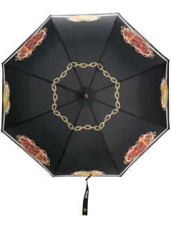 heart-print umbrella from MOSCHINO featuring black/multicolour, heart print, chain-link print, logo-print edge, eight-panel construction, strap closure and press-stud fastening and waterproof.