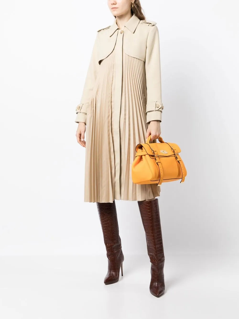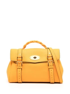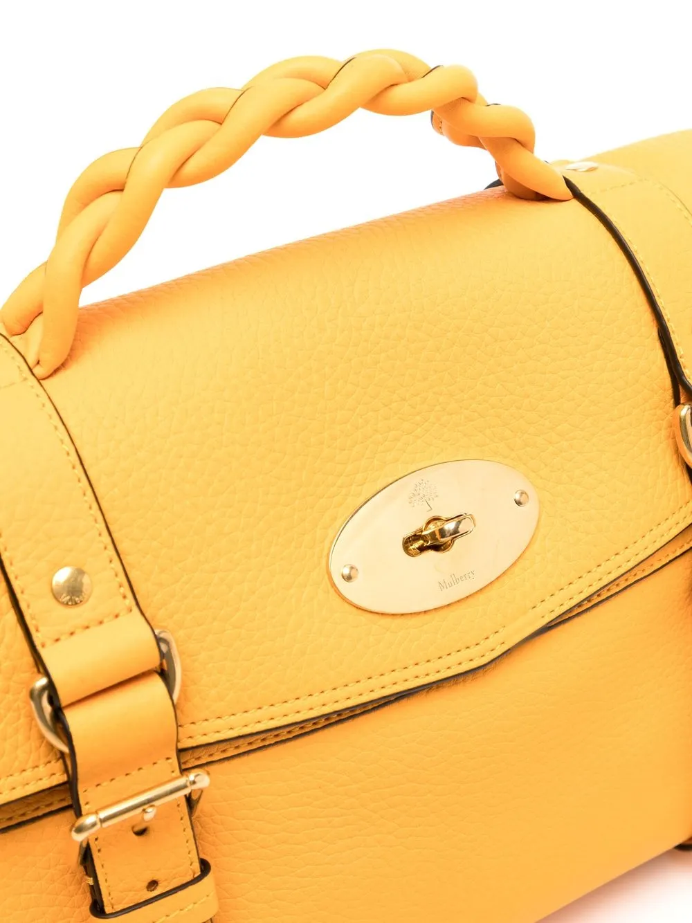 Giallo scuro, pelle di vitello, trama martellata, chiusura con fermaglio, chiusura con doppia fibbia, design con fascia singola, manico intrecciato e scomparto unico.