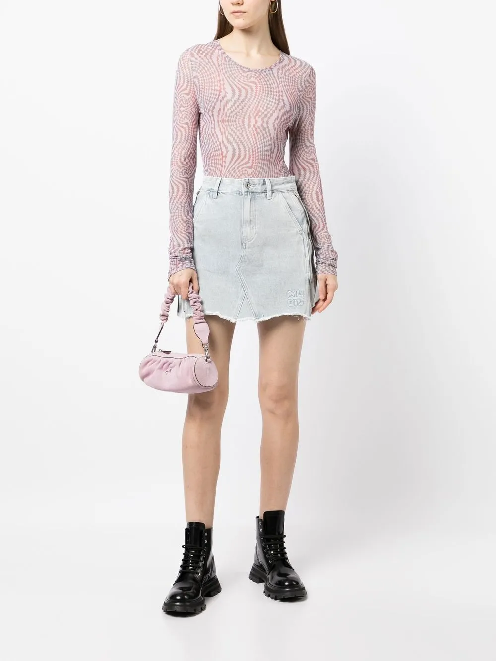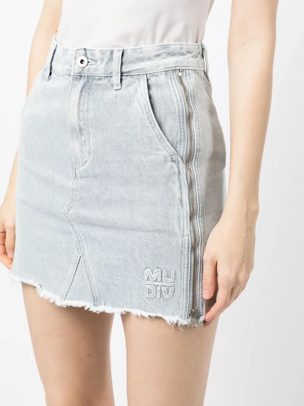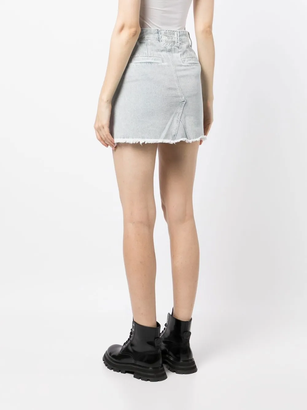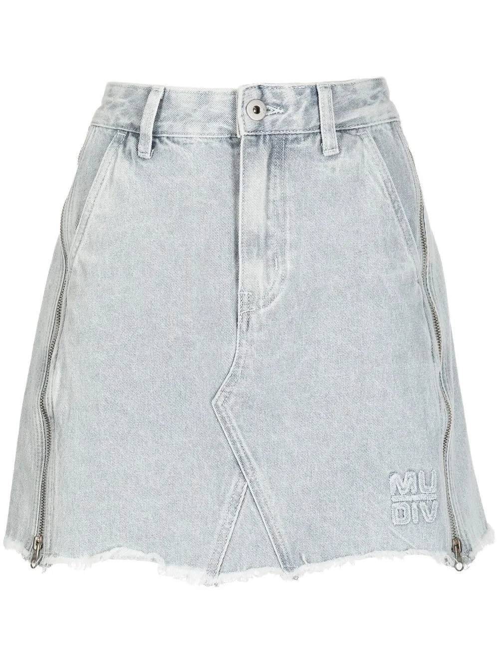 Blu chiaro, misto cotone, applicazione frontale con logo, applicazione posteriore con logo, bordo con frange, passanti, chiusura laterale con zip, chiusura con bottoni, due tasche laterali tonde e due tasche posteriori a filetto.