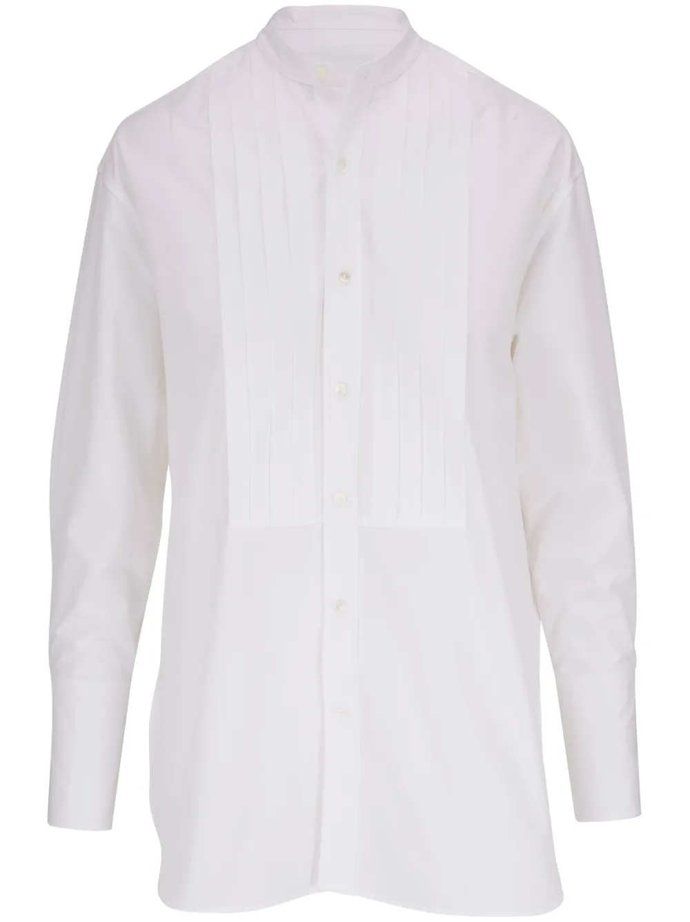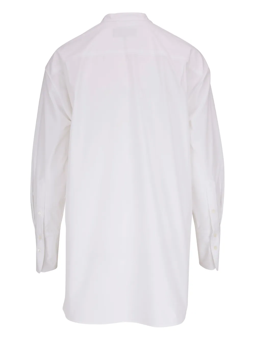 Bianco, cotone, dettaglio a righe, design senza colletto, chiusura frontale con bottoni, maniche lunghe, orli con bottone e orlo curvo.